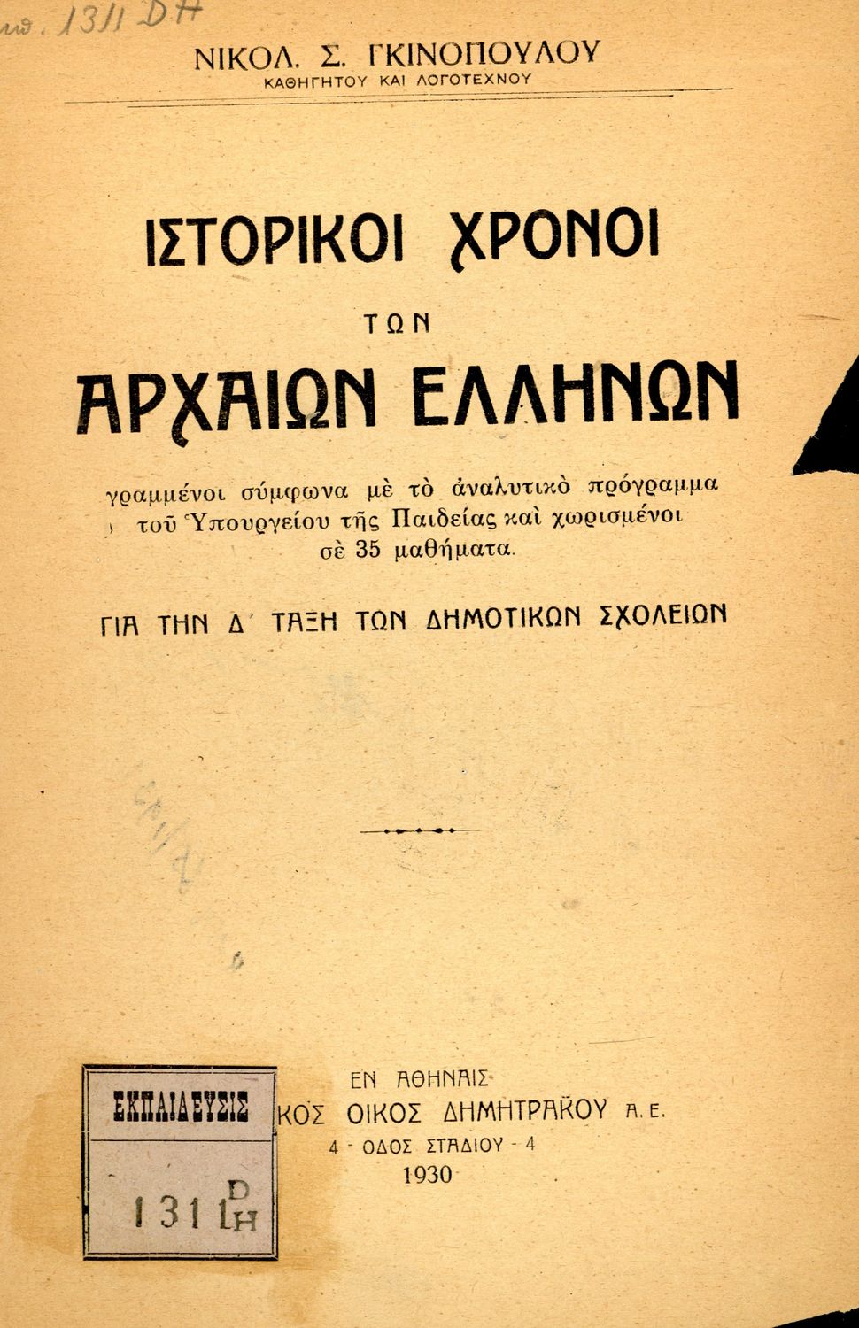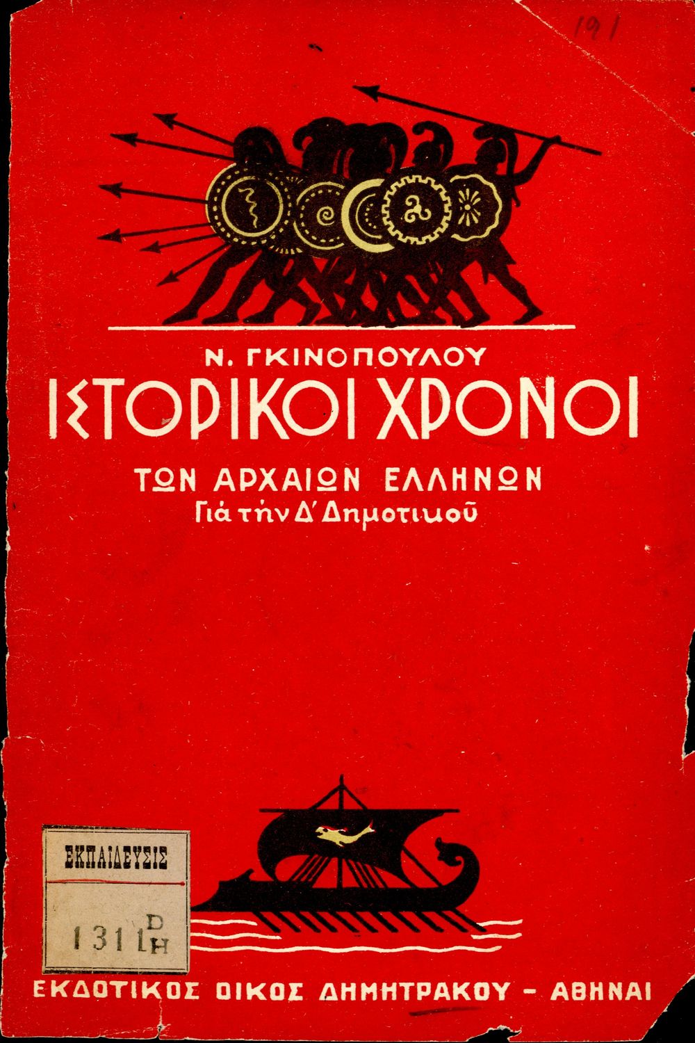 Κωδικός αναγνώρισης: 08-00060 Τίτλος: Ιστορικοί χρόνοι των αρχαίων Ελλήνων για την Δ΄ τάξη των Δημοτικών Σχολείων Συγγραφέας: Νικόλαος Σ. Γκινόπουλος Μέγεθος και υπόστρωμα: Μαθητικό βοήθημα, μαλακό εξώφυλλο, 92 σελίδες. Εξώφυλλο (έγχρωμο), σκίτσα (ασπρόμαυρα). |