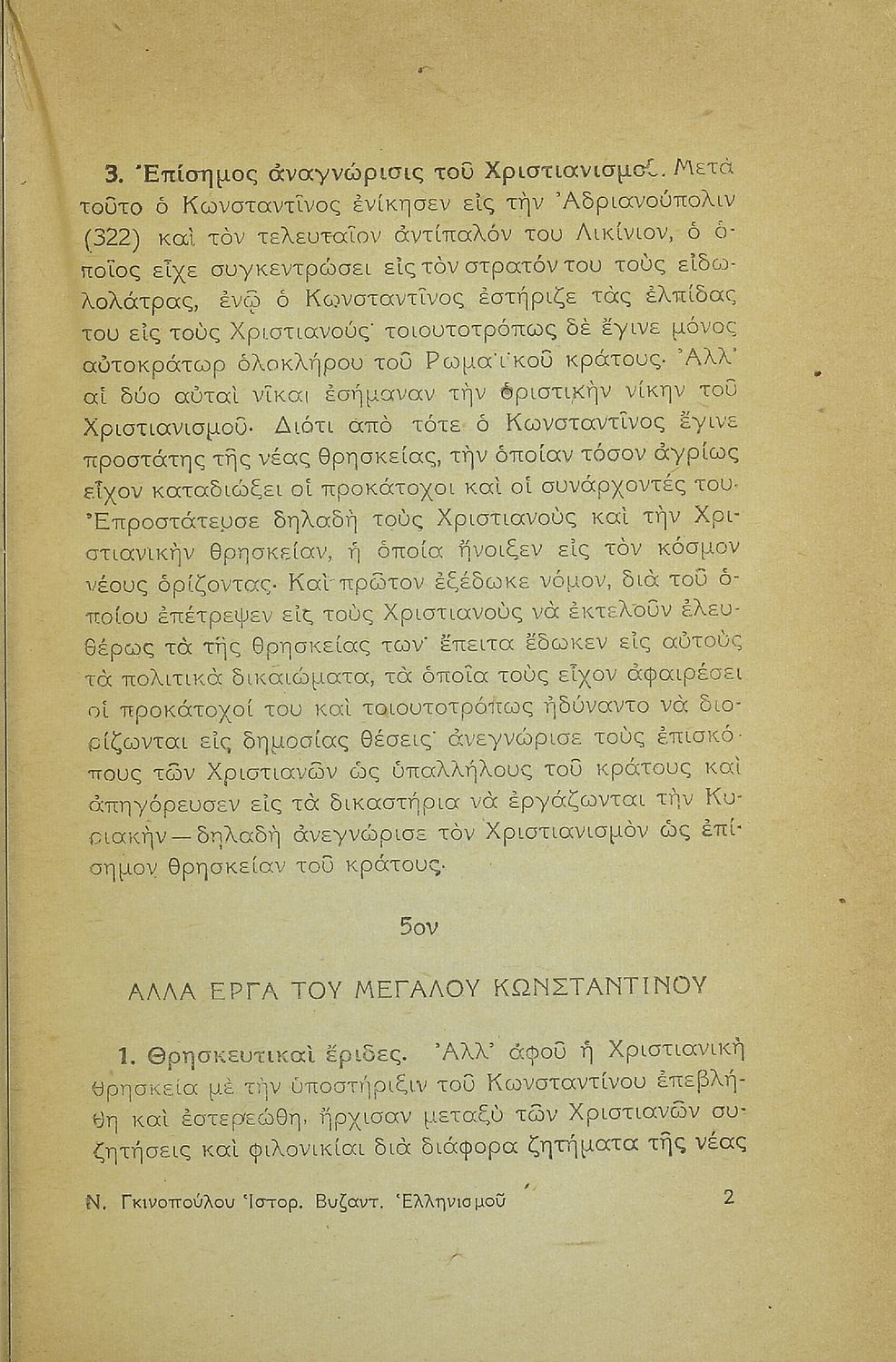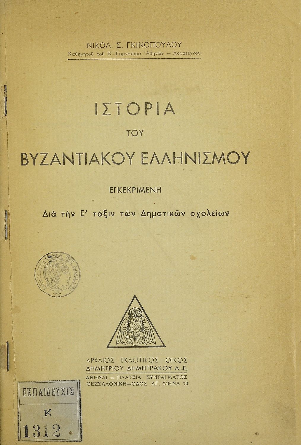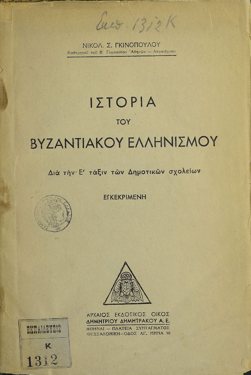Κωδικός αναγνώρισης: 08-00061 Τίτλος: Ιστορία του βυζαντιακού ελληνισμού εγκεκριμένη διά την Ε΄ τάξιν των Δημοτικών Σχολείων Συγγραφέας: Νικόλαος Σ. Γκινόπουλος Μέγεθος και υπόστρωμα: Σχολικό εγχειρίδιο, μαλακό εξώφυλλο, 146 σελίδες. Σκίτσα (ασπρόμαυρα). |