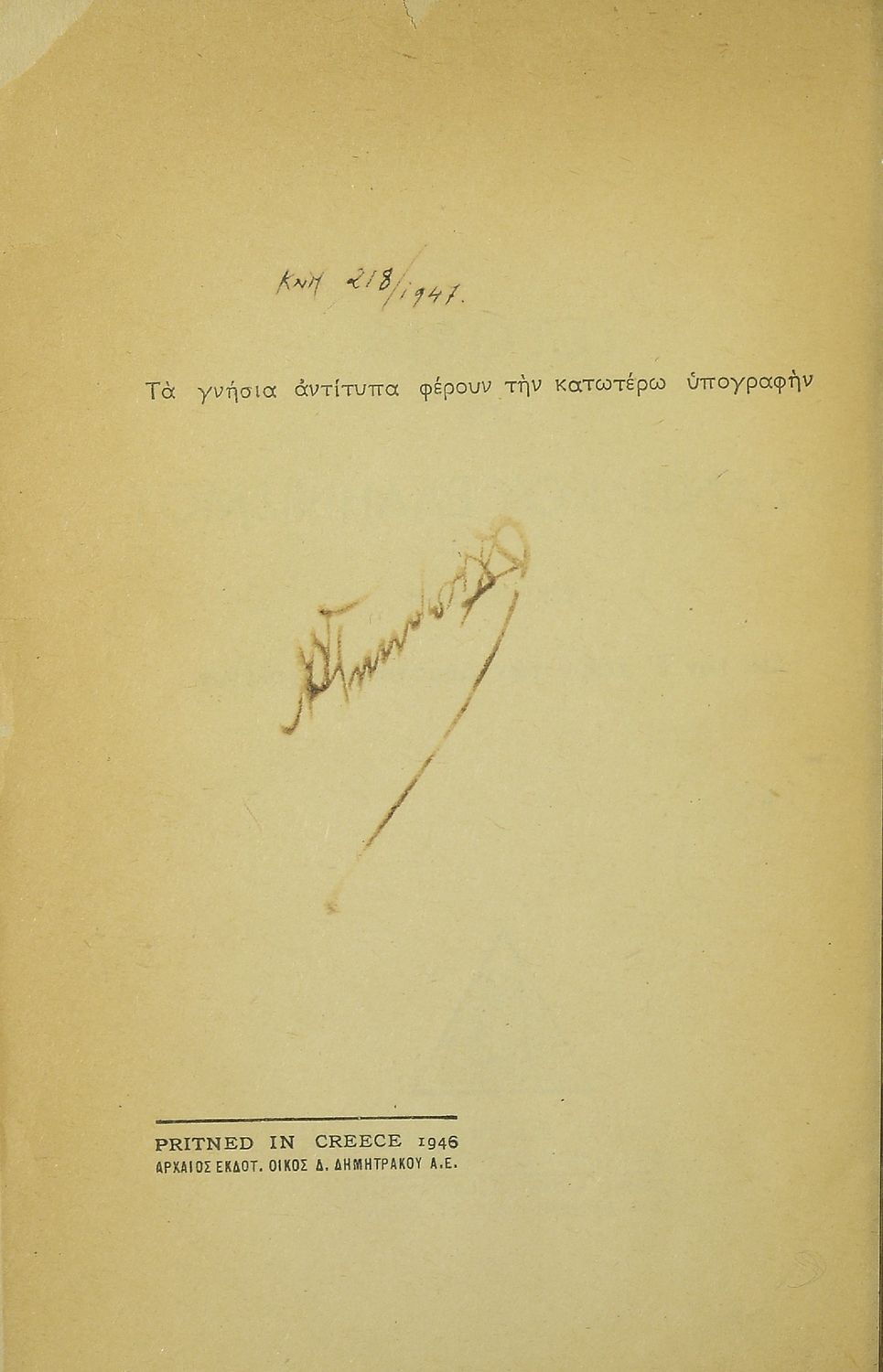 Εκδότης: Δ. Δημητράκος Έτος έκδοσης: 1946 Τόπος έκδοσης: Αθήνα |