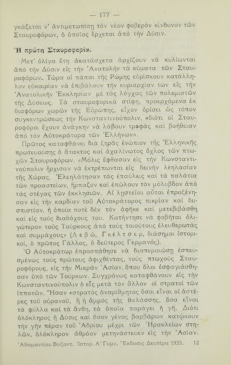 LDR 01433 2200217 4500 035 ## _a08-00067 040 ## _aΕθνική Βιβλιοθήκη της Ελλάδος 041 ## _ael 100 ## _aΑδαμάντιος Ι. Αδαμαντίου 110 ## _a67 245 0# _aΒυζαντινή και ευρωπαϊκή ιστορία εγκεκριμένη δια την Δ΄ τάξιν των Γυμνασίων με πολλάς εικόνας και χάρτας 250 ## _a2η Έκδοση 260 ## _aΑθήνα _bΔημητράκος _c1933 300 ## _a268 _bΣκίτσα (ασπρόμαυρα), Χάρτες (ασπρόμαυροι) 520 ## _aΣχολικό εγχειρίδιο Ιστορίας. Δ΄ Γυμνασίου που καλύπτει την περίοδο από την ενθρόνιση του Ιουστινιανού μέχρι και την περίοδο της Φραγκοκρατίας και την άλωση της Κωνσταντινούπολης. Σκοπό έχει να καλλιεργήσει την εθνική συνείδηση. 521 ## _aΔ' Γυμνασίου 522 ## _aΕλλάδα 546 ## _aΚαθαρεύουσα 563 ## _aΣκληρό Εξώφυλλο 583 ## _a41795/ 3-8-1933 _c1933 650 #4 _aΆλωση _aΊσαυροι _aΚομνηνοί _aΜ Κωνσταντίνος _aΠαλαιολόγοι _aΣταυροφορίες _aΤούρκοι _aΦραγκοκρατία