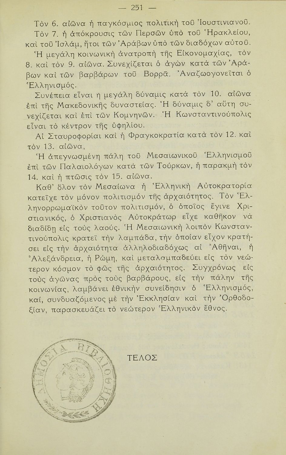 Σχολικό εγχειρίδιο Ιστορίας. Δ΄ Γυμνασίου που καλύπτει την περίοδο από την ενθρόνιση του Ιουστινιανού μέχρι και την περίοδο της Φραγκοκρατίας και την άλωση της Κωνσταντινούπολης. Σκοπό έχει να καλλιεργήσει την εθνική συνείδηση.