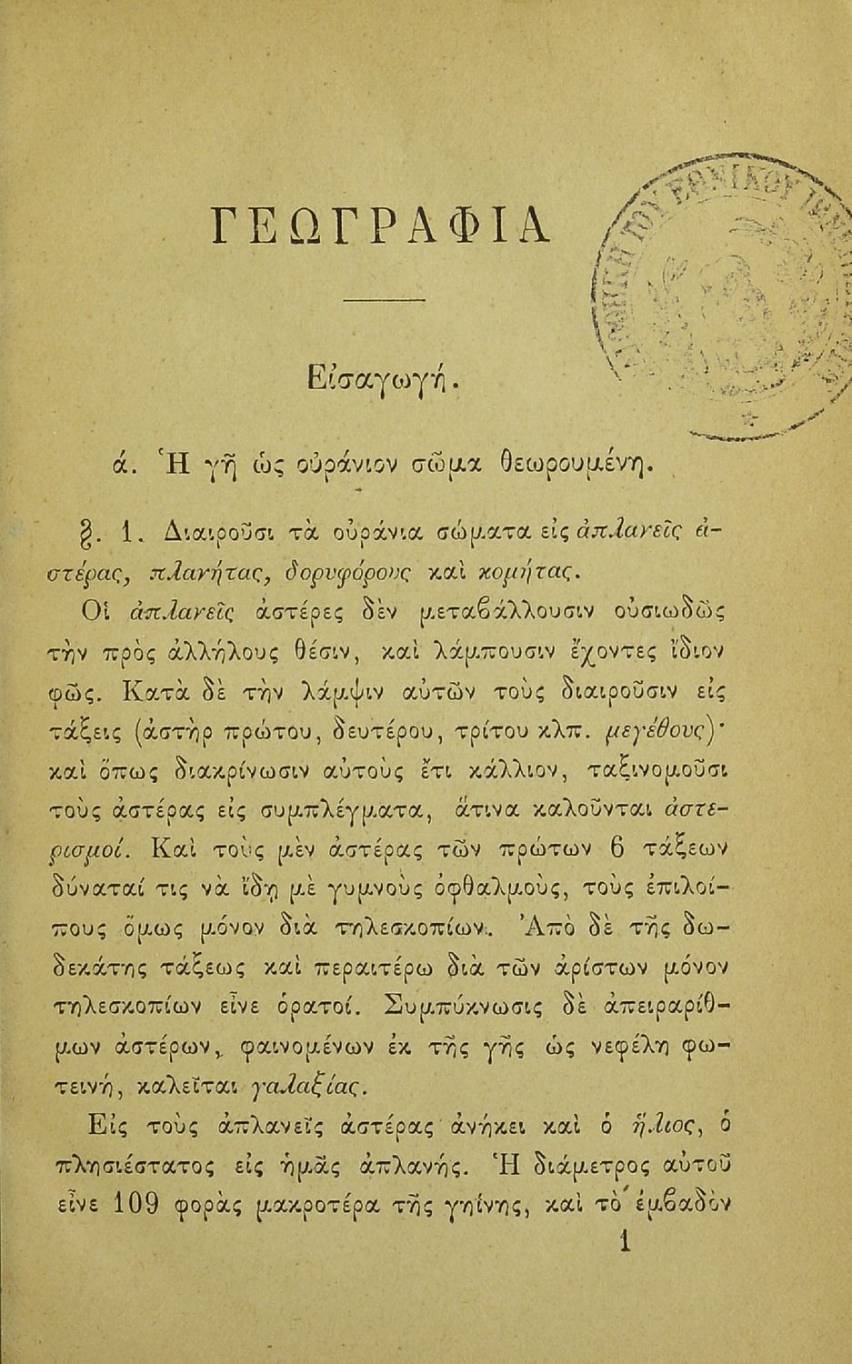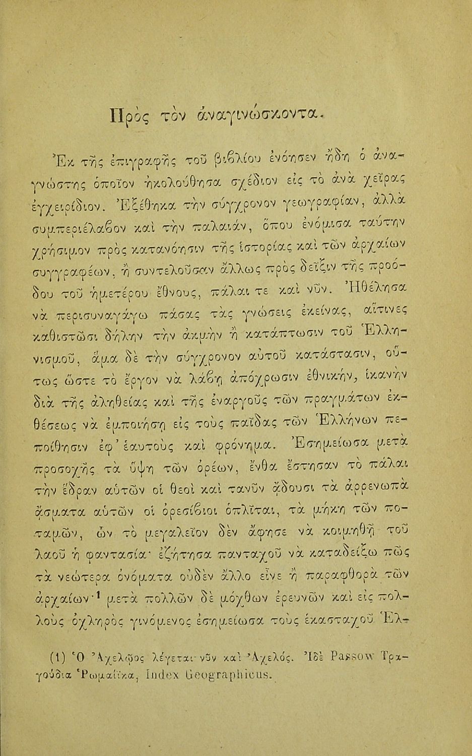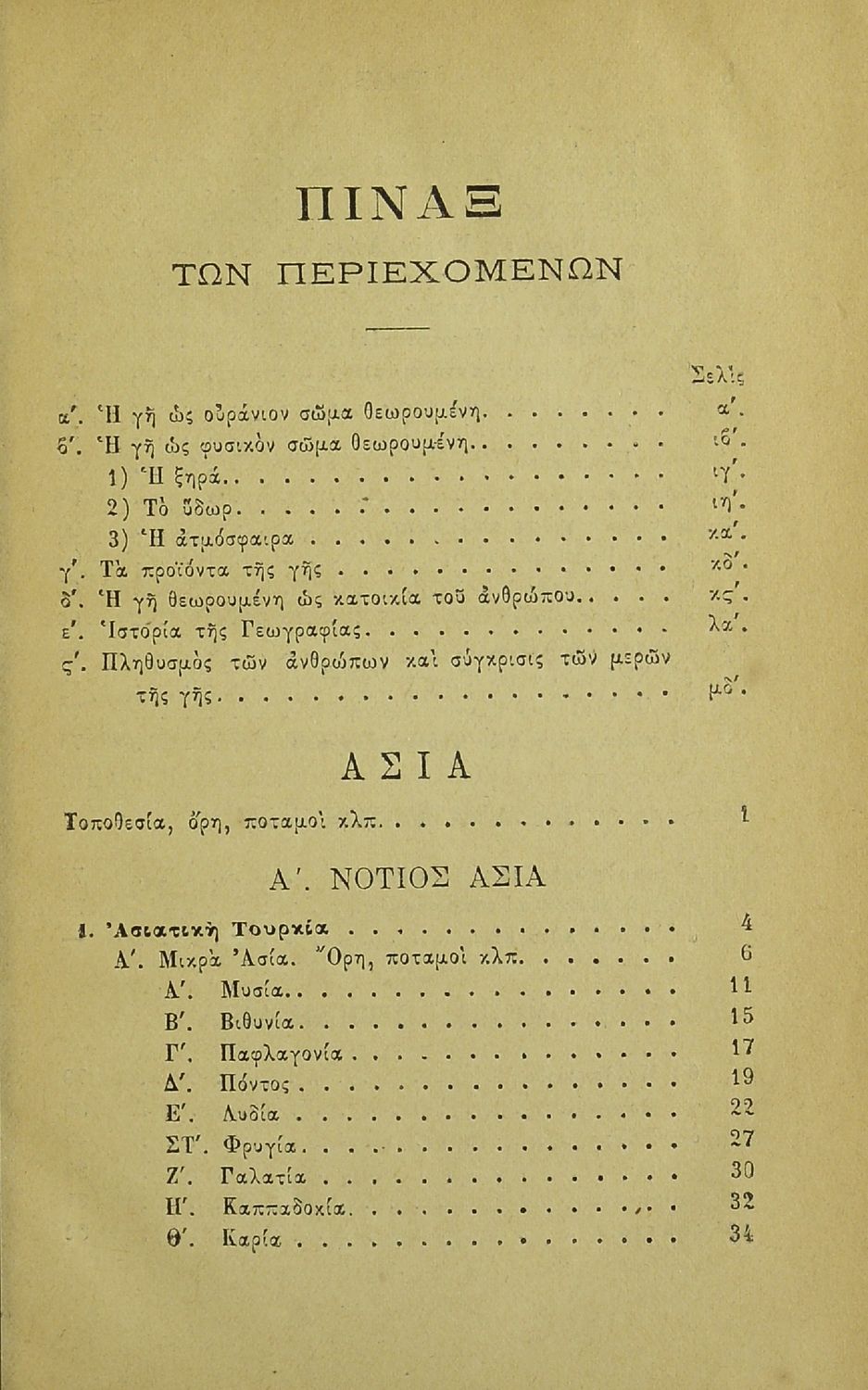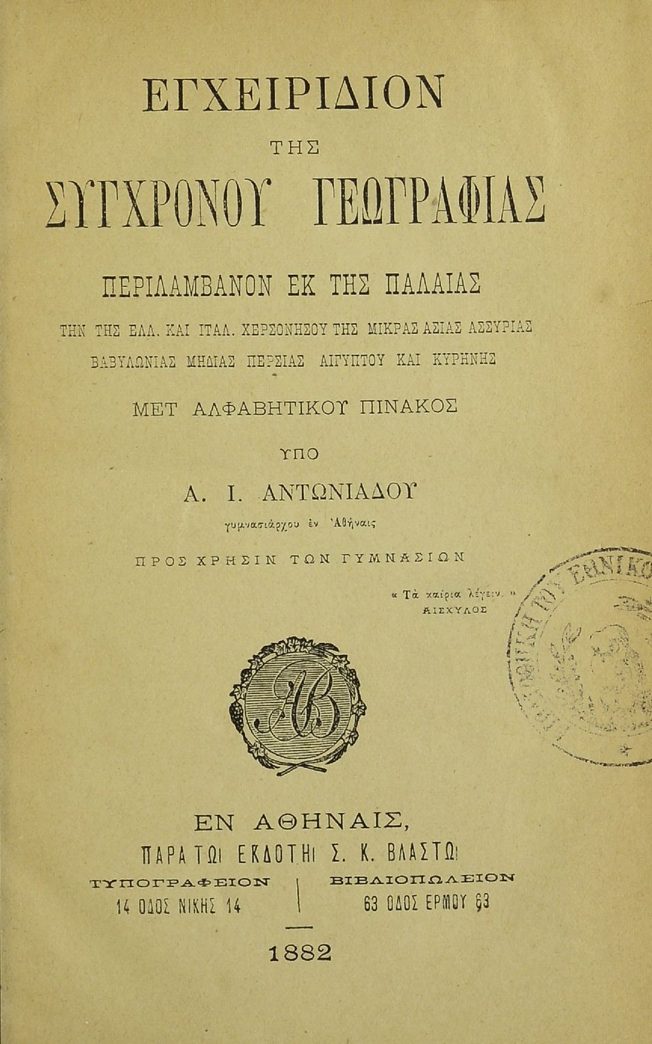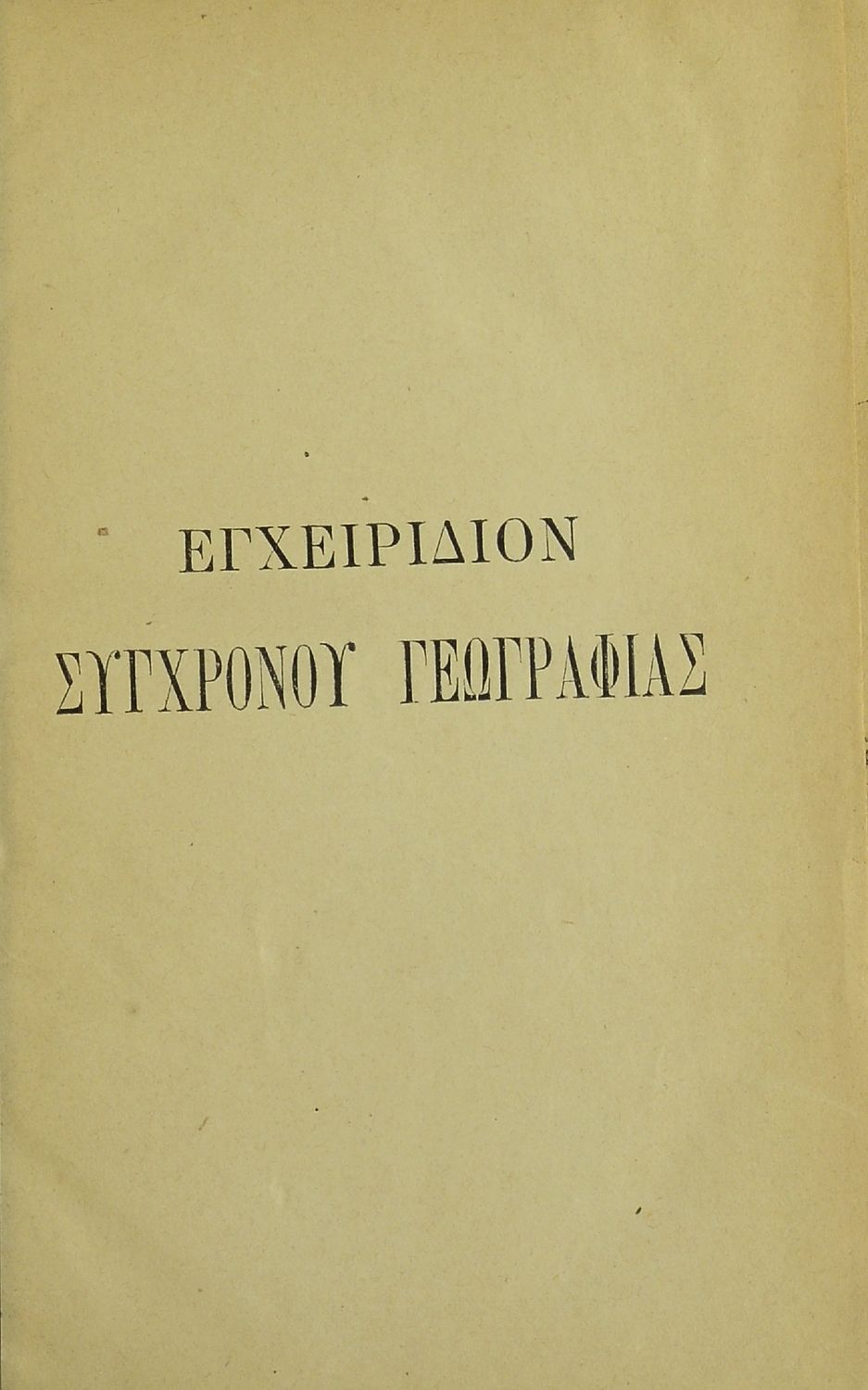 Εγχειρίδιον της συγχρόνου γεωγραφίας περιλαμβάνον εκ της παλαιάς την της ελλ. και ιταλ. Χερσονήσου της Μικράς Ασίας, Ασσυρίας, Βαβυλωνίας, Μηδίας, Περσίας, Αιγύπτου και Κυρήνης μετ' αλφαβητικού πίνακος προς χρήσιν των Γυμνασίων