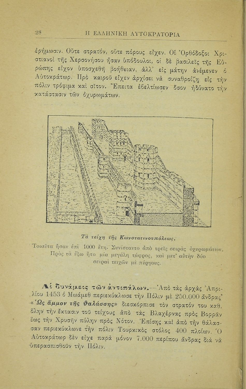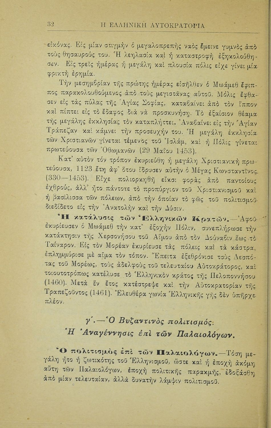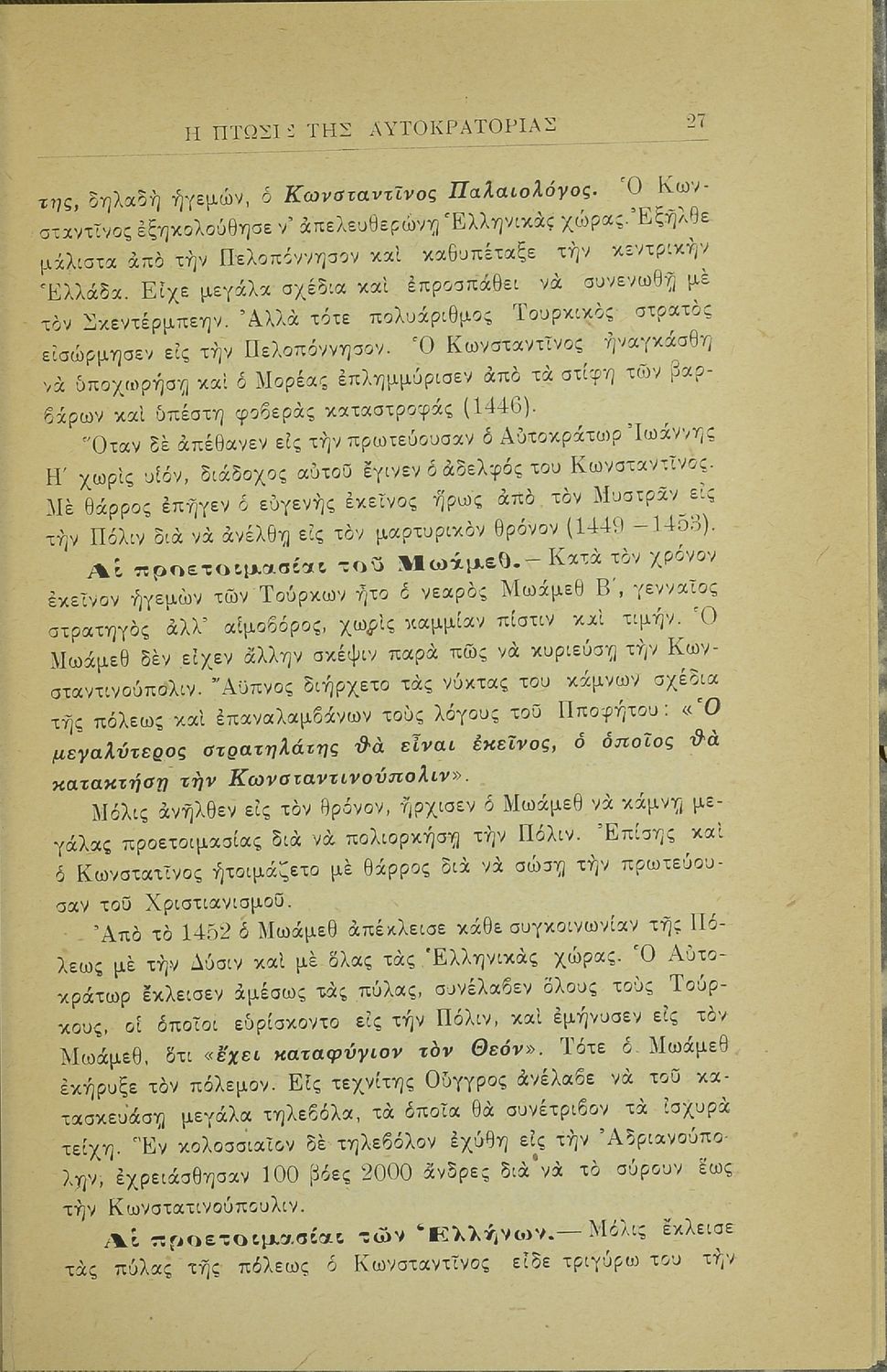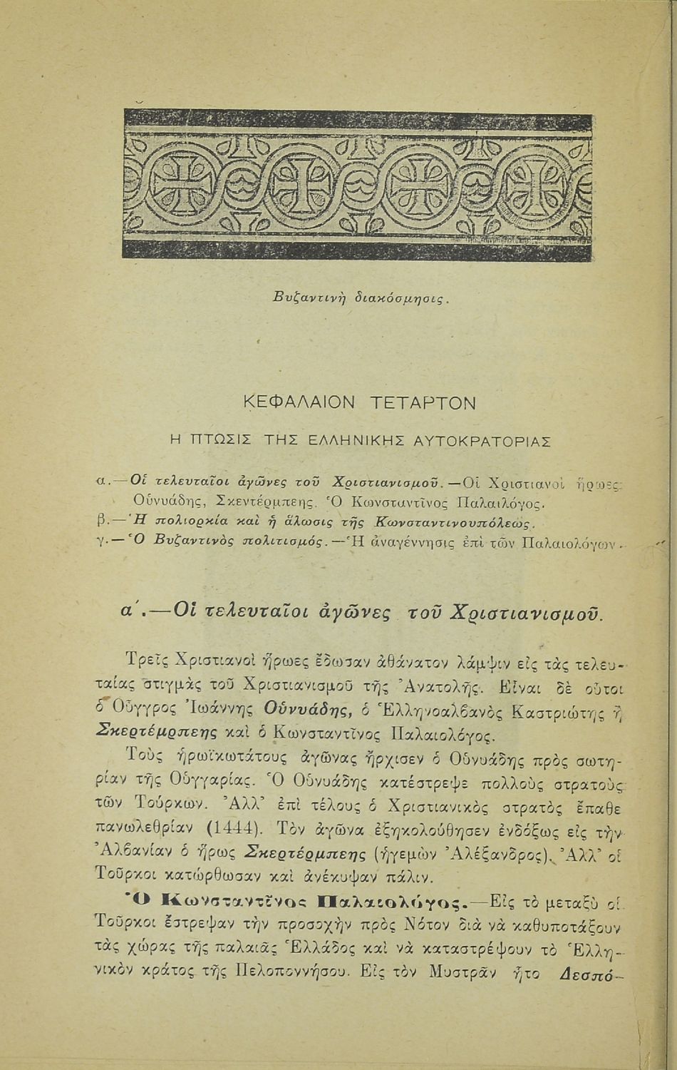520 ## _aΣχολικό εγχειρίδιο για την Γ' Ελληνικού για το μάθημα της Ιστορίας. Το εγχειρίδιο είναι χωρισμένο σε 5 μέρη. Το πρώτο μέρος περιλαμβάνει τα γεγονότα των τελευταίων χρόνων της Ελληνικής Αυτοκρατορίας (1204 - 1453). Το δεύτερο μέρος ασχολείται με τα ζητήματα της νεώτερης ευρωπαϊκής ιστορίας (1453 - 1830). Το τρίτο μέρος περιλαμβάνει τους χρόνους της υποδούλωσης του ελληνικού έθνους (1453 - 1821). Το τέταρτο μέρος ασχολείται αποκλειστικά με την Ελληνική Επανάσταση (1821 - 1830) και το πέμπτο και τελευταίο μέρος ασχολείται με τα τελευταία 100 χρόνια μεταξύ του 1830 και 1924.