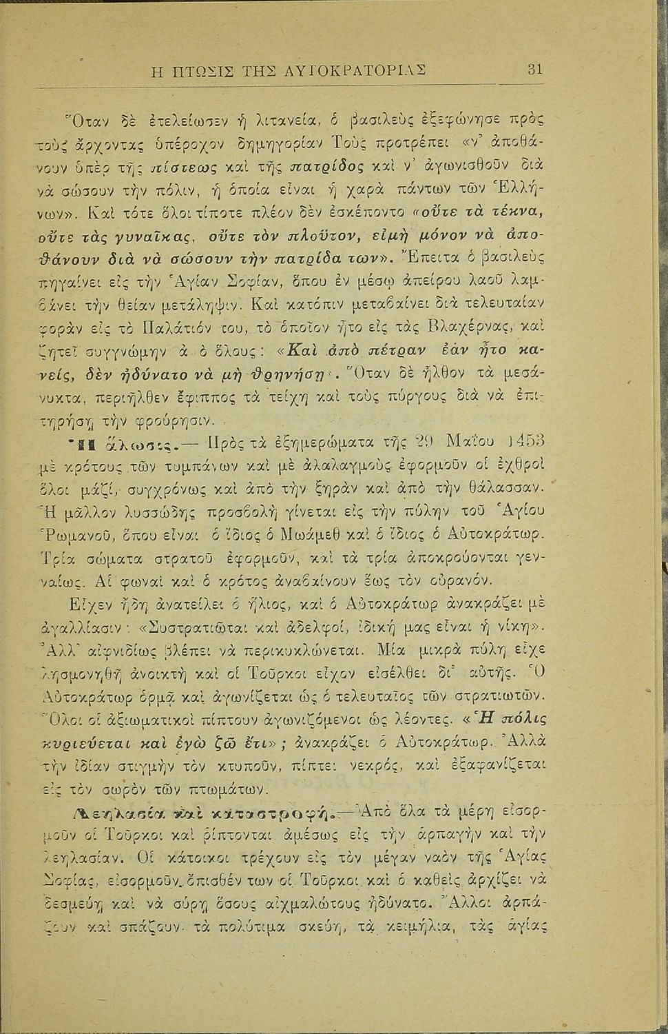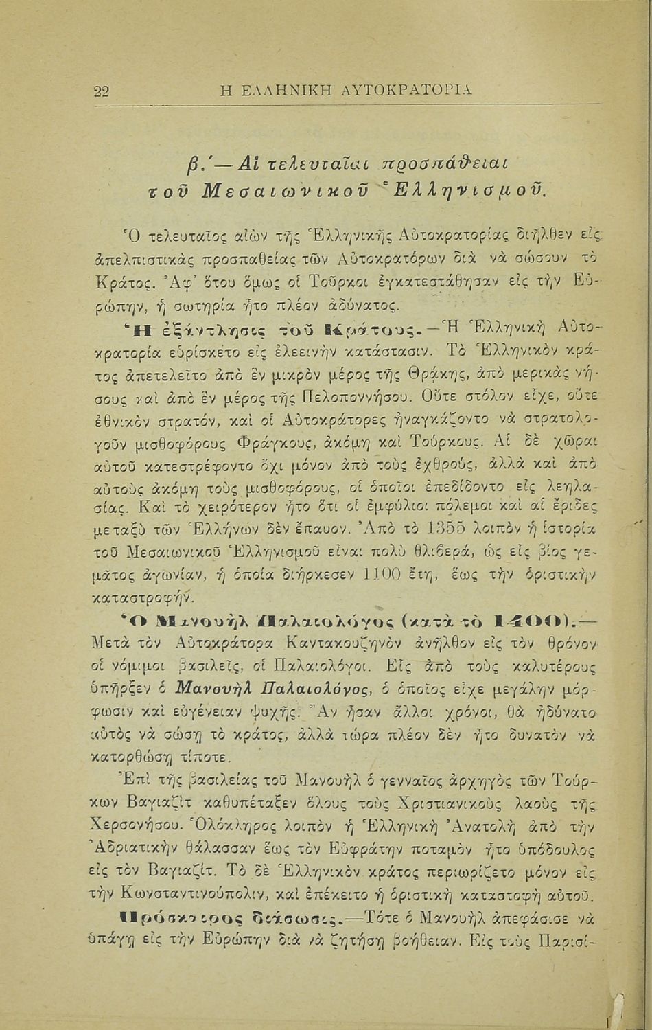 Βαθμίδα εκπαίδευσης: Δευτεροβάθμια Τάξη: Γ' Ελληνικού Σχολείου Μάθημα: Ιστορία Γλώσσα: Απλή καθαρεύουσα Παρουσίαση περιεχομένου: Σχολικό εγχειρίδιο για την Γ' Ελληνικού για το μάθημα της Ιστορίας. Το εγχειρίδιο είναι χωρισμένο σε 5 μέρη. Το πρώτο μέρος περιλαμβάνει τα γεγονότα των τελευταίων χρόνων της Ελληνικής Αυτοκρατορίας (1204 - 1453). Το δεύτερο μέρος ασχολείται με τα ζητήματα της νεώτερης ευρωπαϊκής ιστορίας (1453 - 1830). Το τρίτο μέρος περιλαμβάνει τους χρόνους της υποδούλωσης του ελληνικού έθνους (1453 - 1821). Το τέταρτο μέρος ασχολείται αποκλειστικά με την Ελληνική Επανάσταση (1821 - 1830) και το πέμπτο και τελευταίο μέρος ασχολείται με τα τελευταία 100 χρόνια μεταξύ του 1830 και 1924. |