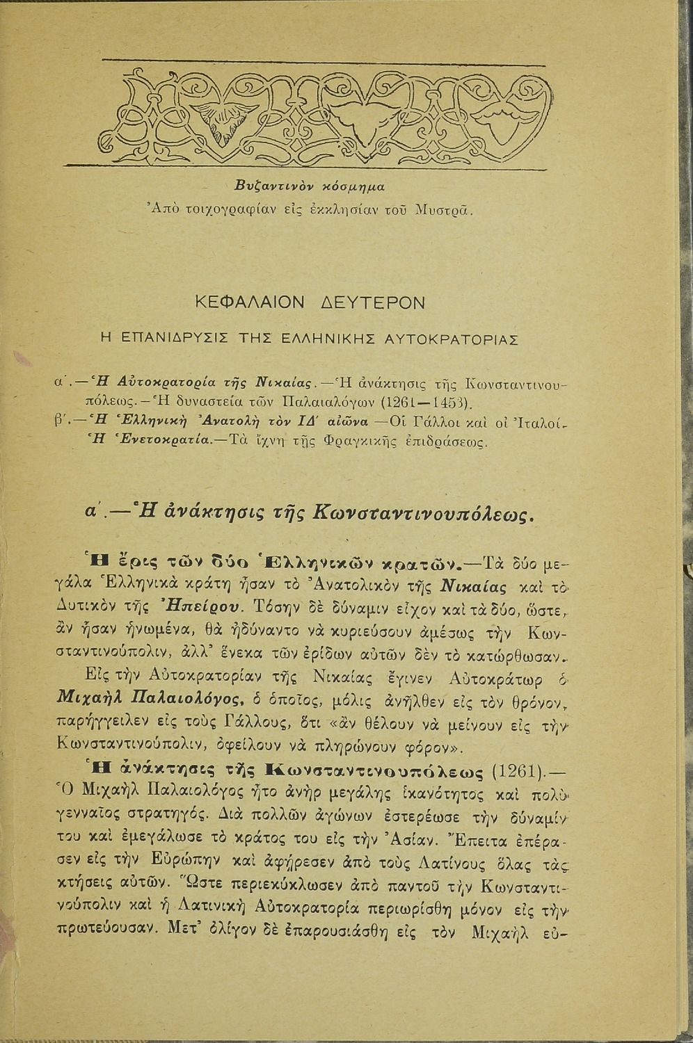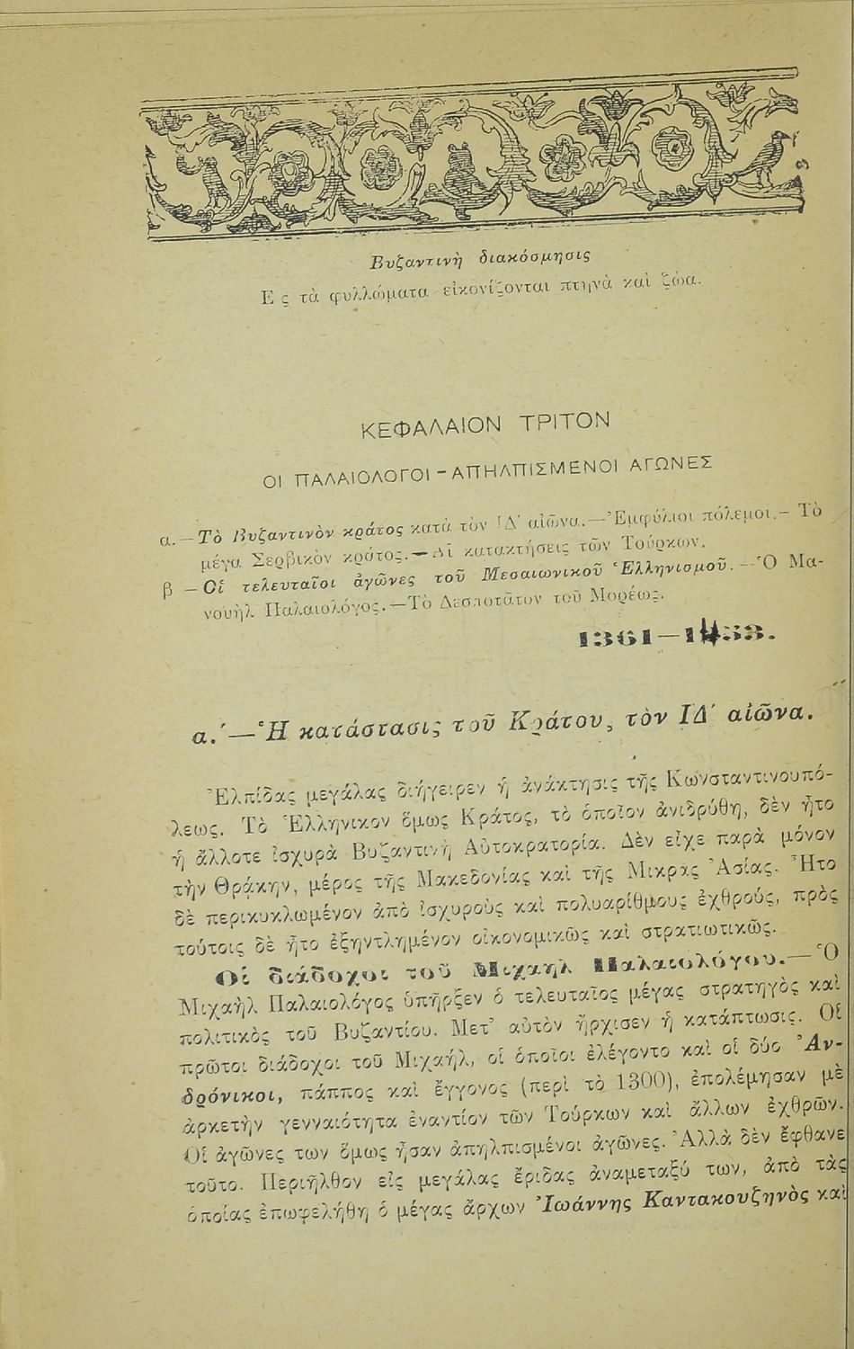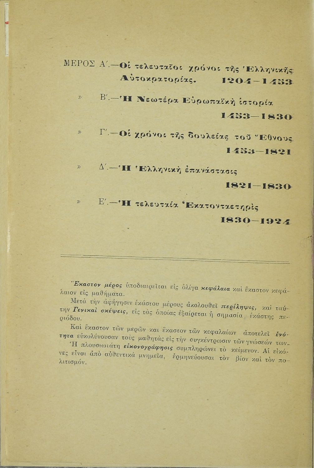 Σχολικό εγχειρίδιο για την Γ' Ελληνικού για το μάθημα της Ιστορίας. Το εγχειρίδιο είναι χωρισμένο σε 5 μέρη. Το πρώτο μέρος περιλαμβάνει τα γεγονότα των τελευταίων χρόνων της Ελληνικής Αυτοκρατορίας (1204 - 1453). Το δεύτερο μέρος ασχολείται με τα ζητήματα της νεώτερης ευρωπαϊκής ιστορίας (1453 - 1830). Το τρίτο μέρος περιλαμβάνει τους χρόνους της υποδούλωσης του ελληνικού έθνους (1453 - 1821). Το τέταρτο μέρος ασχολείται αποκλειστικά με την Ελληνική Επανάσταση (1821 - 1830) και το πέμπτο και τελευταίο μέρος ασχολείται με τα τελευταία 100 χρόνια μεταξύ του 1830 και 1924.