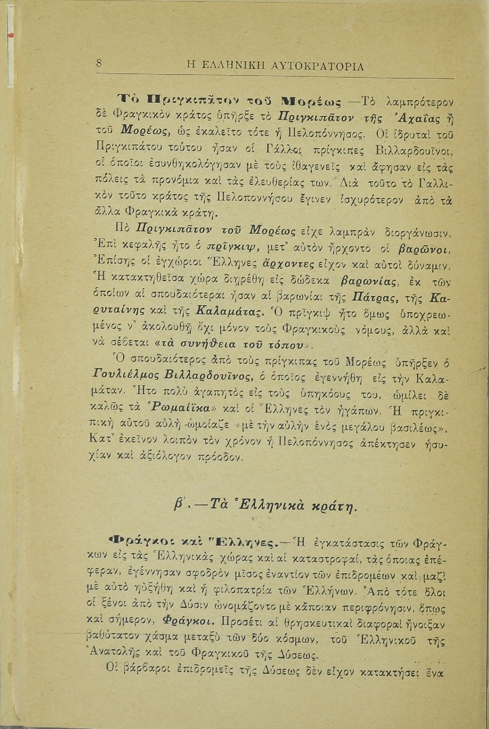 LDR 02193 2200217 4500 035 ## _a08-00071 040 ## _aΕθνική Βιβλιοθήκη της Ελλάδος 041 ## _ael 100 ## _aΑδαμάντιος Ι. Αδαμαντίου 110 ## _a71 245 0# _aΝεωτέρα ιστορία ελληνική και ευρωπαϊκή 1204 - 1924 εγκεκριμένη διά την Γ΄ τάξιν των Ελληνικών Σχολείων και τας αντιστοίχους με 100 χάρτας και εικόνας 250 ## _a3η Έκδοση 260 ## _aΑθήνα _bΙωάννης Ν. Σιδέρης _c1926 300 ## _a204 _bΣκίτσα (ασπρόμαυρα), Χάρτες (ασπρόμαυροι) 520 ## _aΣχολικό εγχειρίδιο για την Γ' Ελληνικού για το μάθημα της Ιστορίας. Το εγχειρίδιο είναι χωρισμένο σε 5 μέρη. Το πρώτο μέρος περιλαμβάνει τα γεγονότα των τελευταίων χρόνων της Ελληνικής Αυτοκρατορίας (1204 - 1453). Το δεύτερο μέρος ασχολείται με τα ζητήματα της νεώτερης ευρωπαϊκής ιστορίας (1453 - 1830). Το τρίτο μέρος περιλαμβάνει τους χρόνους της υποδούλωσης του ελληνικού έθνους (1453 - 1821). Το τέταρτο μέρος ασχολείται αποκλειστικά με την Ελληνική Επανάσταση (1821 - 1830) και το πέμπτο και τελευταίο μέρος ασχολείται με τα τελευταία 100 χρόνια μεταξύ του 1830 και 1924. 521 ## _aΓ' Ελληνικού Σχολείου 522 ## _aΕλλάδα 546 ## _aΑπλή καθαρεύουσα 563 ## _aΣκληρό Εξώφυλλο 583 ## _a1909/ 31-1-1924 _c1924 650 #4 _aΑνεξαρτησία _aΑπλή καθαρεύουσα _aΓ' Ελληνικού _aΕλληνική Επανάσταση _aΙστορία _aΜικρασιατική Καταστροφή _aΤουρκοκρατία _aΦραγκοκρατία
