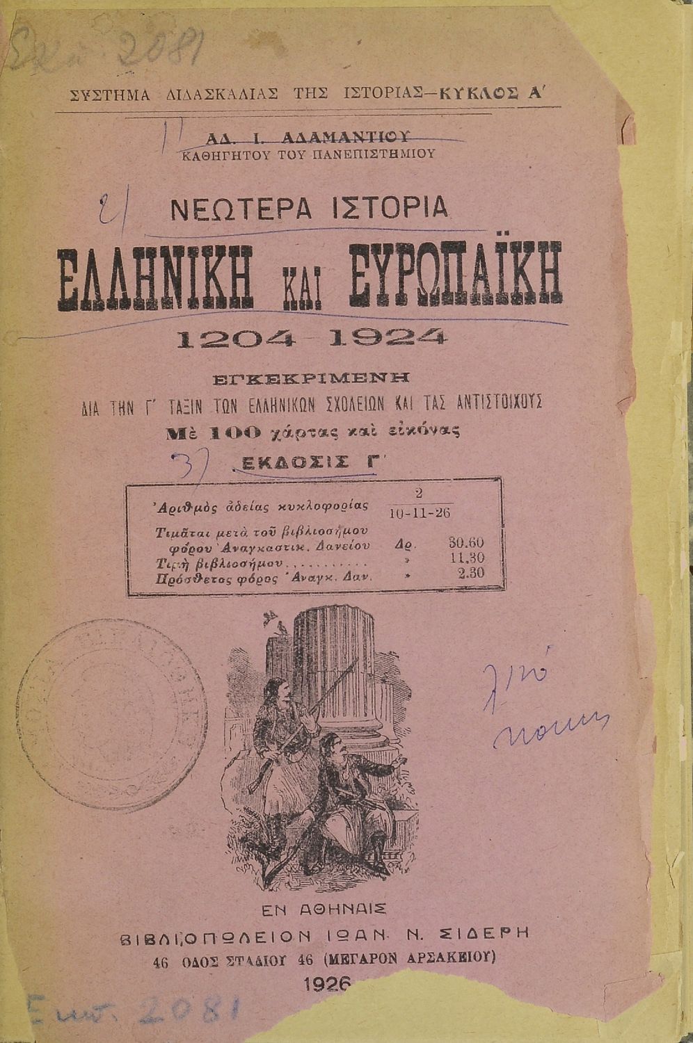 Κωδικός αναγνώρισης: 08-00071 Τίτλος: Νεωτέρα ιστορία ελληνική και ευρωπαϊκή 1204 - 1924 εγκεκριμένη διά την Γ΄ τάξιν των Ελληνικών Σχολείων και τας αντιστοίχους με 100 χάρτας και εικόνας Συγγραφέας: Αδαμάντιος Ι. Αδαμαντίου Μέγεθος και υπόστρωμα: Σχολικό εγχειρίδιο, σκληρό εξώφυλλο, 204 σελίδες. Σκίτσα (ασπρόμαυρα), χάρτες (ασπρόμαυροι). |