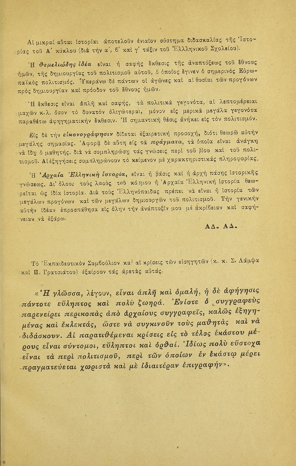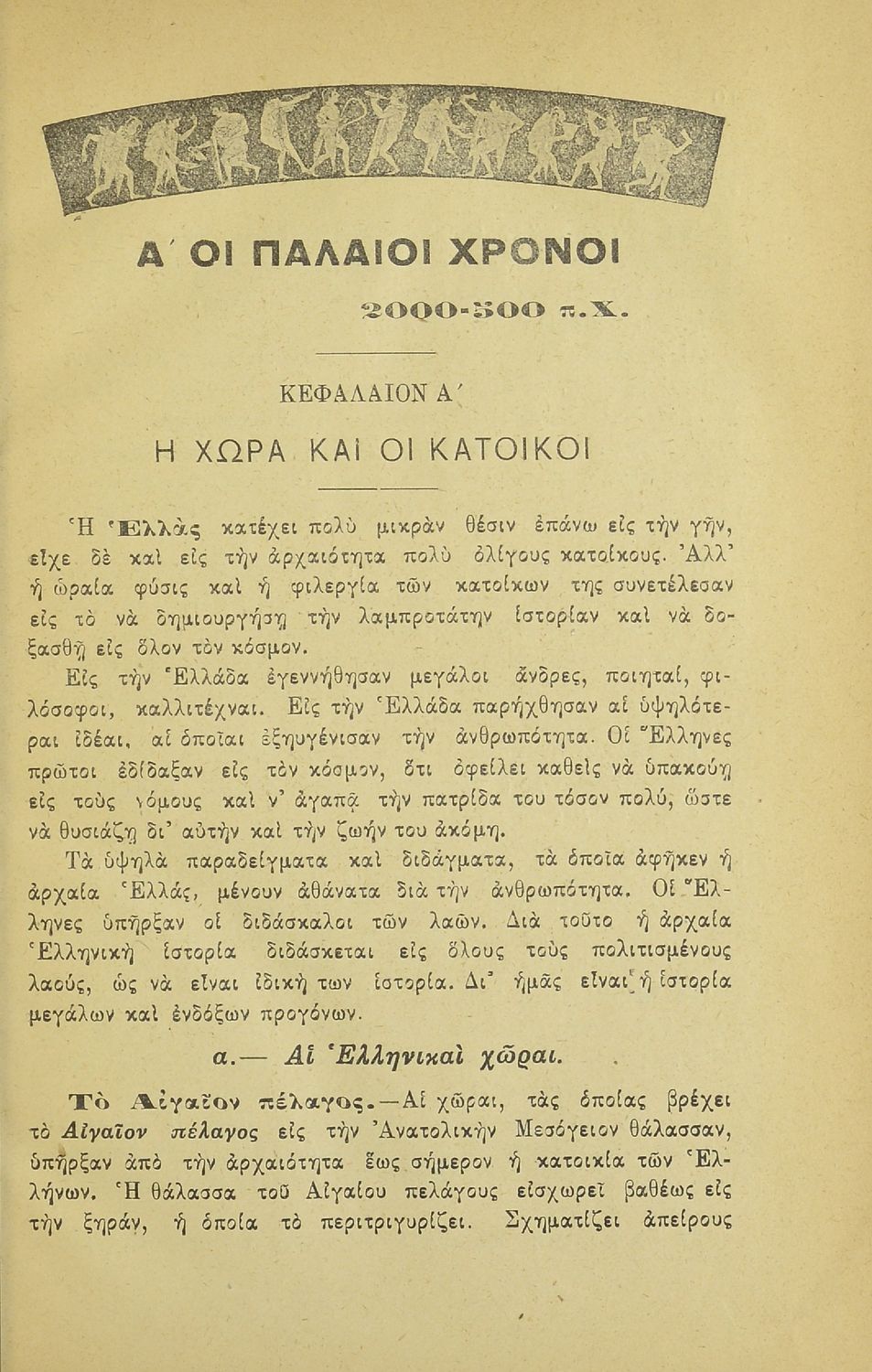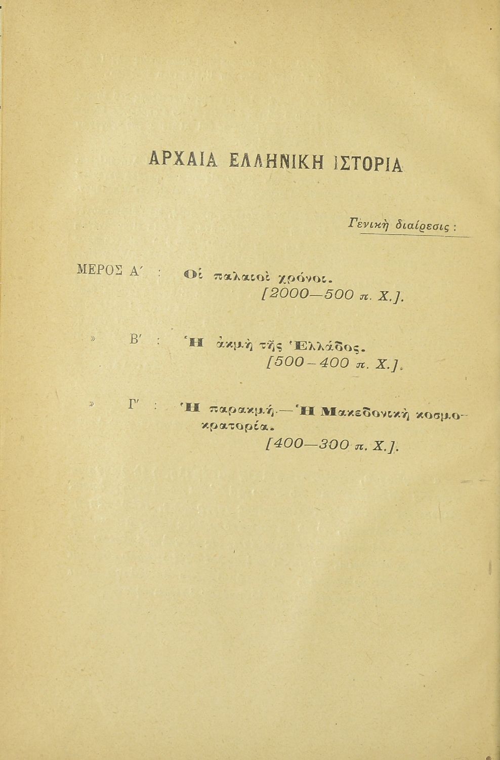 Σχολικό εγχειρίδιο Ιστορίας Α΄ Ελληνικού Σχολείου και Παρθεναγωγείου που καλύπτει την περίοδο από τους ηρωικούς και μυθικούς χρόνους μέχρι την μάχη της Μαντινείας και τον θάνατο του Επαμεινώνδα.