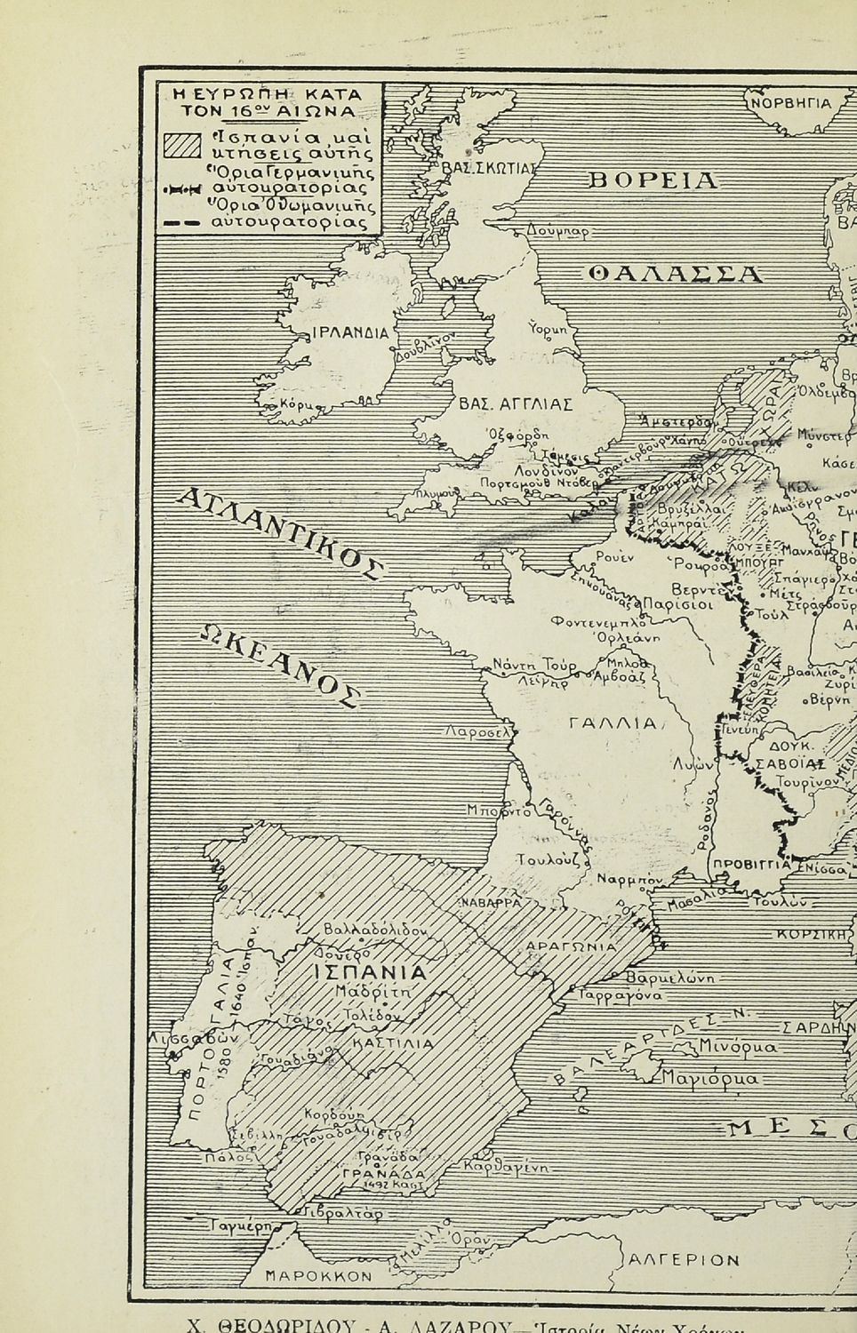 Κωδικός αναγνώρισης: 08-00084 Τίτλος: Ιστορία ελληνική και ευρωπαϊκή των νέων χρόνων διά την Δ΄ τάξιν των Γυμνασίων και τας αντιστοίχους των λοιπών σχολείων της Μέσης Εκπαιδεύσεως μετά 100 εικόνων και 10 χαρτών Συγγραφέας: Χ. Θεοδωρίδης, Α. Λαζάρου Μέγεθος και υπόστρωμα: Σχολικό εγχειρίδιο, σκληρό εξώφυλλο, 532 σελίδες. Σκίτσα (ασπρόμαυρα), χάρτες (ασπρόμαυροι). |