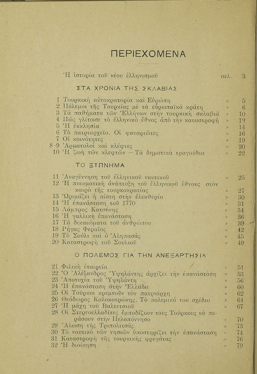 Το σύγγραμμα ήταν σχολικό εγχειρίδιο για μάθημα της Ιστορίας στο Δημοτικό. Αναφέρεται στα ιστορικά γεγονότα από την περίοδο της Οθωμανικής Αυτοκρατορίας και τη διοίκηση των ελληνικών κοινοτήτων, την οργάνωση ...