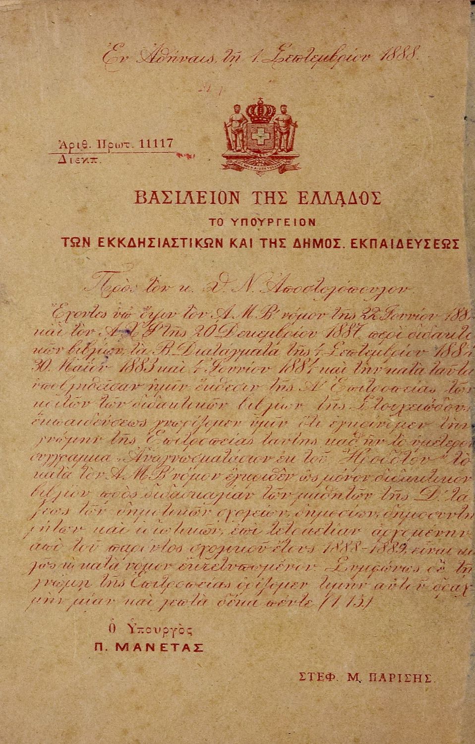 Εκδότης: Θ. Αποστολόπουλος Τόπος έκδοσης: Αθήνα Υπουργική απόφαση / Σύμβαση: 6148/ 7-5-1889 Έτος έγκρισης: 1889 |