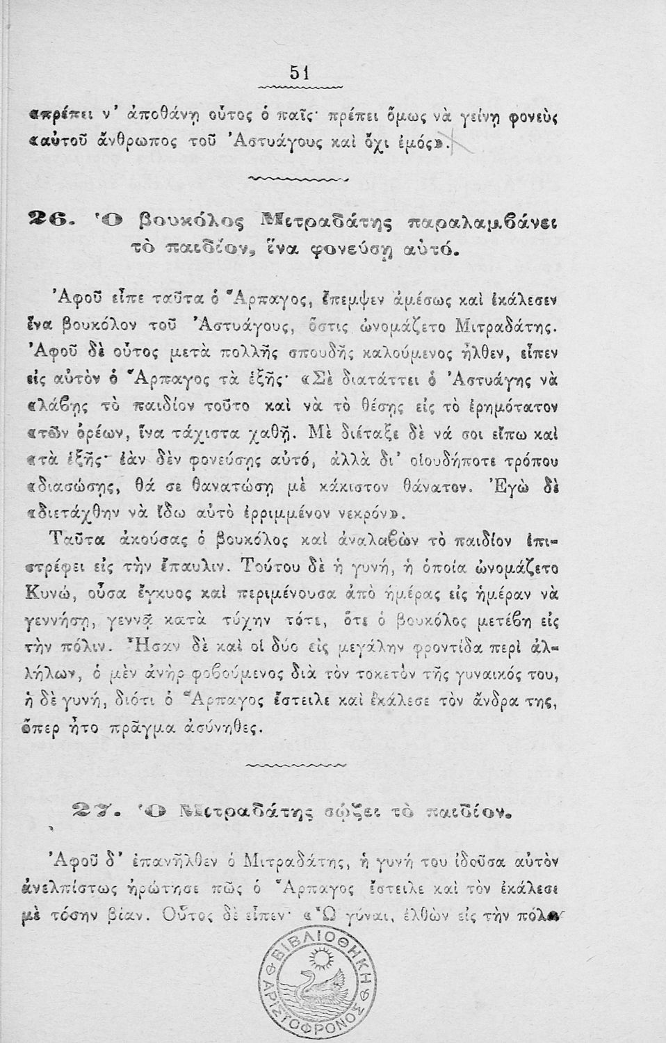 Βαθμίδα εκπαίδευσης: Πρωτοβάθμια Τάξη: Δ' Δημοτικού Μάθημα: Νέα Ελληνικά Γλώσσα: Καθαρεύουσα Παρουσίαση περιεχομένου: Αναγνωστικό Δ΄ Δημοτικού που περιέχει διηγήματα εμπνευσμένα από το έργο του Ηροδότου Μούσαι. |