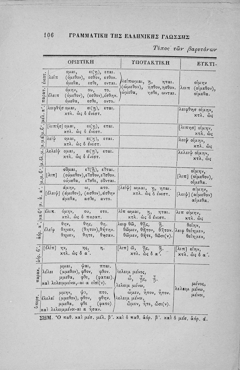 Μαθητικό βοήθημα Αρχαίων Ελληνικών για τα Ελληνικά Σχολεία, Παρθεναγωγεία και Γυμνάσια που περιλαμβάνει γραμματική της αρχαίας ελληνικής και κατάλογο ανωμάλων ρημάτων.
