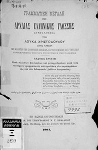 Σχολικό εγχειρίδιο Αρχαίων Ελληνικών για τα Ελληνικά Σχολεία και Παρθεναγωγεία που περιλαμβάνει κανόνες της γραμματικής της αρχαίας ελληνικής και είναι χωρισμένη στο φθογγολογικό και στο τυπολογικό μέρος.