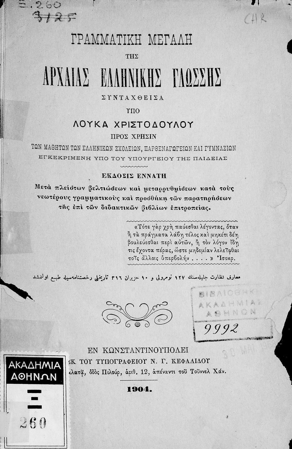 Τίτλος: Γραμματική μεγάλη της αρχαίας ελληνικής γλώσσης προς χρήσιν των μαθητών των Ελληνικών Σχολείων, Παρθεναγωγείων και Γυμνασίων εγκεκριμένη υπό του Υπουργείου της Παιδείας