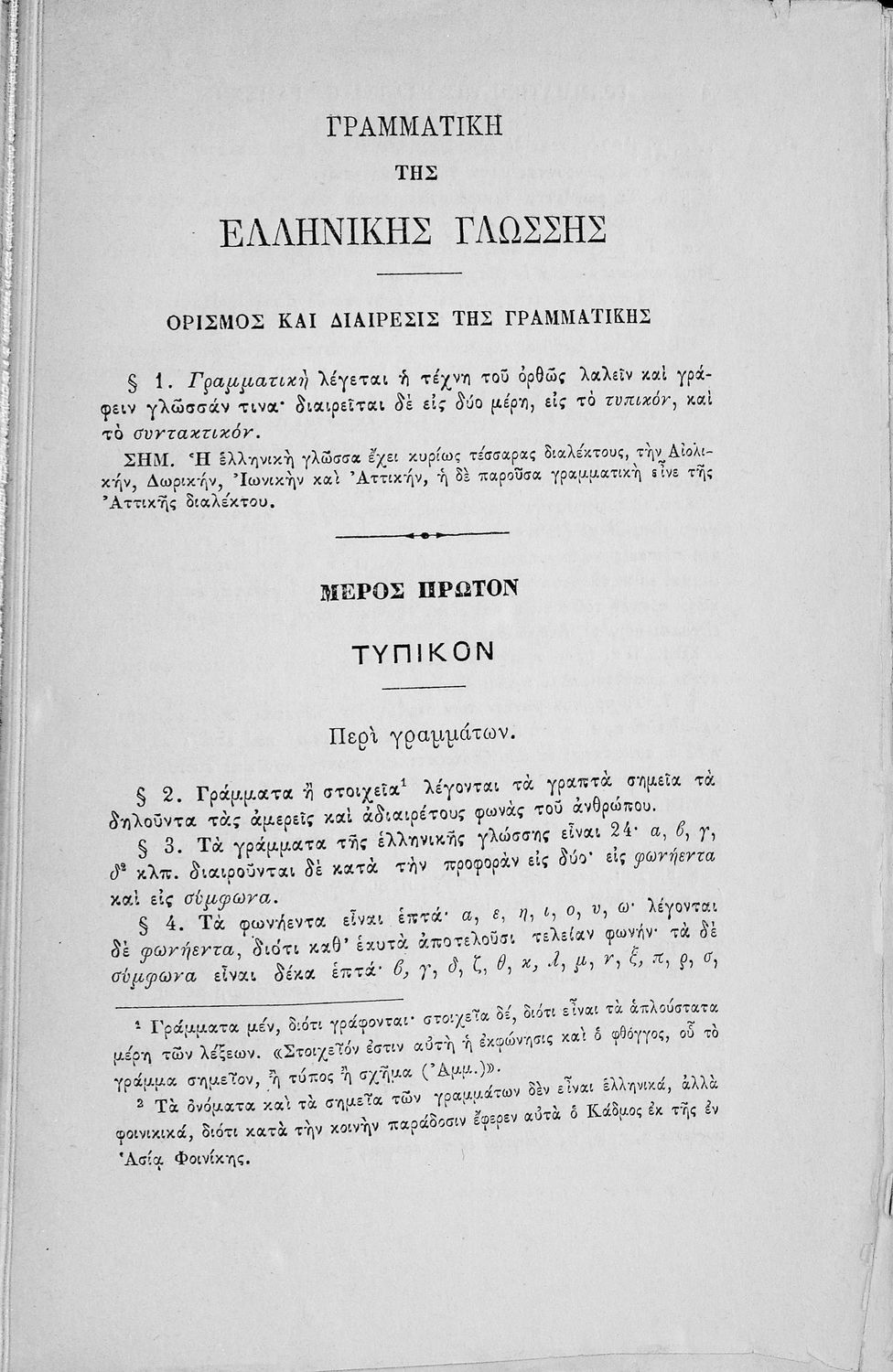 Σχολικό εγχειρίδιο Αρχαίων Ελληνικών για τα Ελληνικά Σχολεία, Παρθεναγωγεία και Γυμνάσια που περιέχει τους κανόνες γραμματικής και είναι χωρισμένο σε φθογγολογικό, τυπολογικό και ετυμολογικό μέρος.