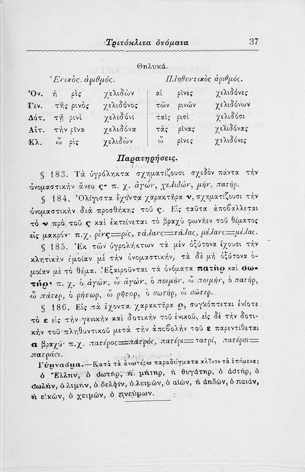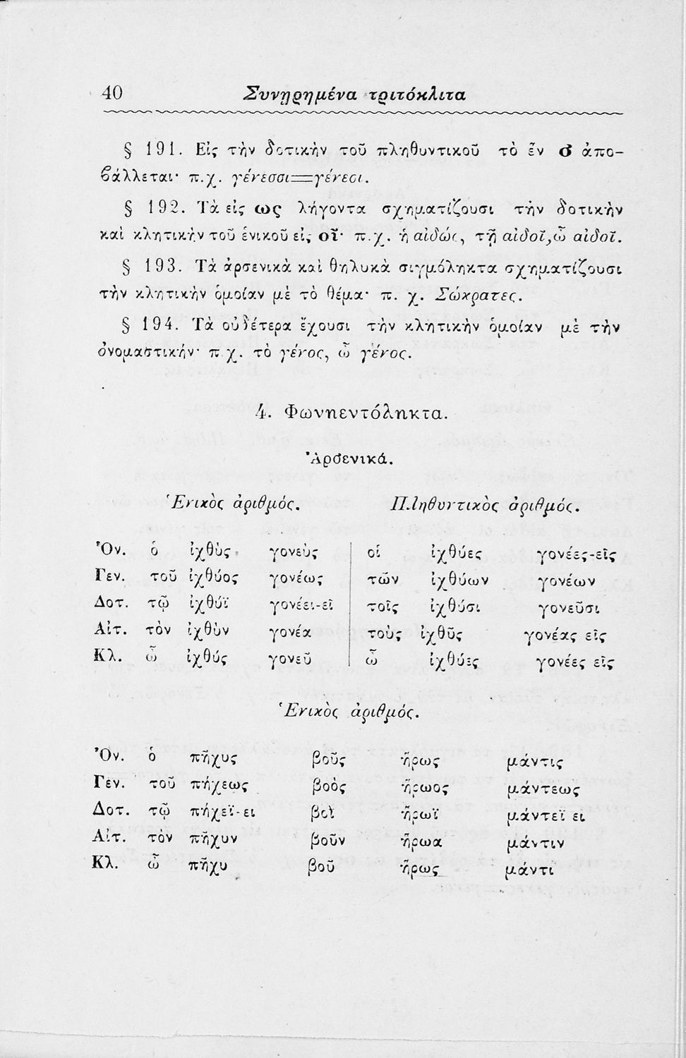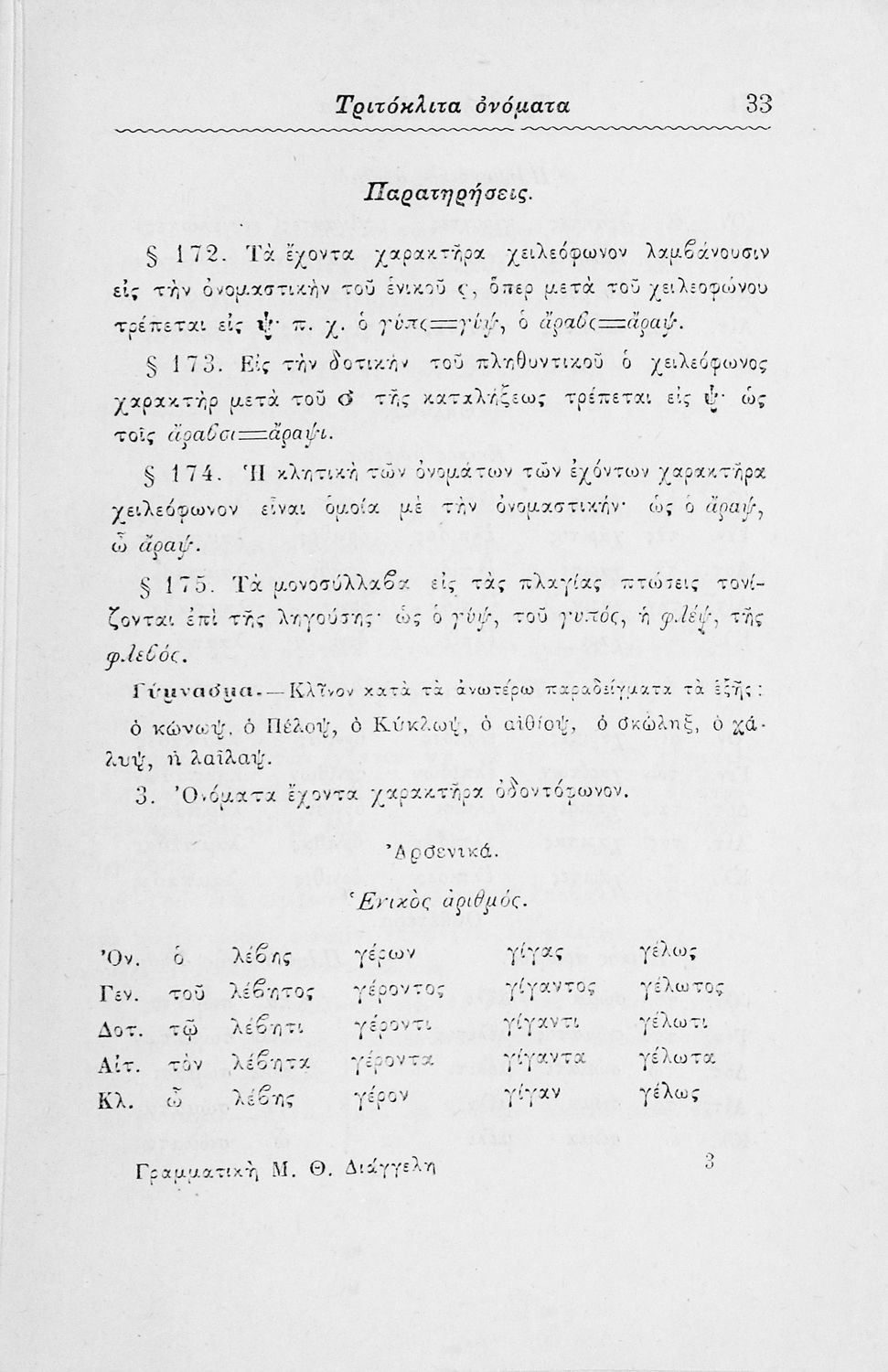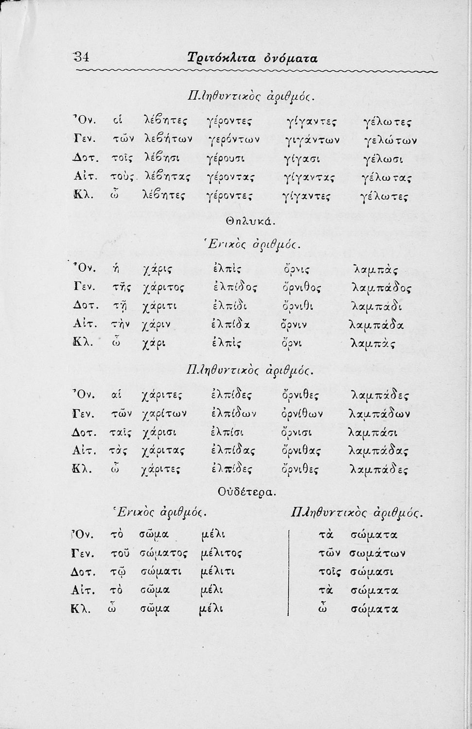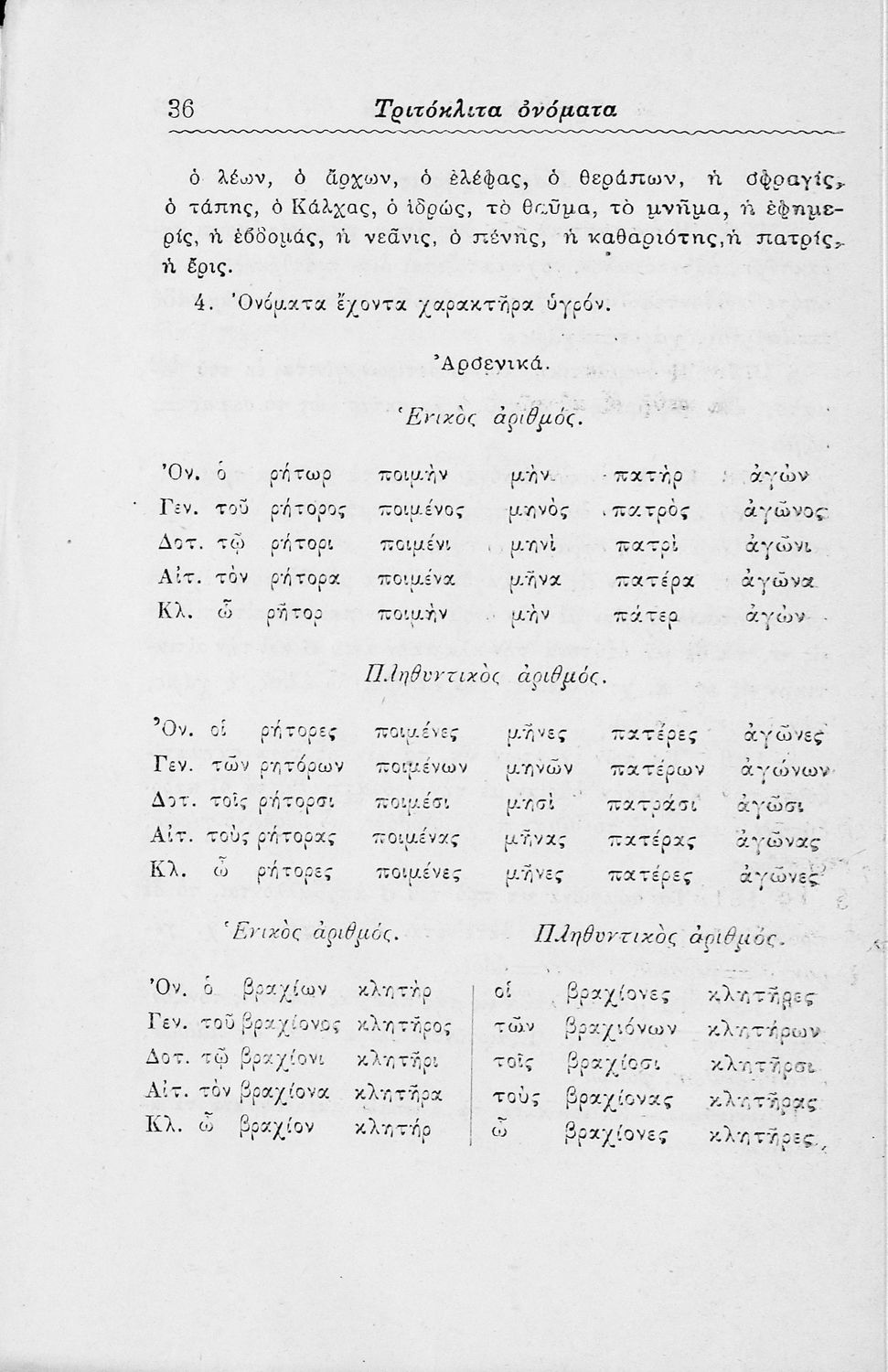 Σχολικό εγχειρίδιο Αρχαίων Ελληνικών Δημοτικού που περιλαμβάνει τους κανόνες γραμματικής και είναι χωρισμένο σε φθογγολογικό, τυπικό και ετυμολογικό μέρος.