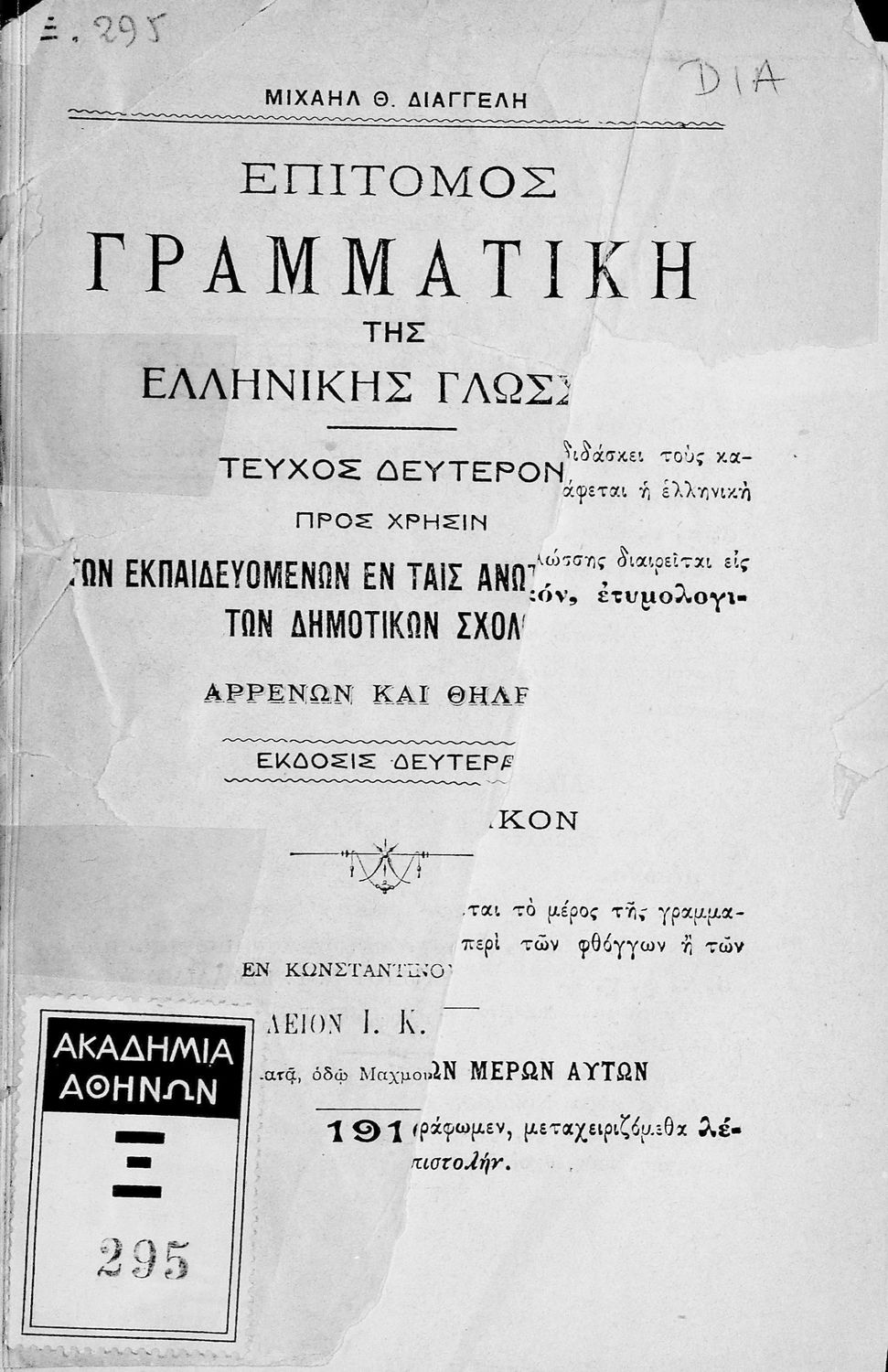 Τίτλος: Επίτομος γραμματική της ελληνικής γλώσσης, τεύχος δεύτερον προς χρήσιν των εκπαιδευομένων εν ταις ανωτέραις τάξεσι των Δημοτικών Σχολείων αρρένων και θηλέων