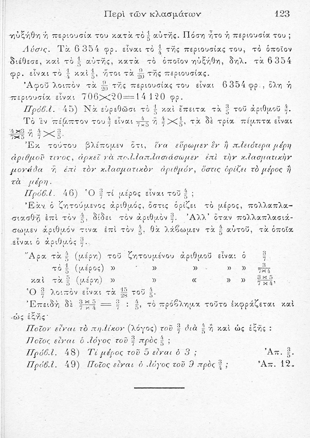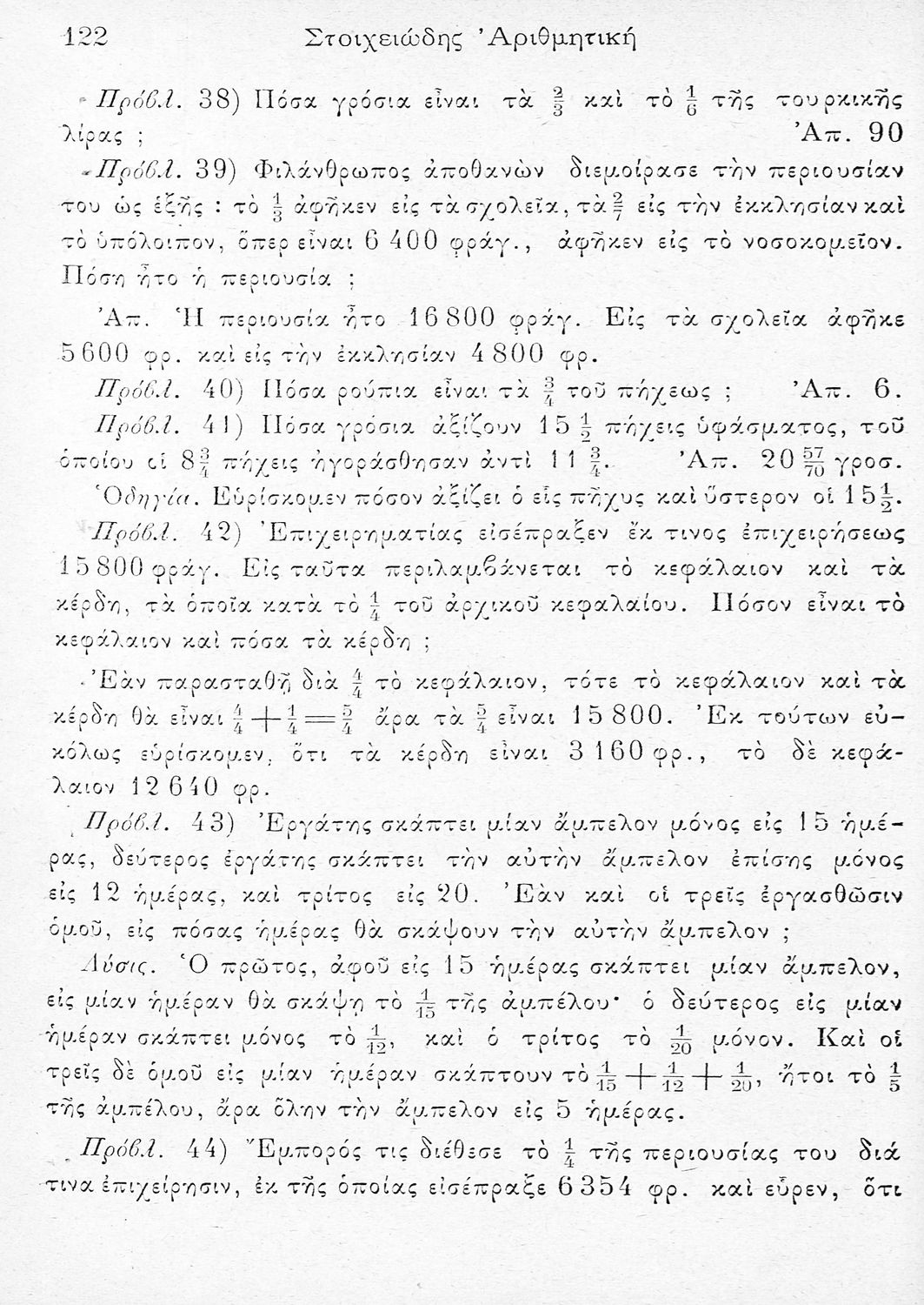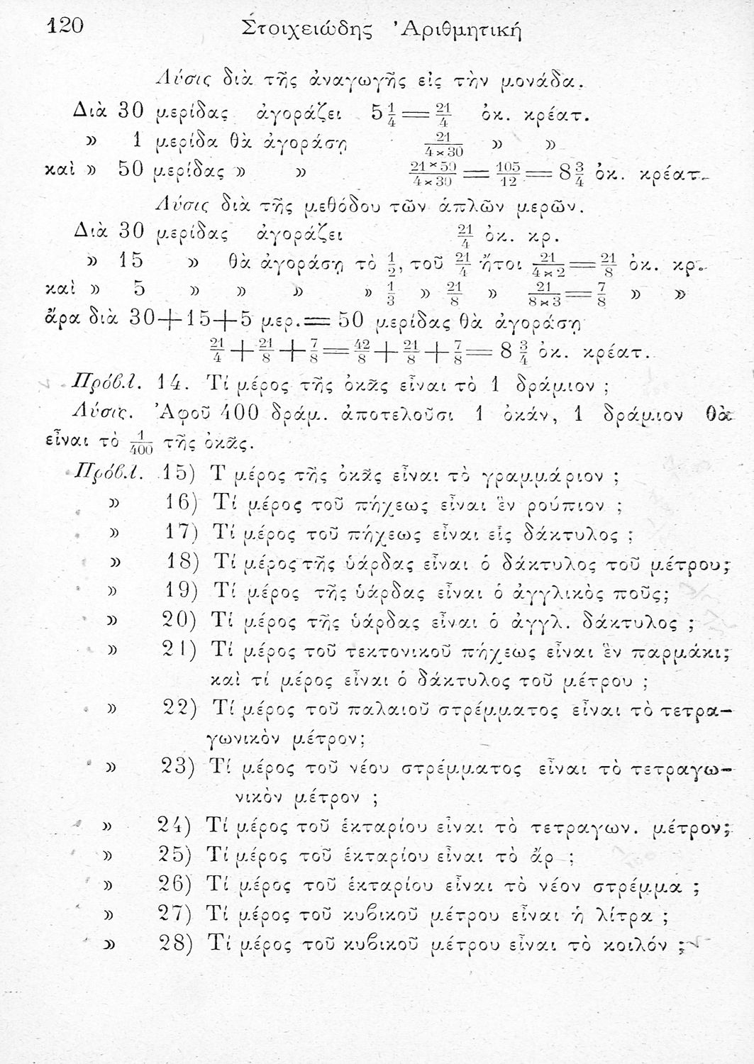 520 ## _aΣχολικό εγχειρίδιο για τις τάξεις του Ελληνικού, Παρθεναγωγείου, Αστικού και Σχολαρχείου σχολείου για το μάθημα των Μαθηματικών. Το εγχειρίδιο περιλαμβάνει τους στοιχειώδεις κανόνες της αριθμητικής και τις βασικές γνώσεις των Μαθηματικών, τις πρώτες έννοιες των ακεραίων αριθμών, τις 4 βασικές πράξεις, τα κλάσματα, τους δεκαδικούς αριθμούς, τους συμμιγείς αριθμούς, την απλή και σύνθετη μέθοδο των τριών κ.α.
