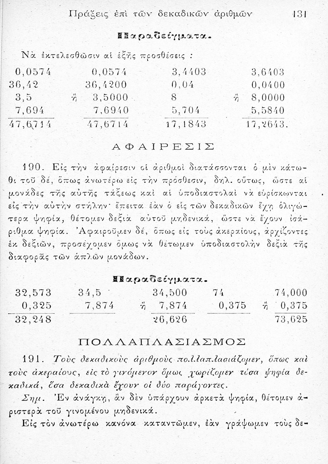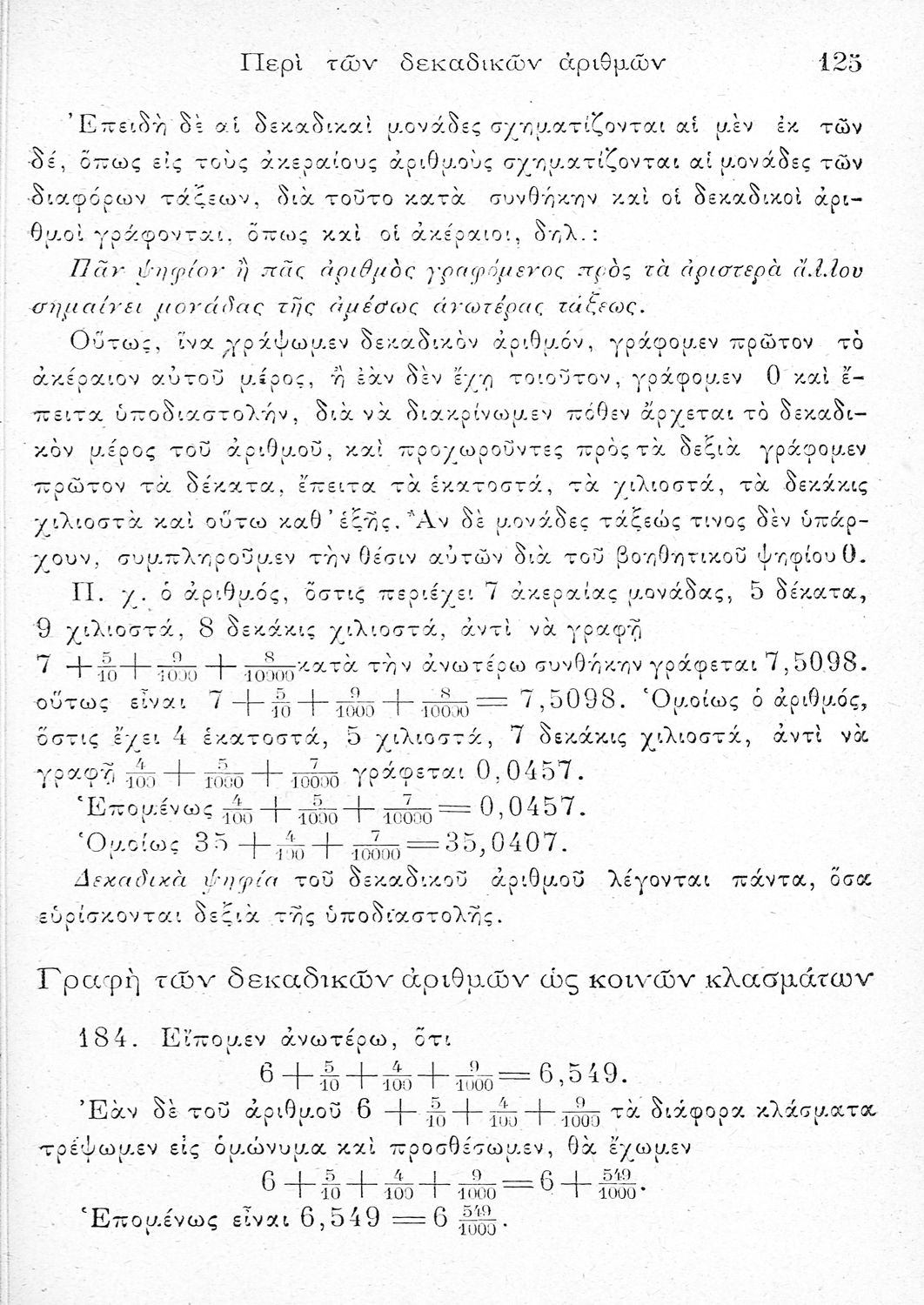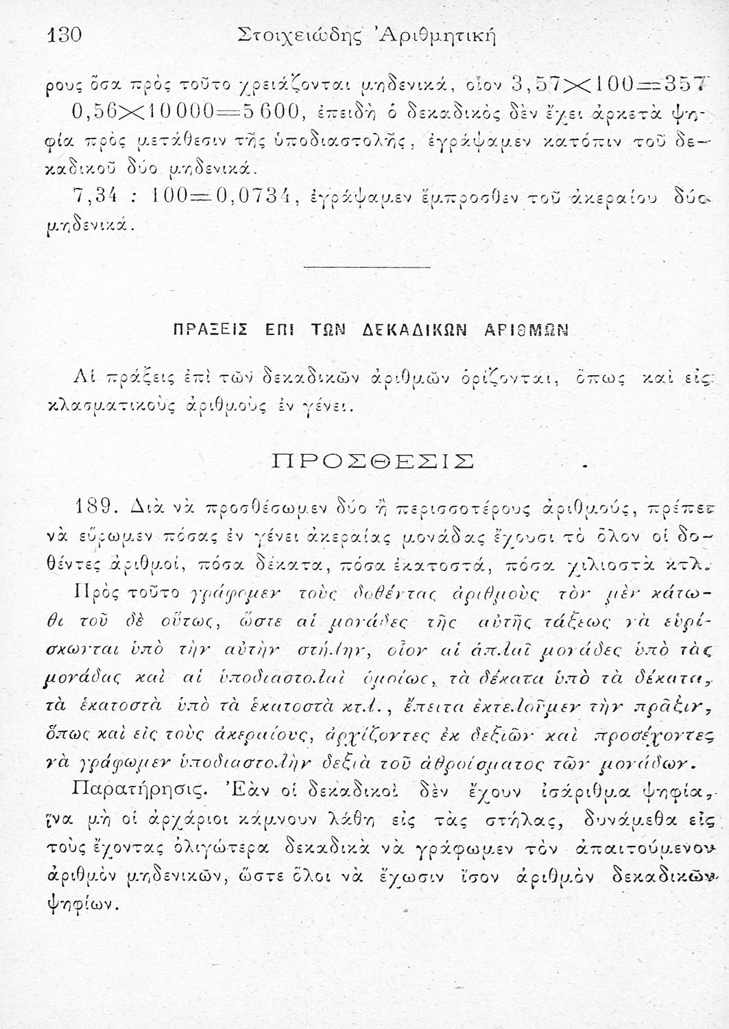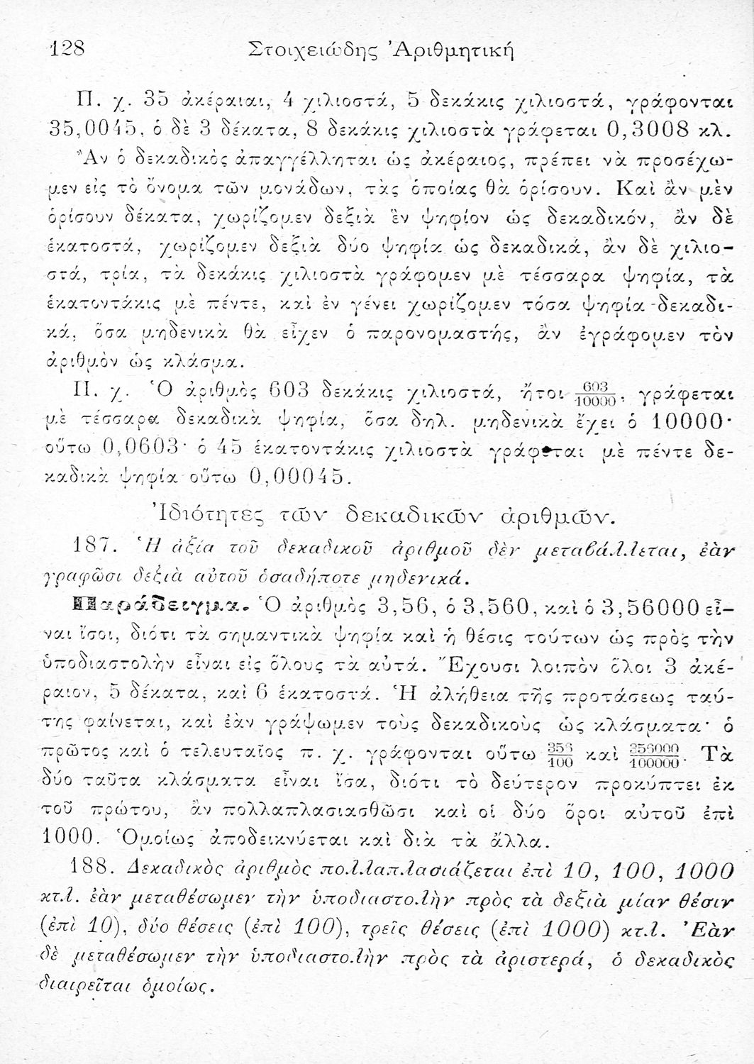 Σχολικό εγχειρίδιο για τις τάξεις του Ελληνικού, Παρθεναγωγείου, Αστικού και Σχολαρχείου σχολείου για το μάθημα των Μαθηματικών. Το εγχειρίδιο περιλαμβάνει τους στοιχειώδεις κανόνες της αριθμητικής και τις βασικές γνώσεις των Μαθηματικών, τις πρώτες έννοιες των ακεραίων αριθμών, τις 4 βασικές πράξεις, τα κλάσματα, τους δεκαδικούς αριθμούς, τους συμμιγείς αριθμούς, την απλή και σύνθετη μέθοδο των τριών κ.α.