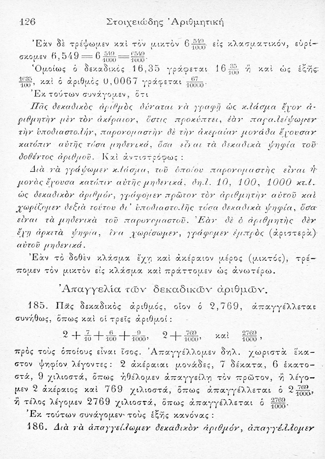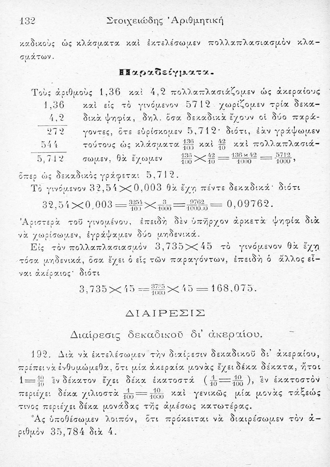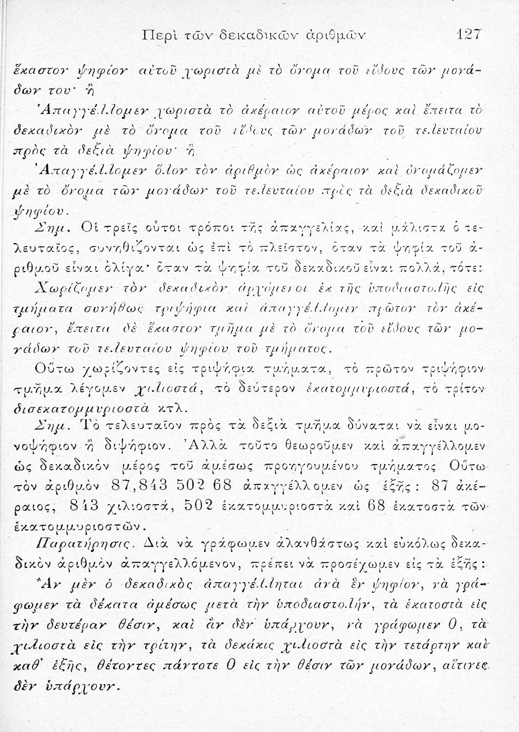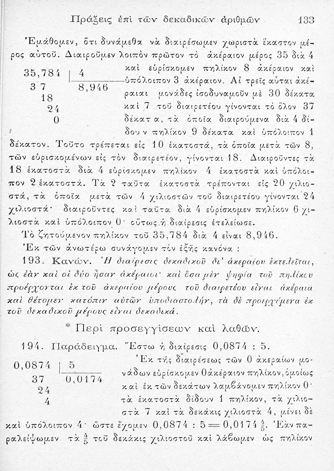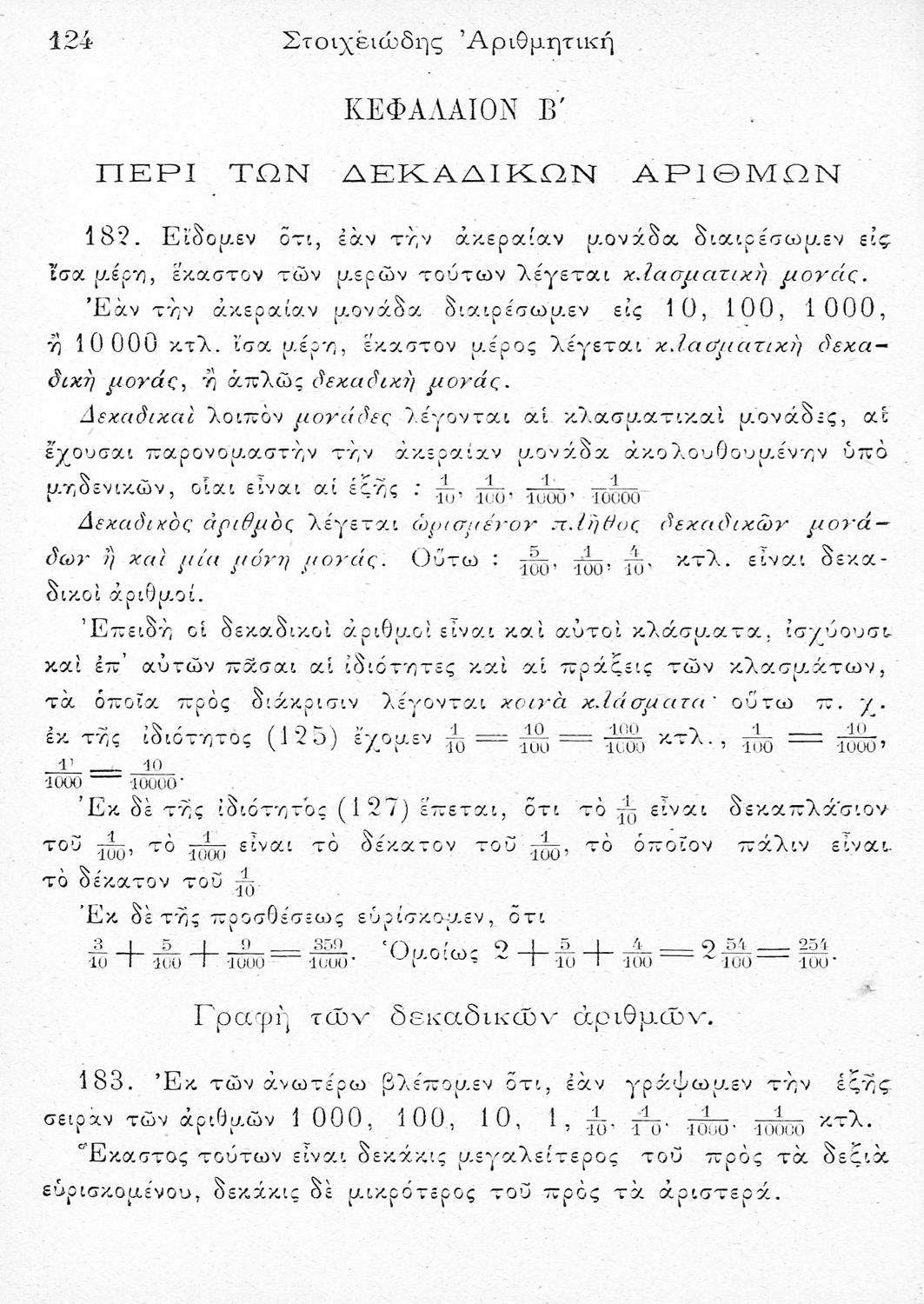 Σχολικό εγχειρίδιο για τις τάξεις του Ελληνικού, Παρθεναγωγείου, Αστικού και Σχολαρχείου σχολείου για το μάθημα των Μαθηματικών. Το εγχειρίδιο περιλαμβάνει τους στοιχειώδεις κανόνες της αριθμητικής και τις βασικές γνώσεις των Μαθηματικών, τις πρώτες έννοιες των ακεραίων αριθμών, τις 4 βασικές πράξεις, τα κλάσματα, τους δεκαδικούς αριθμούς, τους συμμιγείς αριθμούς, την απλή και σύνθετη μέθοδο των τριών κ.α.