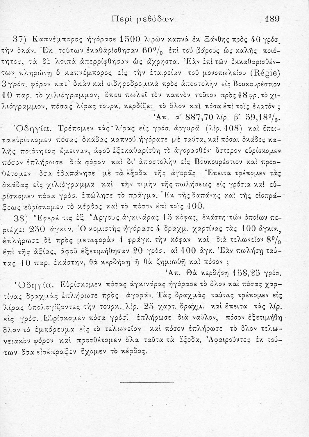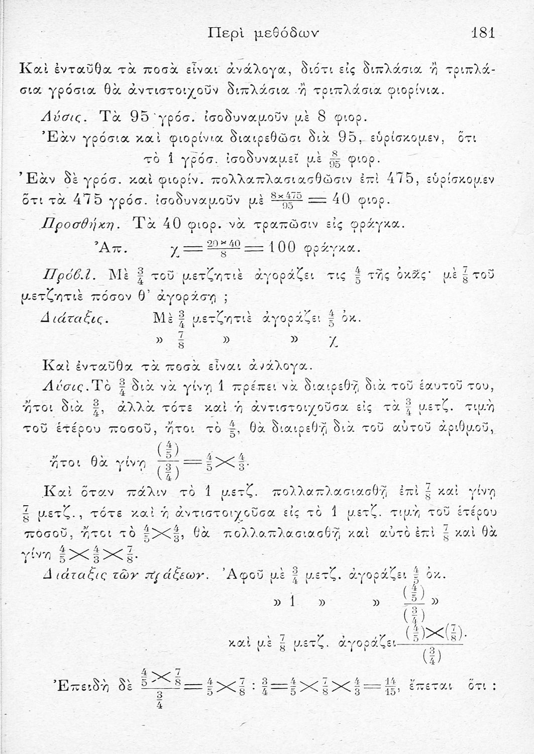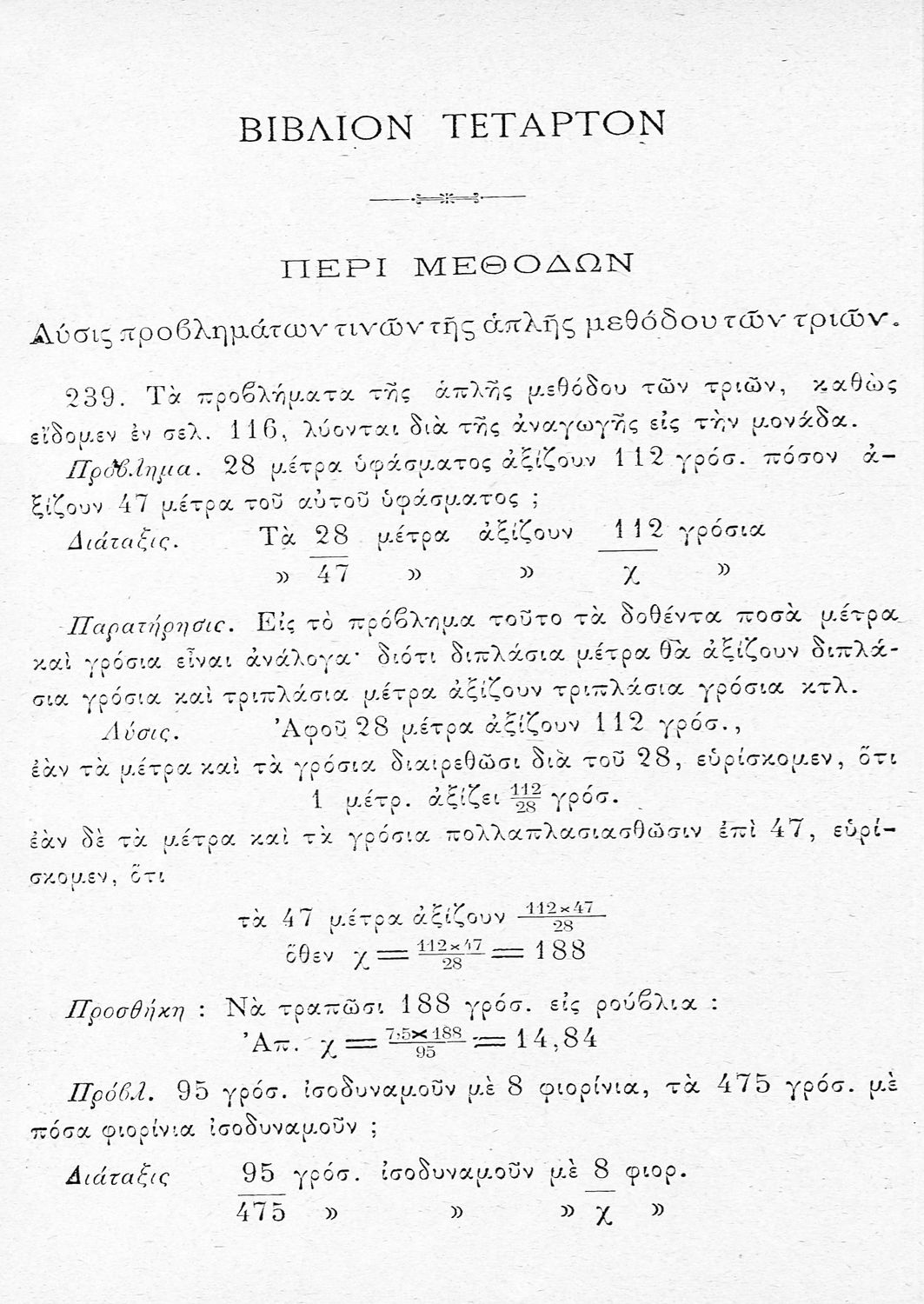 Παρουσίαση περιεχομένου: Σχολικό εγχειρίδιο για τις τάξεις του Ελληνικού, Παρθεναγωγείου, Αστικού και Σχολαρχείου σχολείου για το μάθημα των Μαθηματικών. Το εγχειρίδιο περιλαμβάνει τους στοιχειώδεις κανόνες της αριθμητικής και τις βασικές γνώσεις των Μαθηματικών, τις πρώτες έννοιες των ακεραίων αριθμών, τις 4 βασικές πράξεις, τα κλάσματα, τους δεκαδικούς αριθμούς, τους συμμιγείς αριθμούς, την απλή και σύνθετη μέθοδο των τριών κ.α.
