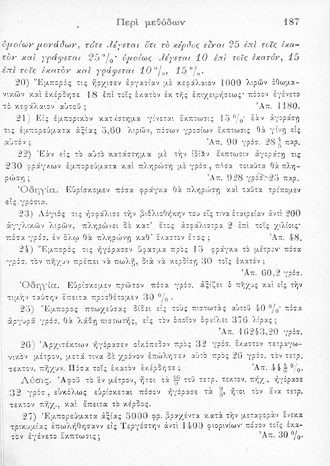 Σχολικό εγχειρίδιο για τις τάξεις του Ελληνικού, Παρθεναγωγείου, Αστικού και Σχολαρχείου σχολείου για το μάθημα των Μαθηματικών. Το εγχειρίδιο περιλαμβάνει τους στοιχειώδεις κανόνες της αριθμητικής και τις βασικές γνώσεις των Μαθηματικών, τις πρώτες έννοιες των ακεραίων αριθμών, τις 4 βασικές πράξεις, τα κλάσματα, τους δεκαδικούς αριθμούς, τους συμμιγείς αριθμούς, την απλή και σύνθετη μέθοδο των τριών κ.α.