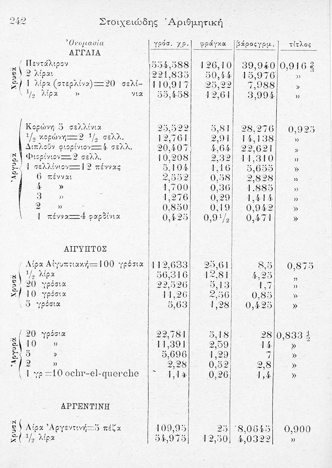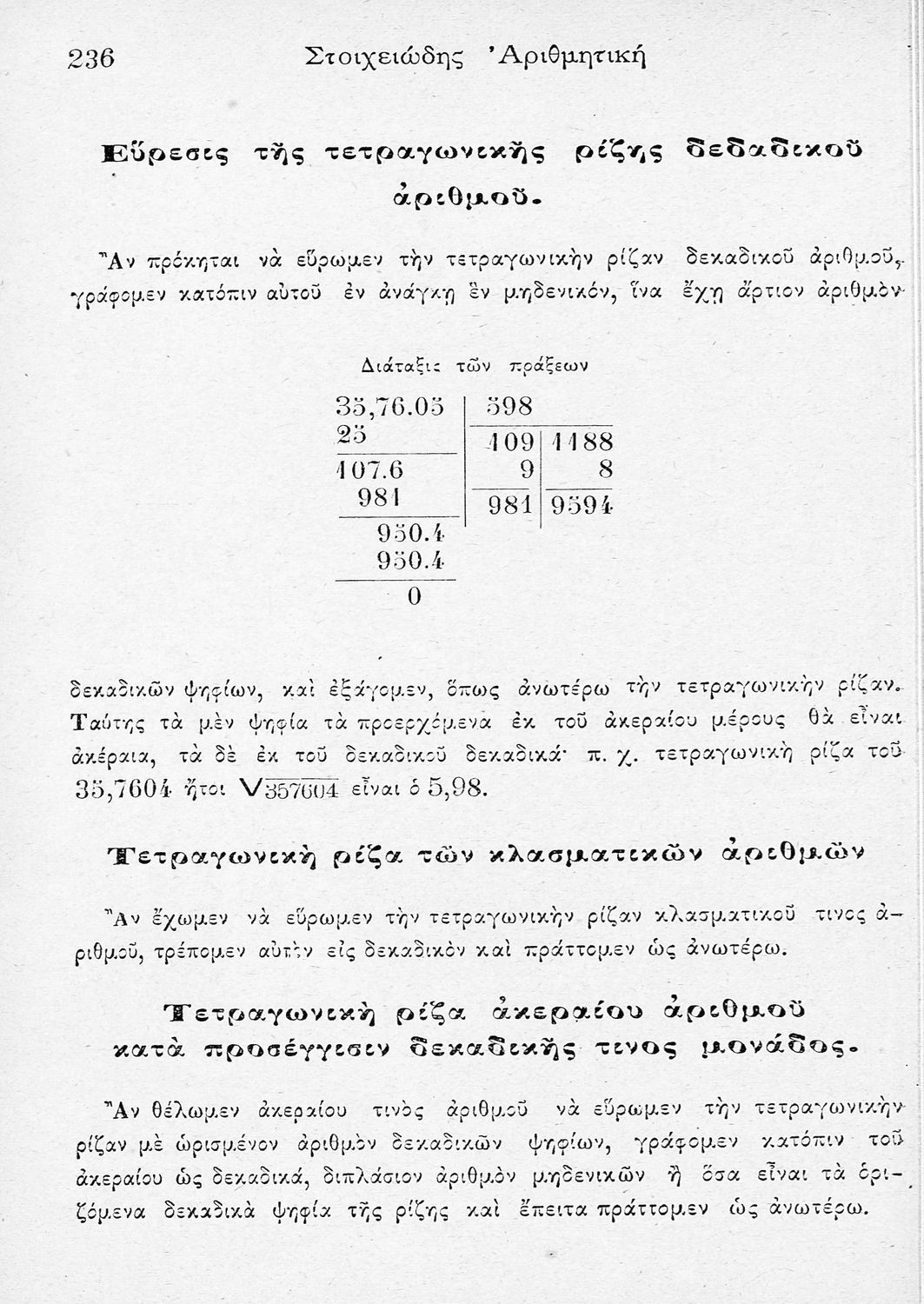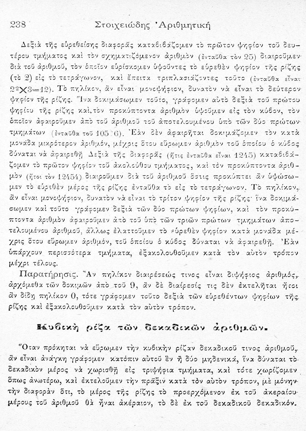Σχολικό εγχειρίδιο για τις τάξεις του Ελληνικού, Παρθεναγωγείου, Αστικού και Σχολαρχείου σχολείου για το μάθημα των Μαθηματικών. Το εγχειρίδιο περιλαμβάνει τους στοιχειώδεις κανόνες της αριθμητικής και τις βασικές γνώσεις των Μαθηματικών, τις πρώτες έννοιες των ακεραίων αριθμών, τις 4 βασικές πράξεις, τα κλάσματα, τους δεκαδικούς αριθμούς, τους συμμιγείς αριθμούς, την απλή και σύνθετη μέθοδο των τριών κ.α.