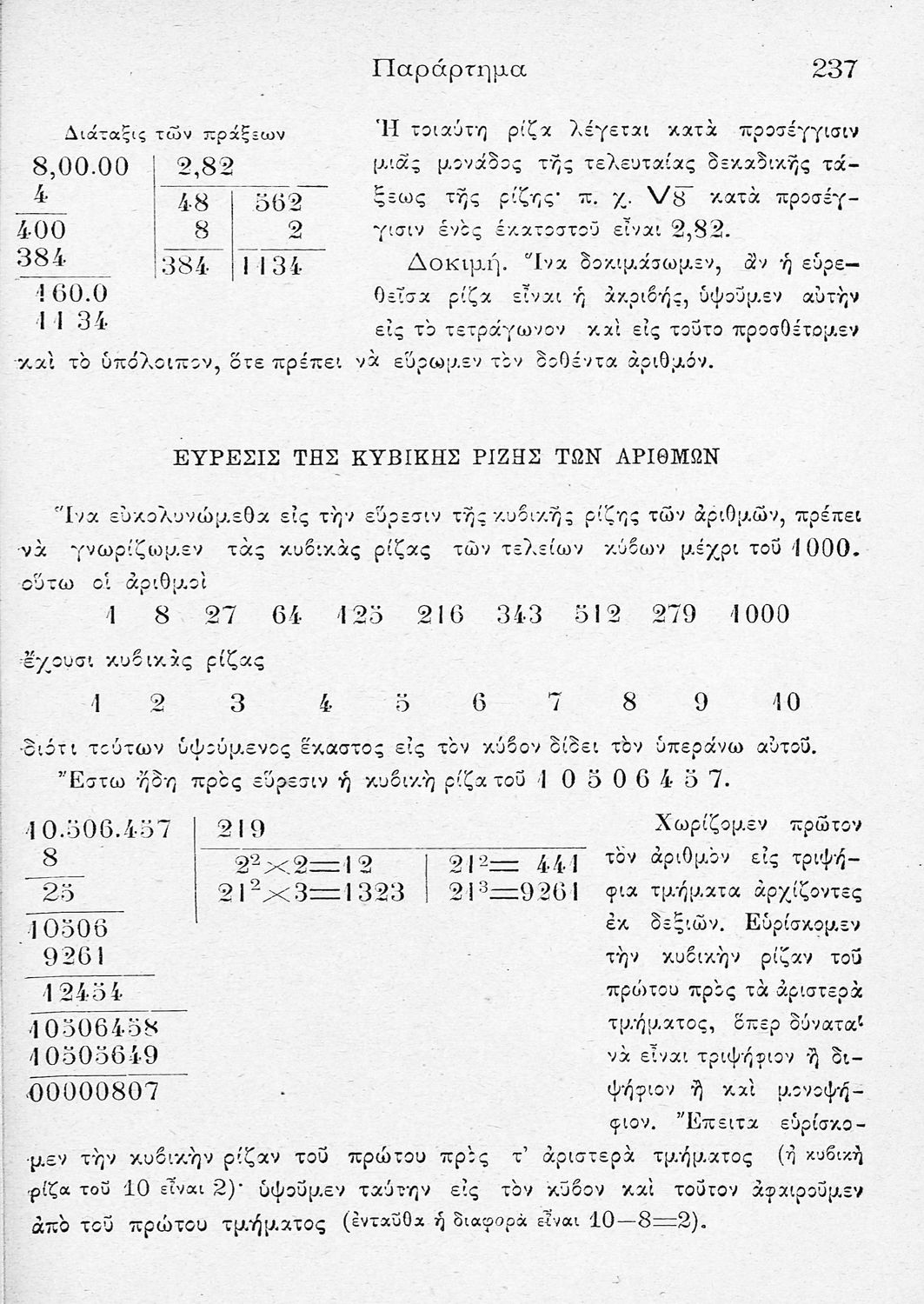 Παρουσίαση περιεχομένου: Σχολικό εγχειρίδιο για τις τάξεις του Ελληνικού, Παρθεναγωγείου, Αστικού και Σχολαρχείου σχολείου για το μάθημα των Μαθηματικών. Το εγχειρίδιο περιλαμβάνει τους στοιχειώδεις κανόνες της αριθμητικής και τις βασικές γνώσεις των Μαθηματικών, τις πρώτες έννοιες των ακεραίων αριθμών, τις 4 βασικές πράξεις, τα κλάσματα, τους δεκαδικούς αριθμούς, τους συμμιγείς αριθμούς, την απλή και σύνθετη μέθοδο των τριών κ.α.
