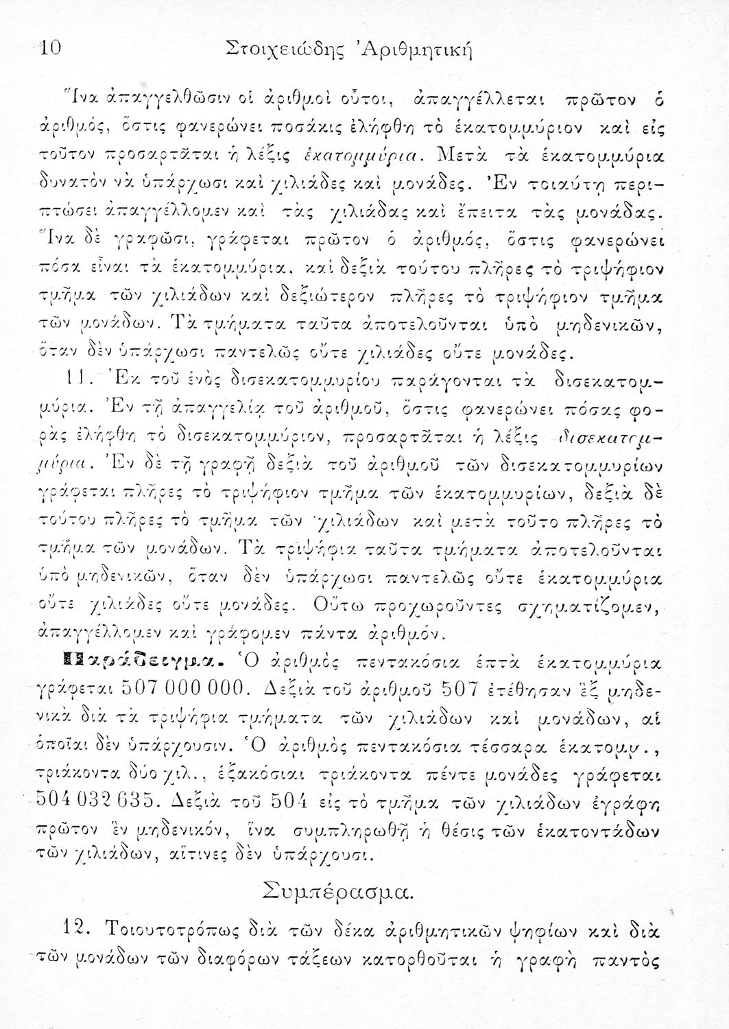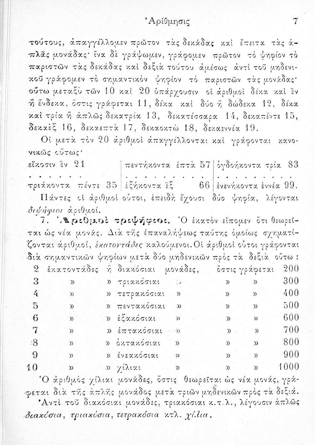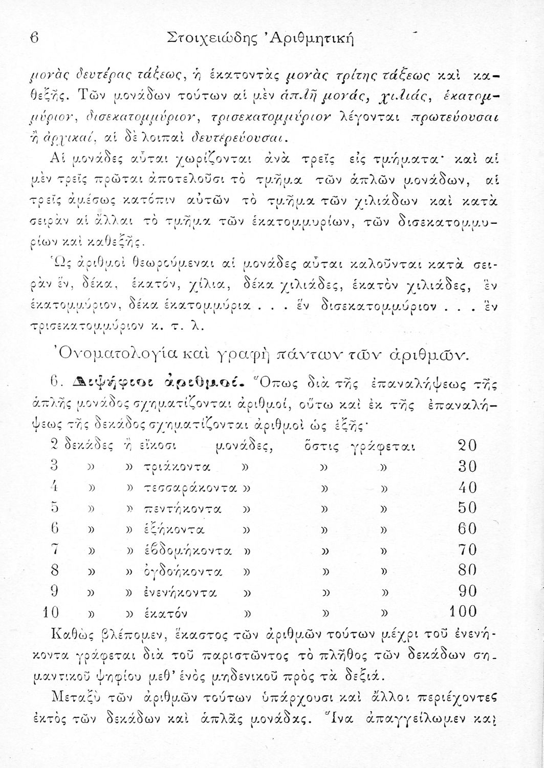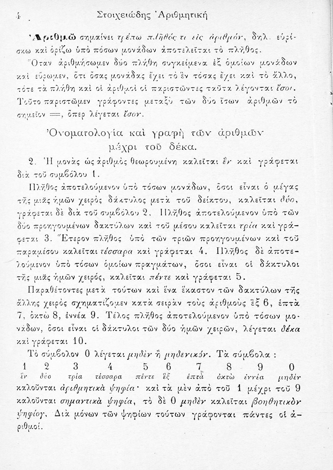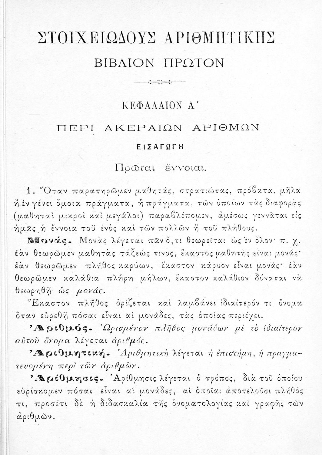Σχολικό εγχειρίδιο για τις τάξεις του Ελληνικού, Παρθεναγωγείου, Αστικού και Σχολαρχείου σχολείου για το μάθημα των Μαθηματικών. Το εγχειρίδιο περιλαμβάνει τους στοιχειώδεις κανόνες της αριθμητικής και τις βασικές γνώσεις των Μαθηματικών, τις πρώτες έννοιες των ακεραίων αριθμών, τις 4 βασικές πράξεις, τα κλάσματα, τους δεκαδικούς αριθμούς, τους συμμιγείς αριθμούς, την απλή και σύνθετη μέθοδο των τριών κ.α.