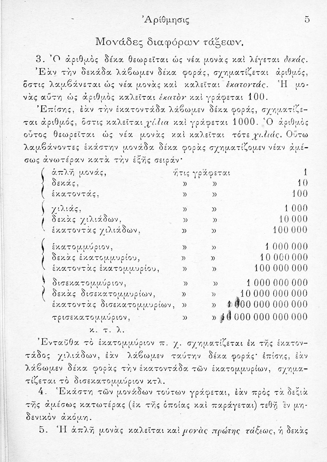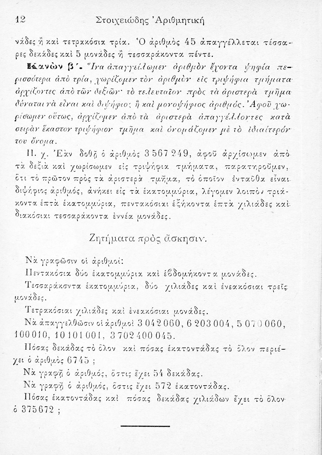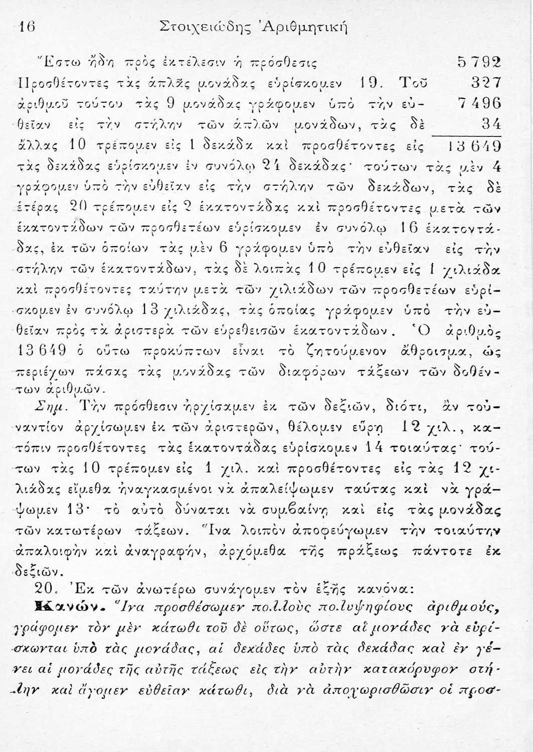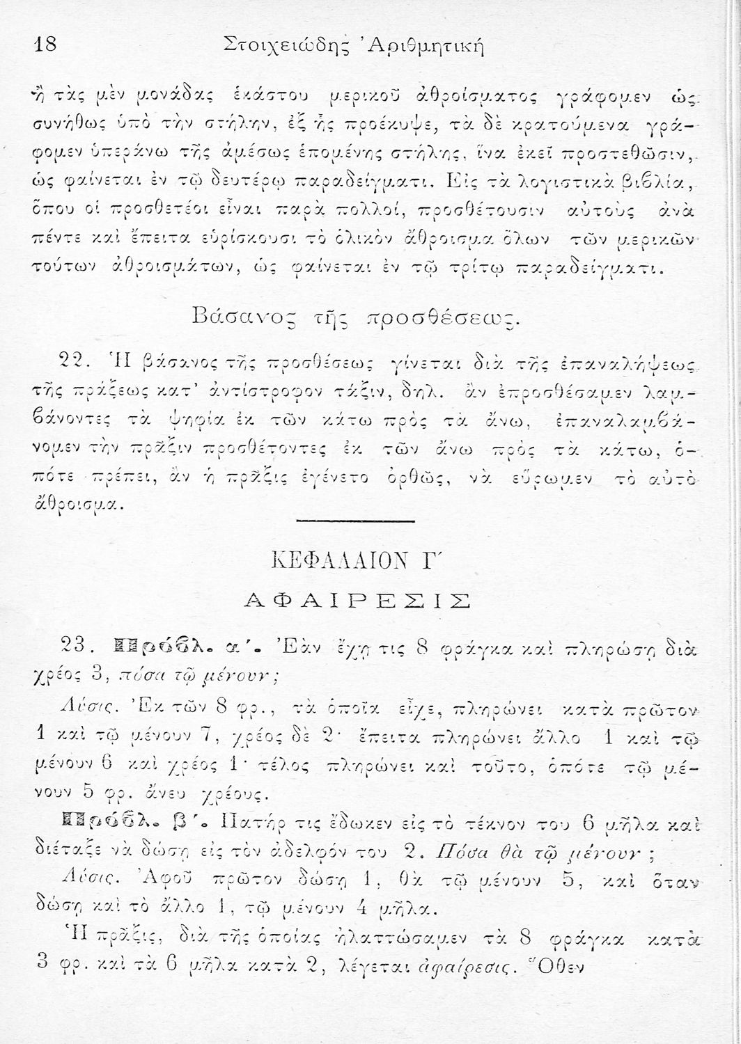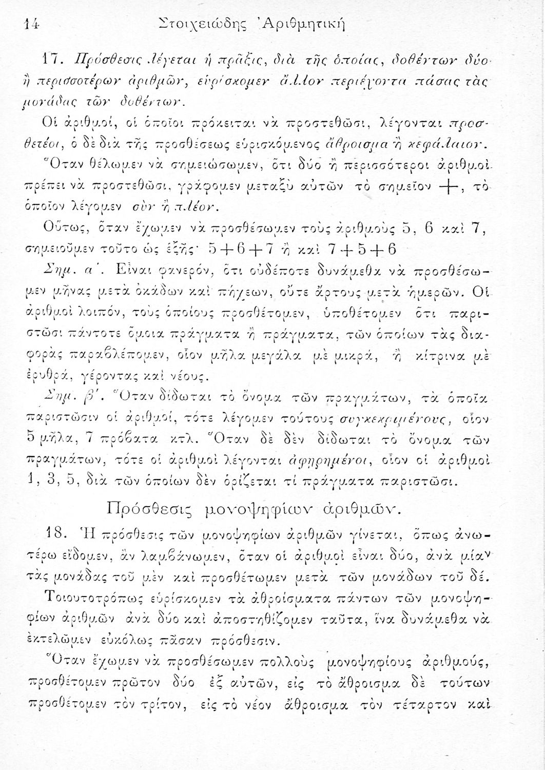 Σχολικό εγχειρίδιο για τις τάξεις του Ελληνικού, Παρθεναγωγείου, Αστικού και Σχολαρχείου σχολείου για το μάθημα των Μαθηματικών. Το εγχειρίδιο περιλαμβάνει τους στοιχειώδεις κανόνες της αριθμητικής και τις βασικές γνώσεις των Μαθηματικών, τις πρώτες έννοιες των ακεραίων αριθμών, τις 4 βασικές πράξεις, τα κλάσματα, τους δεκαδικούς αριθμούς, τους συμμιγείς αριθμούς, την απλή και σύνθετη μέθοδο των τριών κ.α.