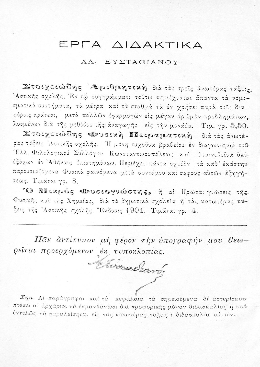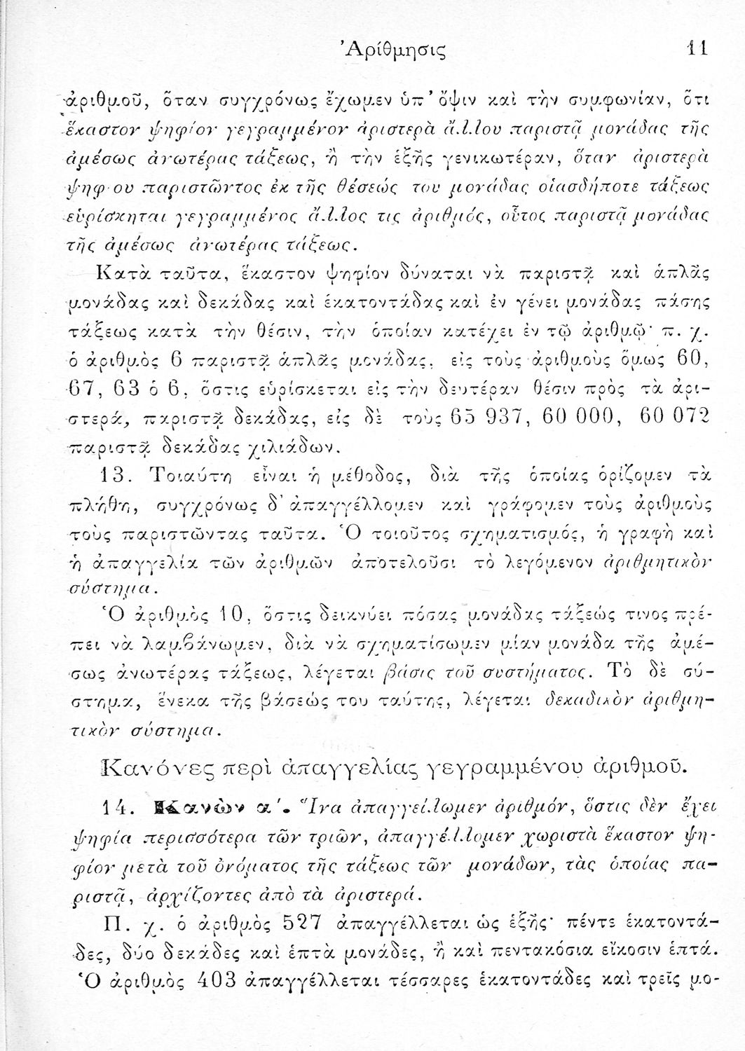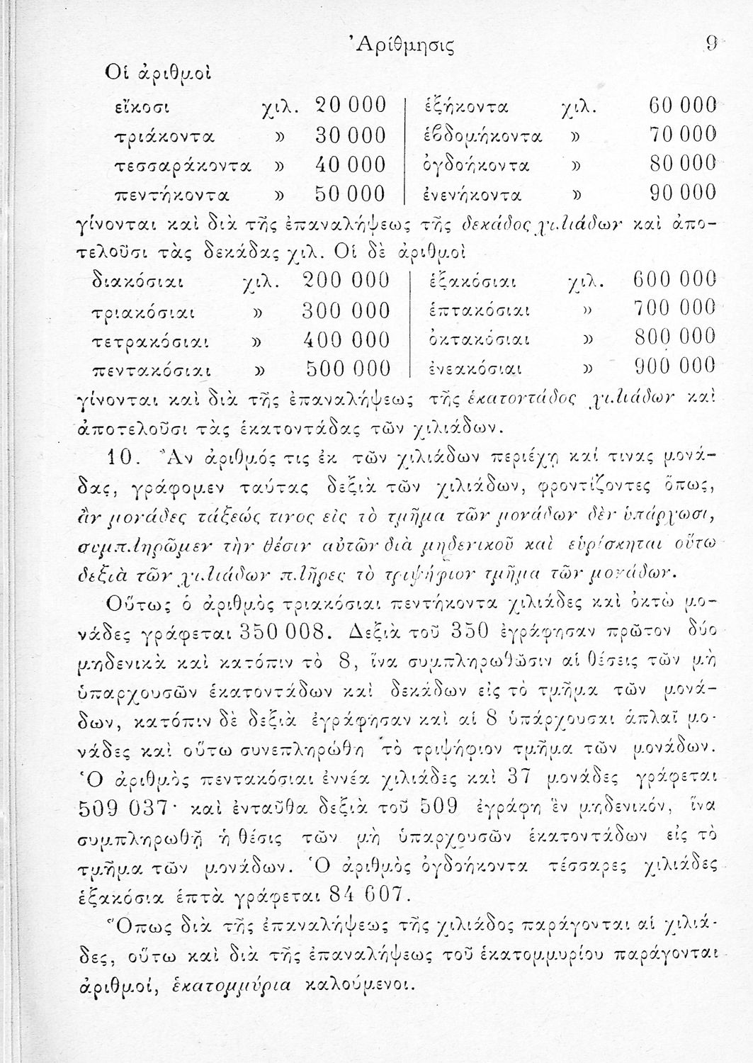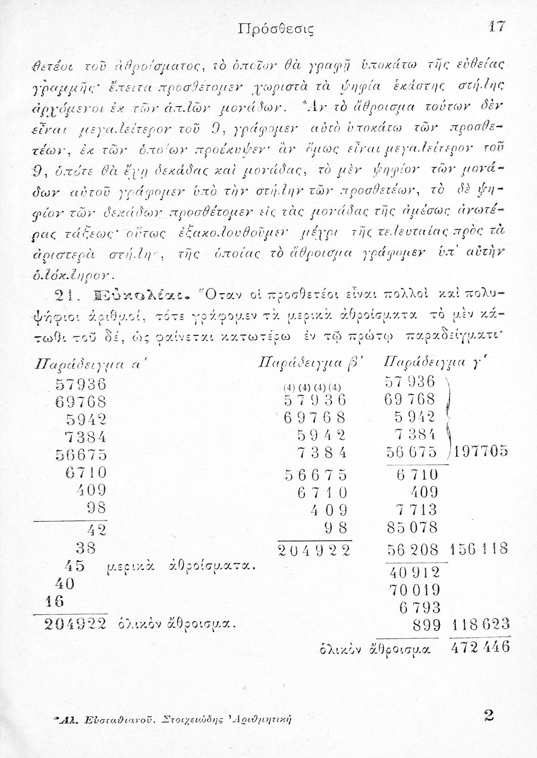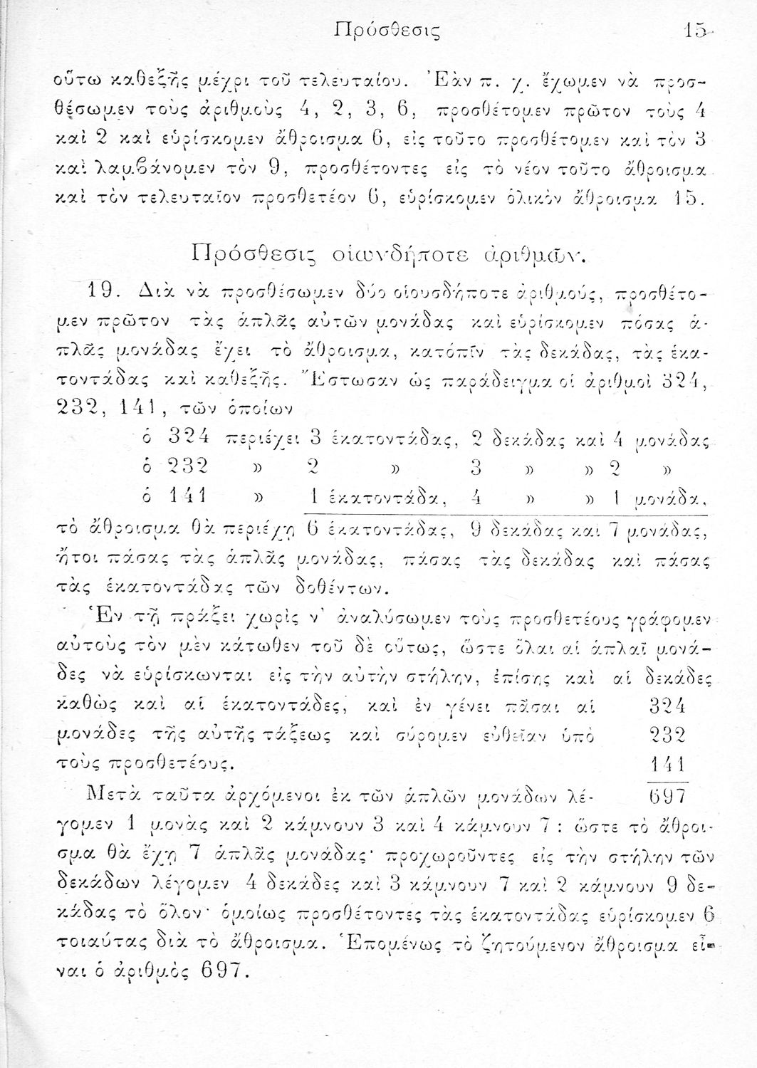 Σχολικό εγχειρίδιο για τις τάξεις του Ελληνικού, Παρθεναγωγείου, Αστικού και Σχολαρχείου σχολείου για το μάθημα των Μαθηματικών. Το εγχειρίδιο περιλαμβάνει τους στοιχειώδεις κανόνες της αριθμητικής και τις βασικές γνώσεις των Μαθηματικών, τις πρώτες έννοιες των ακεραίων αριθμών, τις 4 βασικές πράξεις, τα κλάσματα, τους δεκαδικούς αριθμούς, τους συμμιγείς αριθμούς, την απλή και σύνθετη μέθοδο των τριών κ.α.