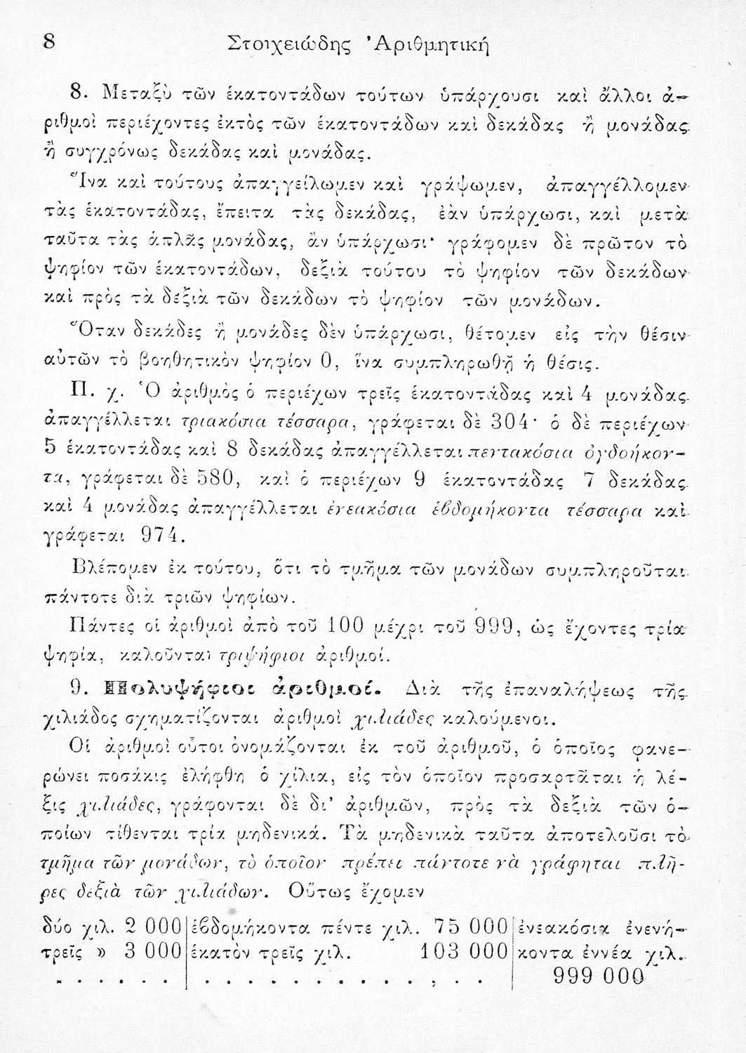 Παρουσίαση περιεχομένου: Σχολικό εγχειρίδιο για τις τάξεις του Ελληνικού, Παρθεναγωγείου, Αστικού και Σχολαρχείου σχολείου για το μάθημα των Μαθηματικών. Το εγχειρίδιο περιλαμβάνει τους στοιχειώδεις κανόνες της αριθμητικής και τις βασικές γνώσεις των Μαθηματικών, τις πρώτες έννοιες των ακεραίων αριθμών, τις 4 βασικές πράξεις, τα κλάσματα, τους δεκαδικούς αριθμούς, τους συμμιγείς αριθμούς, την απλή και σύνθετη μέθοδο των τριών κ.α.