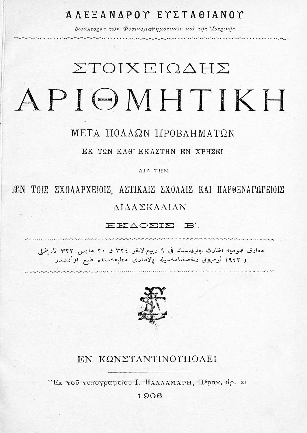 Στοιχειώδης αριθμητική μετά πολλών προβλημάτων εκ των καθ' εκάστην εν χρήσει διά την εν σχολαρχείοις, αστικαίς σχολαίς και παρθεναγωγείοις διδασκαλίαν