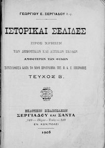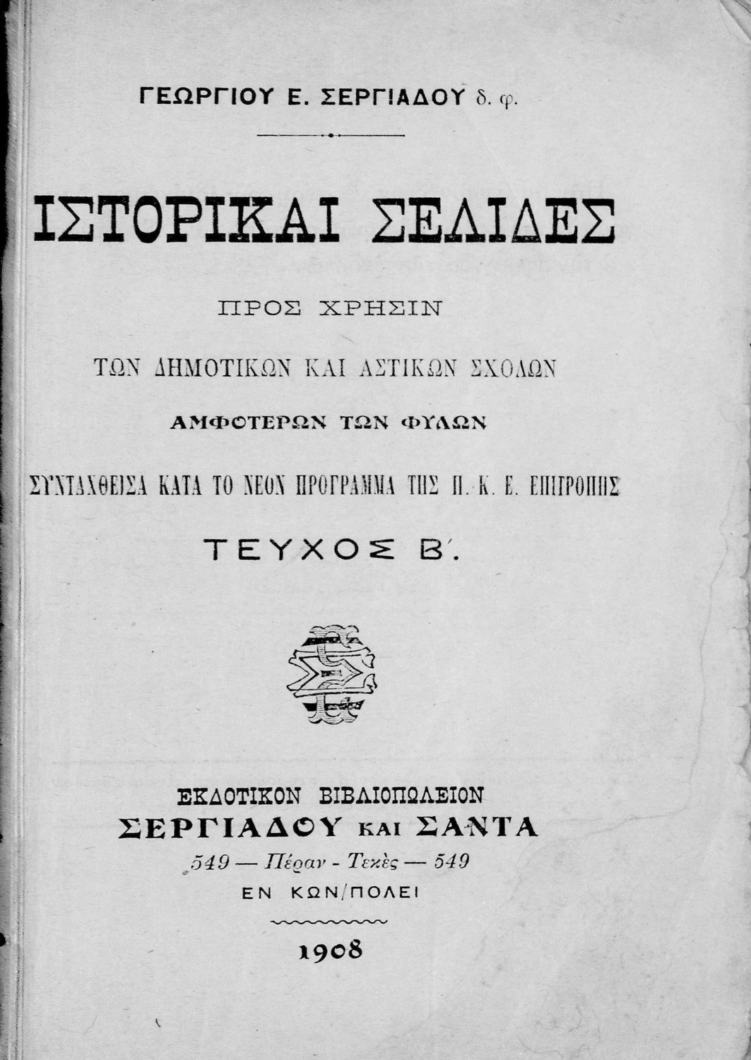 Κωδικός αναγνώρισης: 09-12962 Τίτλος: Ιστορικαί σελίδες προς χρήσιν των Δημοτικών και Αστικών Σχολών αμφοτέρων των φύλων, τεύχος Β΄ Συγγραφέας: Γεώργιος Ε. Σεργιάδης Μέγεθος και υπόστρωμα: Σχολικό εγχειρίδιο, μαλακό εξώφυλλο, 112 σελίδες. Σκίτσα (ασπρόμαυρα). |