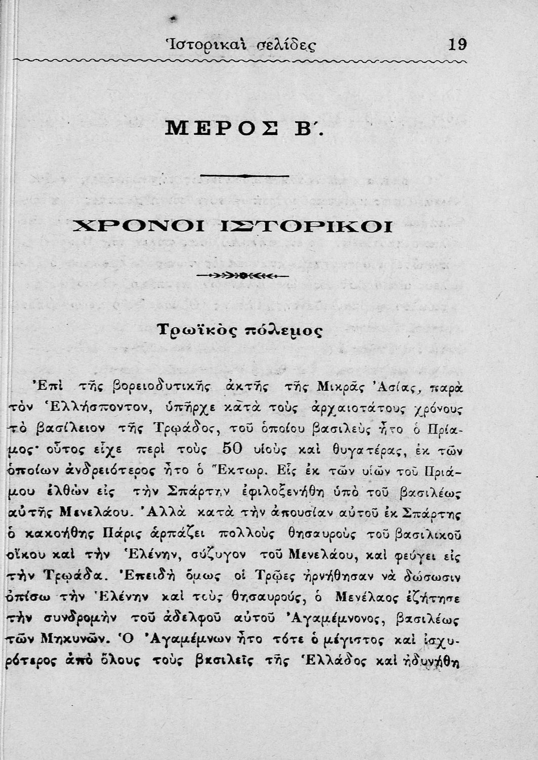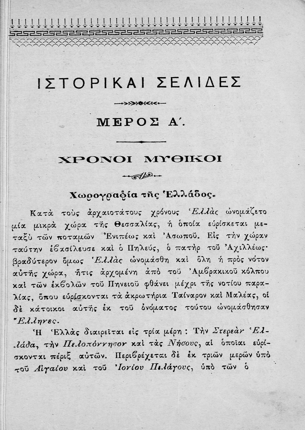 Βαθμίδα εκπαίδευσης: Πρωτοβάθμια, Δευτεροβάθμια Τάξη: Δημοτικό / Αστικό Σχολείο Μάθημα: Ιστορία Γλώσσα: Καθαρεύουσα Παρουσίαση περιεχομένου: Σχολικό εγχειρίδιο Ιστορίας. Δημοτικού και Αστικού Σχολείου που καλύπτει την περίοδο από τους μυθικούς και ηρωικούς χρόνους μέχρι τη Μακεδονική Ηγεμονία |