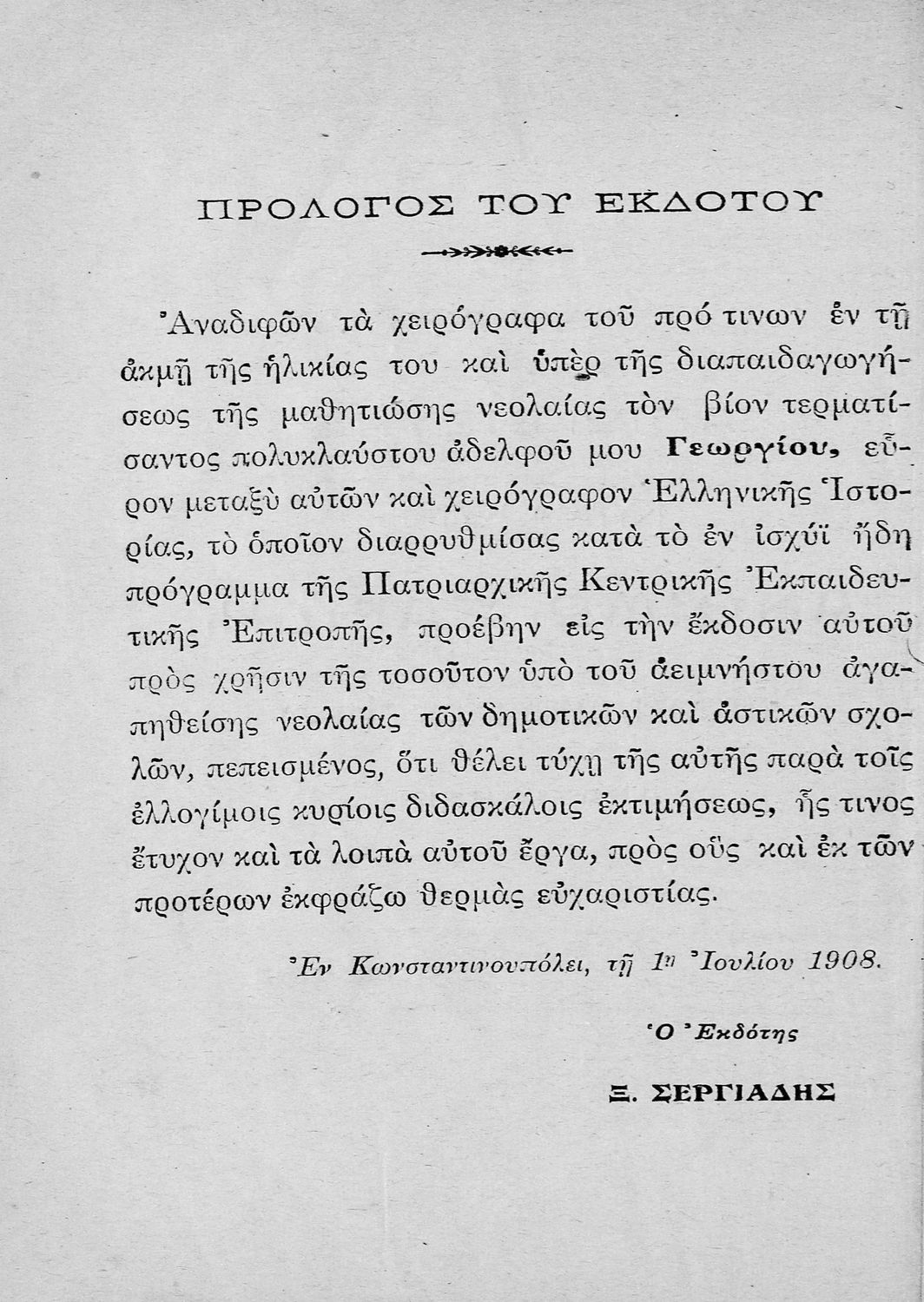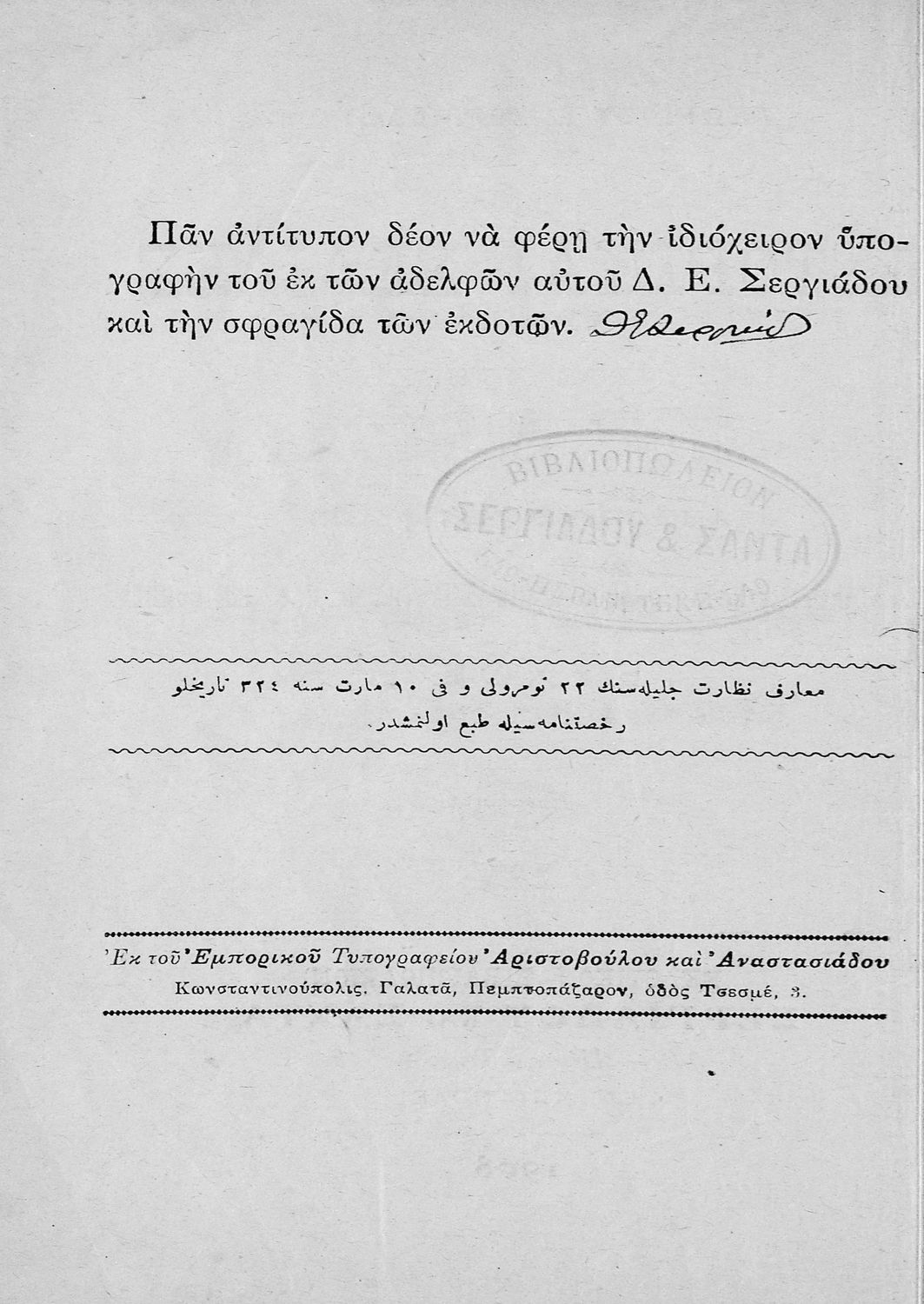 Εκδότης: Σάντας και Σεργιάδης Έτος έκδοσης: 1908 Τόπος έκδοσης: Κωνσταντινούπολη |