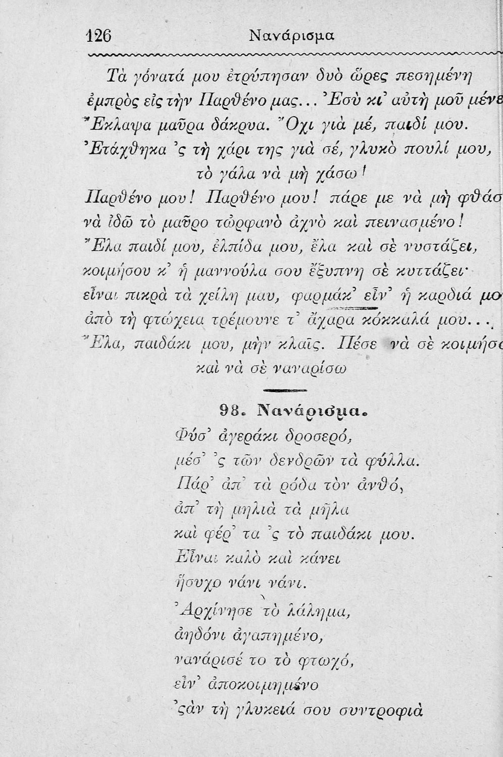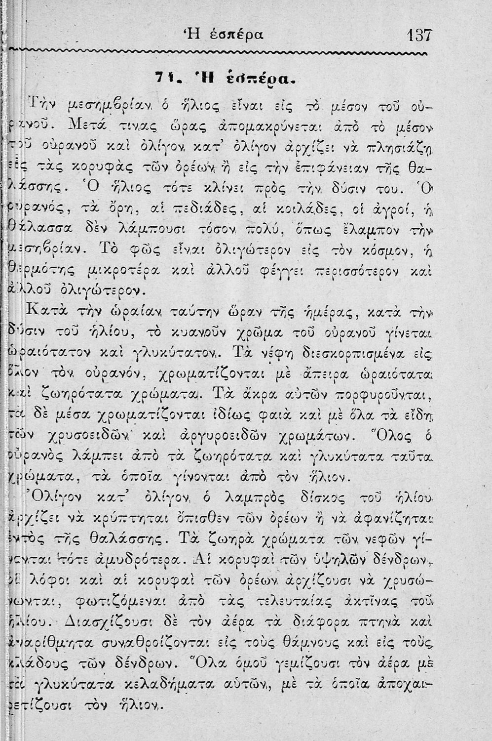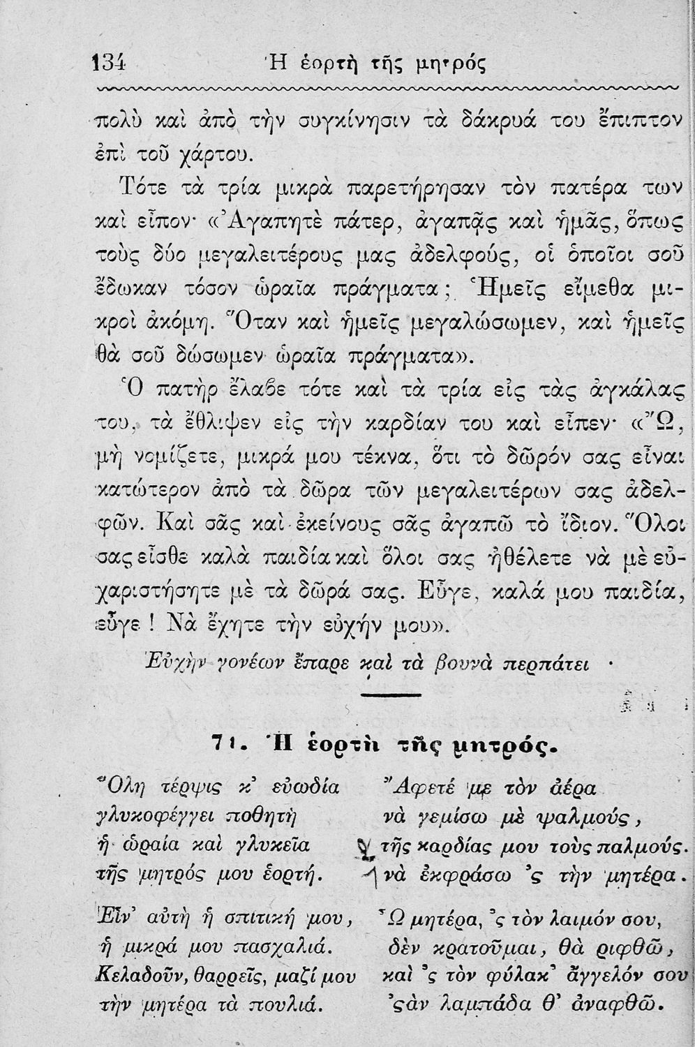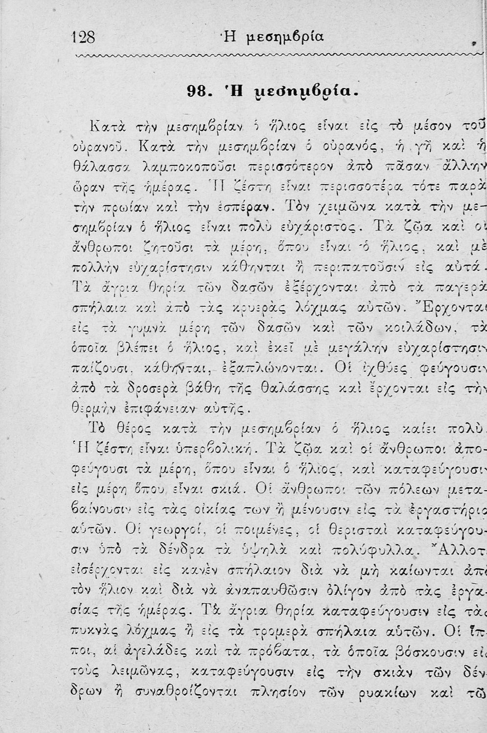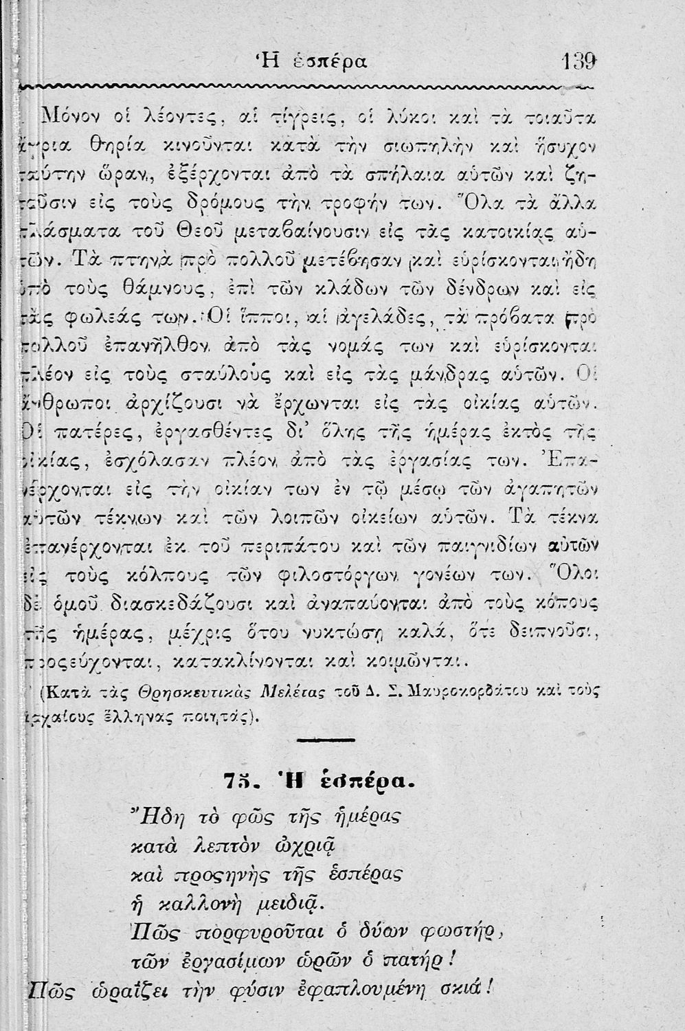 Βαθμίδα εκπαίδευσης: Πρωτοβάθμια Τάξη: Β' Δημοτικού Μάθημα: Νέα Ελληνικά Γλώσσα: Καθαρεύουσα Παρουσίαση περιεχομένου: Αναγνωστικό Β' Δημοτικού που περιλαμβάνει ποιήματα και πεζά ηθοποιητικού περιεχομένου. |
