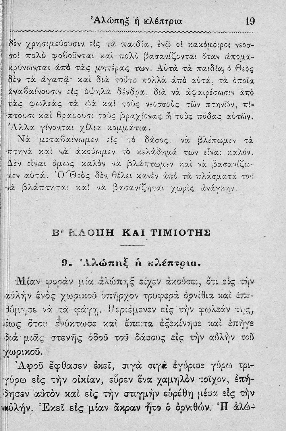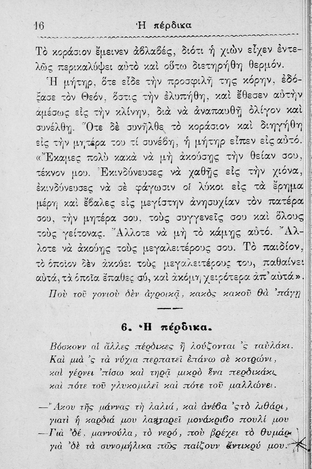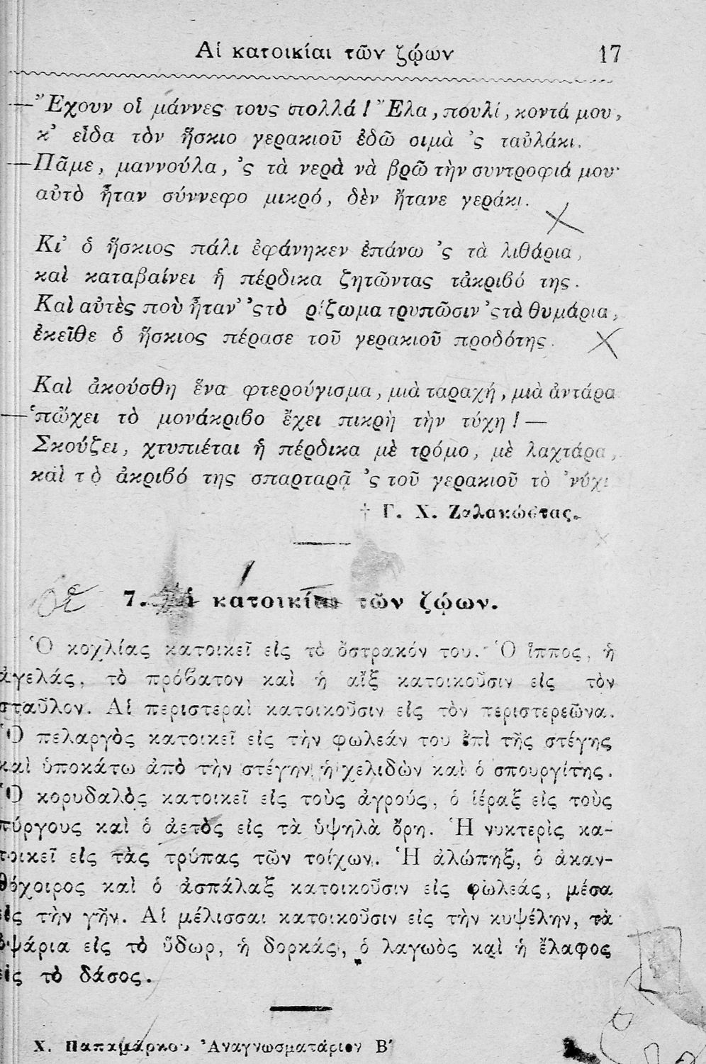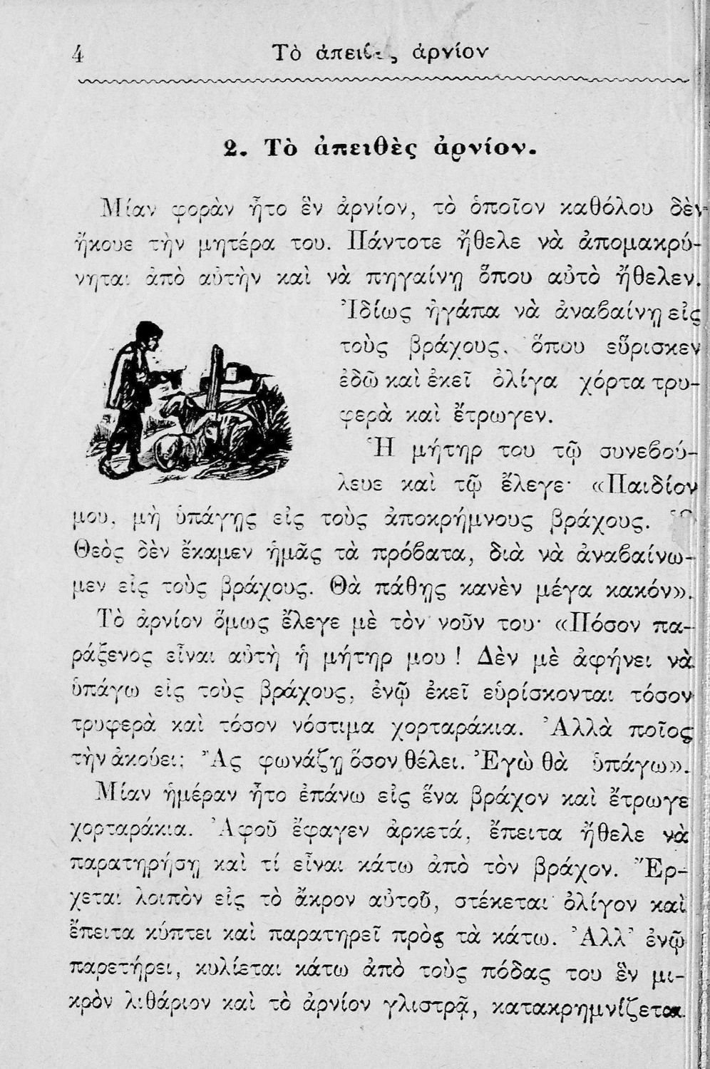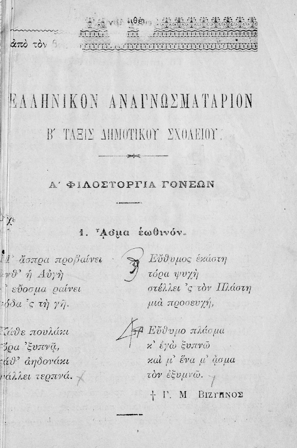 Βαθμίδα εκπαίδευσης: Πρωτοβάθμια Τάξη: Β' Δημοτικού Μάθημα: Νέα Ελληνικά Γλώσσα: Καθαρεύουσα Παρουσίαση περιεχομένου: Αναγνωστικό Β' Δημοτικού που περιλαμβάνει ποιήματα και πεζά ηθοποιητικού περιεχομένου. |