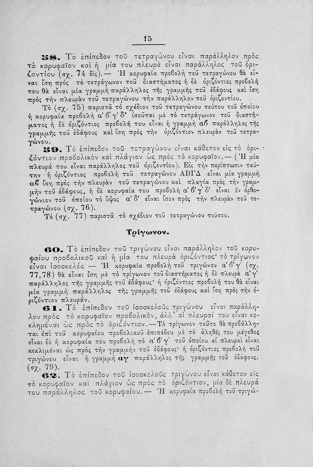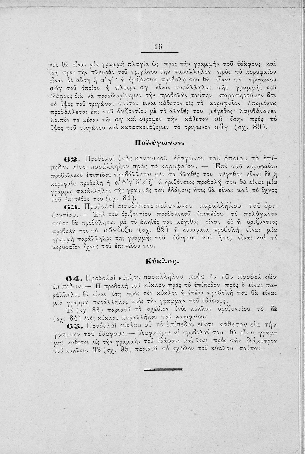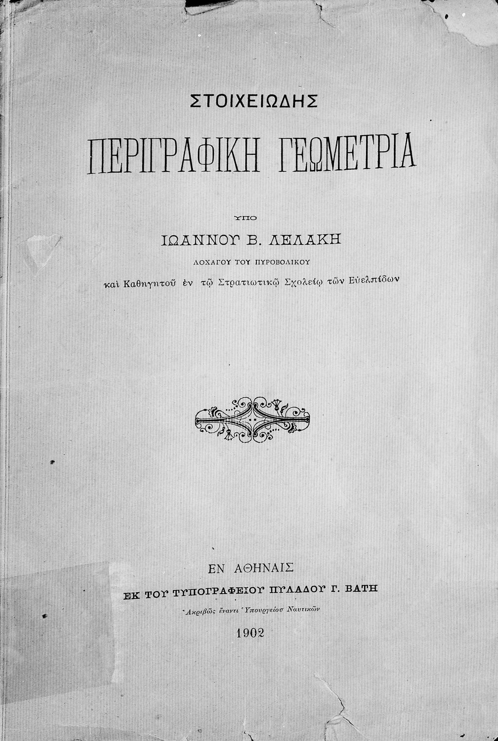 Μάθημα: Μαθηματικά Γλώσσα: Καθαρεύουσα Παρουσίαση περιεχομένου: Πρόκειται για εγχειρίδιο για το μάθημα των Μαθηματικών και συγκεκριμένα της Γεωμετρίας. Μπορεί να απευθύνεται σε μαθητές και μαθήτριες των στρατιωτικών σχολών λόγω της ιδιότητα του συγγραφέα (Λοχαγός Πυροβολικού και καθηγητής στην σχολή Ευελπίδων) αλλά δεν αναγράφεται πουθενά ξεκάθαρα αν πρόκειται για μαθητικό ή παιδαγωγικό βοήθημα. Το βιβλίο περιγράφει πολύ συνοπτικά τις βασικές έννοιες της γεωμετρίας, τα βασικά γνωρίσματα της ευθείας γραμμής και των γεωμετρικών σχημάτων του τετραγώνου, τριγώνου, κύκλου, κύβου, κυλίνδρου, πυραμίδας, κώνου κ.α. Το δεύτερο μέρος του βιβλίου συμπληρώνεται με την αναπαράσταση αυτών των σχημάτων. |