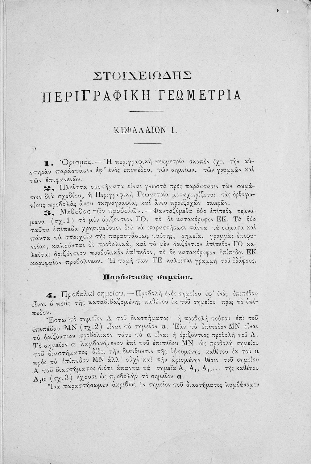 LDR 01913 2200181 4500 035 ## _a09-142455 040 ## _aΑκαδημία Αθηνών 041 ## _ael 100 ## _aΙωάννης Β. Λελάκης 110 ## _a142455 245 0# _aΣτοιχειώδης περιγραφική γεωμετρία 260 ## _aΑθήνα _bΠυλάδος Γ. Βατής _c1902 300 ## _a44 _bΣχεδιαγράμματα (ασπρόμαυρα) 520 ## _aΠρόκειται για εγχειρίδιο για το μάθημα των Μαθηματικών και συγκεκριμένα της Γεωμετρίας. Μπορεί να απευθύνεται σε μαθητές και μαθήτριες των στρατιωτικών σχολών λόγω της ιδιότητα του συγγραφέα (Λοχαγός Πυροβολικού και καθηγητής στην σχολή Ευελπίδων) αλλά δεν αναγράφεται πουθενά ξεκάθαρα αν πρόκειται για μαθητικό ή παιδαγωγικό βοήθημα. Το βιβλίο περιγράφει πολύ συνοπτικά τις βασικές έννοιες της γεωμετρίας, τα βασικά γνωρίσματα της ευθείας γραμμής και των γεωμετρικών σχημάτων του τετραγώνου, τριγώνου, κύκλου, κύβου, κυλίνδρου, πυραμίδας, κώνου κ.α. Το δεύτερο μέρος του βιβλίου συμπληρώνεται με την αναπαράσταση αυτών των σχημάτων. 522 ## _aΕλλάδα 546 ## _aΚαθαρεύουσα 563 ## _aΜαλακό Εξώφυλλο 650 #4 _aΓεωμετρικά σχήματα _aΓυμνασίου _aΕπίπεδο _aΕυθεία _aΚαθαρεύουσα _aΜαθηματικά _aΠεριγραφική γεωμετρία _aΠροβολές