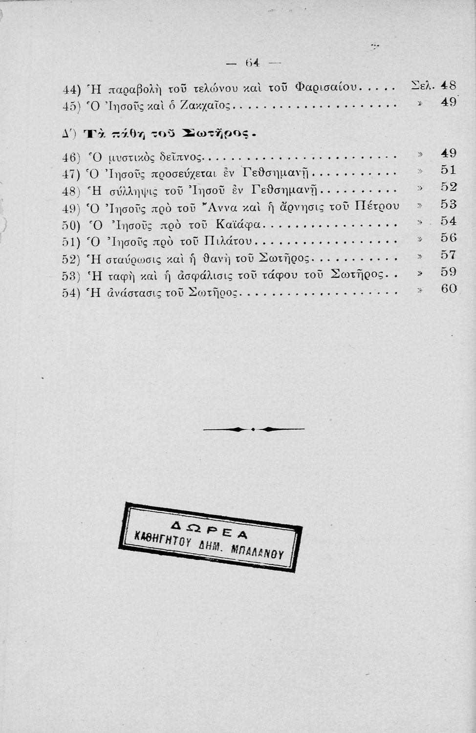 Κωδικός αναγνώρισης: 09-14261 Τίτλος: Ερμηνεία περικοπών του Ευαγγελίου αναφερομένων εις τον βίον, τα θαύματα και την διδασκαλίαν του Σωτήρος κατά το τελευταίον πρόγραμμα του υπουργείου των εκκλησιαστικών και της δημ. Εκπαιδεύσεως διά την Ε΄ και ΣΤ΄ τάξιν Συγγραφέας: Δημήτριος Σίμος Μπαλάνος Μέγεθος και υπόστρωμα: Σχολικό εγχειρίδιο, σκληρό εξώφυλλο, 70 σελίδες. Χάρτης (ασπρόμαυρος). |
