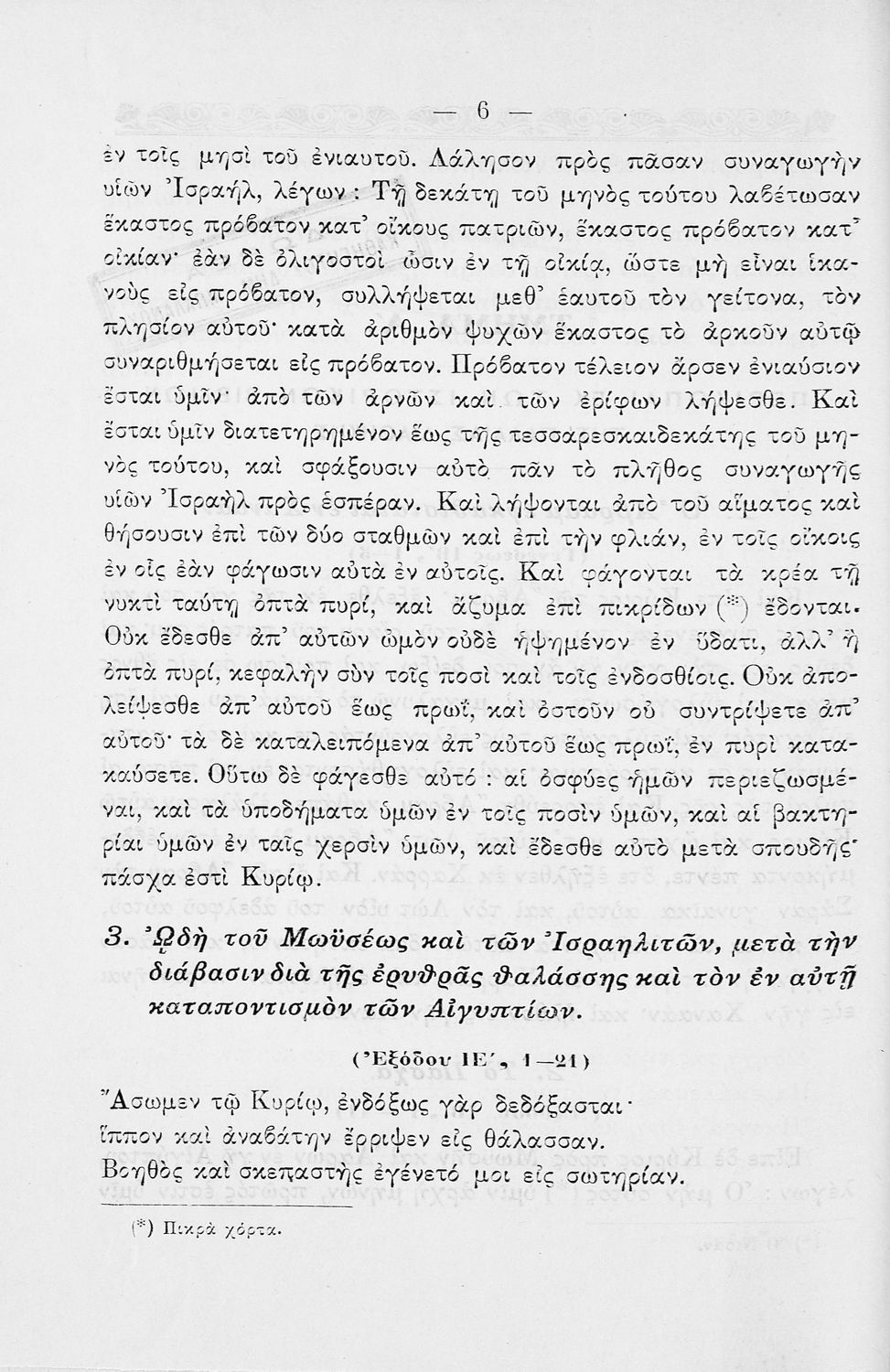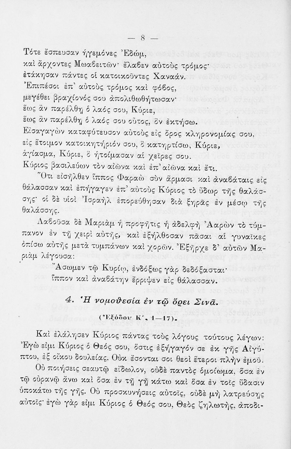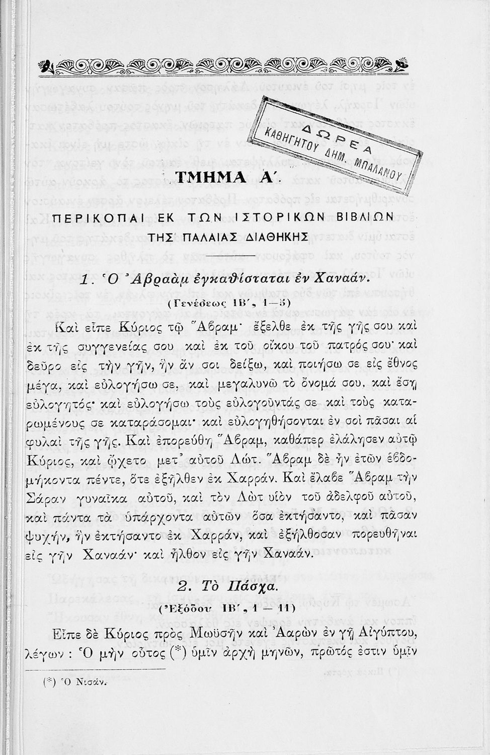 Σχολικό εγχειρίδιο για την Α' Διδασκαλείου για το μάθημα των Θρησκευτικών. Το εγχειρίδιο αποτελείται από 3 μέρη. Το πρώτο μέρος περιλαμβάνει αποσπάσματα από τα ιστορικά βιβλία της Παλαιάς Διαθήκης, το δεύτερο μέρος αφιερώνεται στα ποιητικά βιβλία της Παλαιάς Διαθήκης και το τρίτο μέρος ασχολείται με τα προφητικά βιβλία της Παλαιάς Διαθήκης,