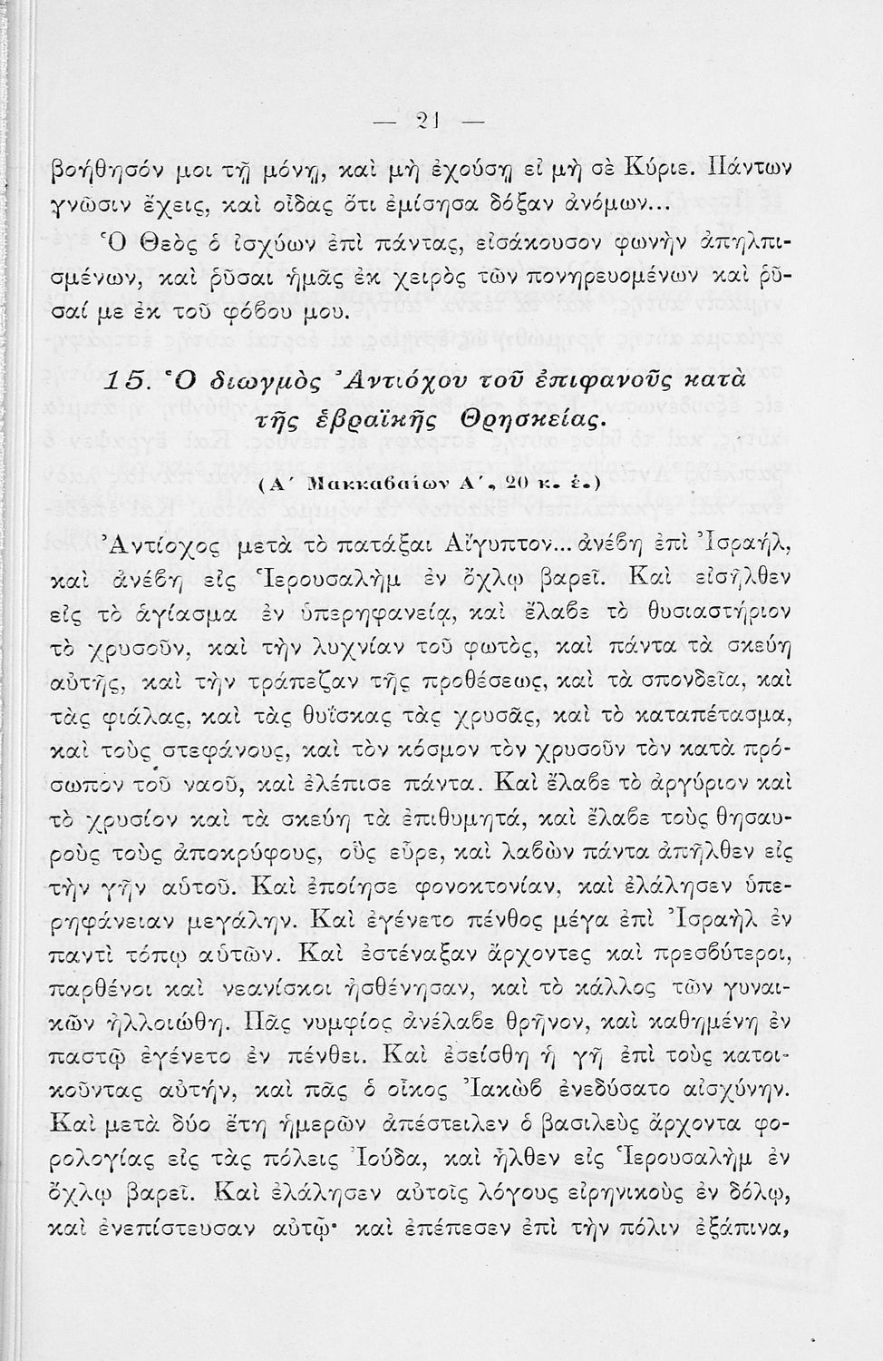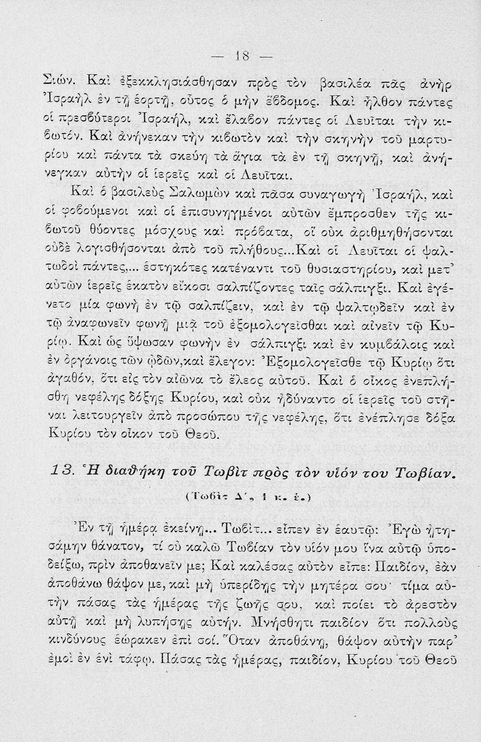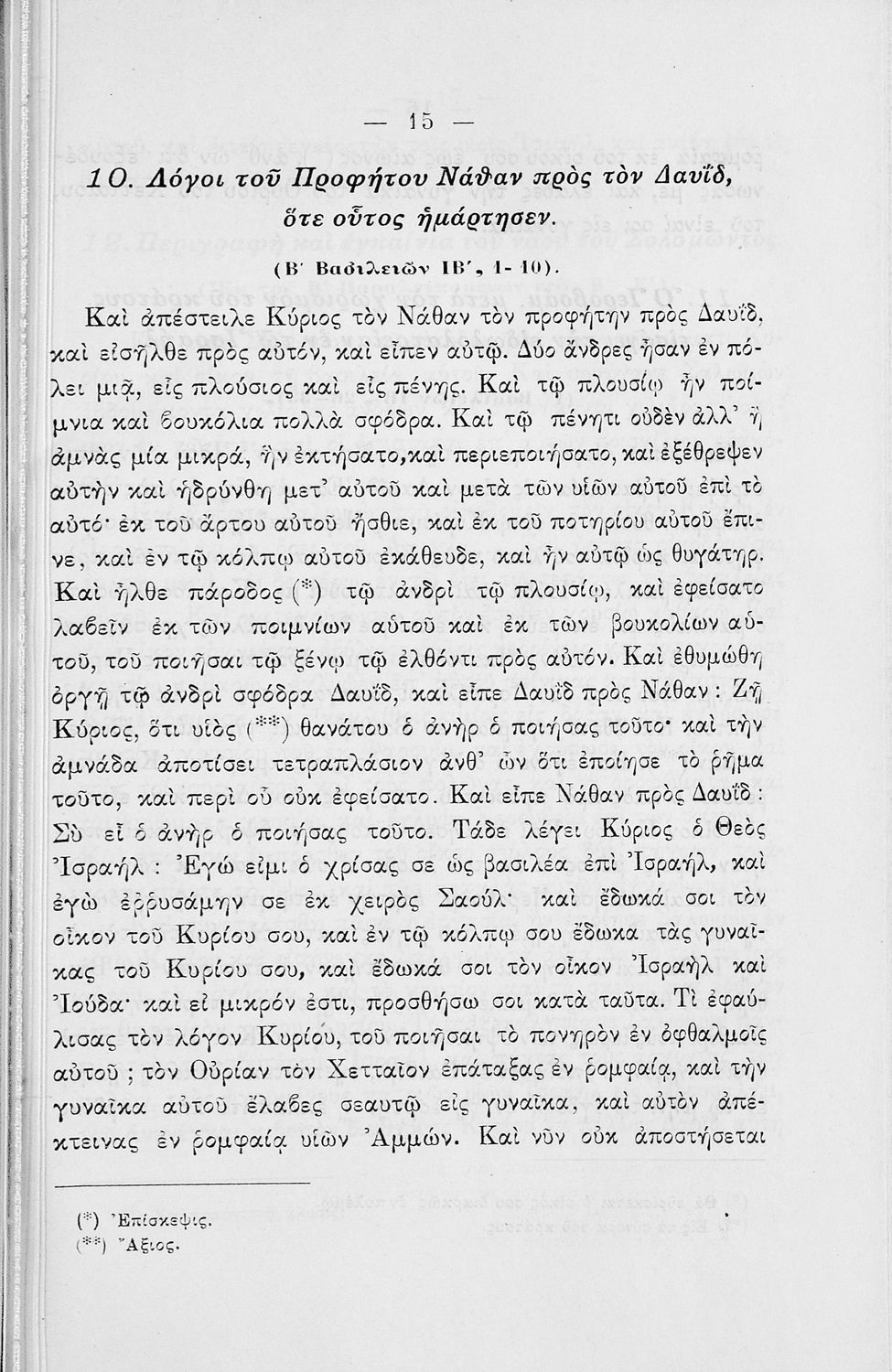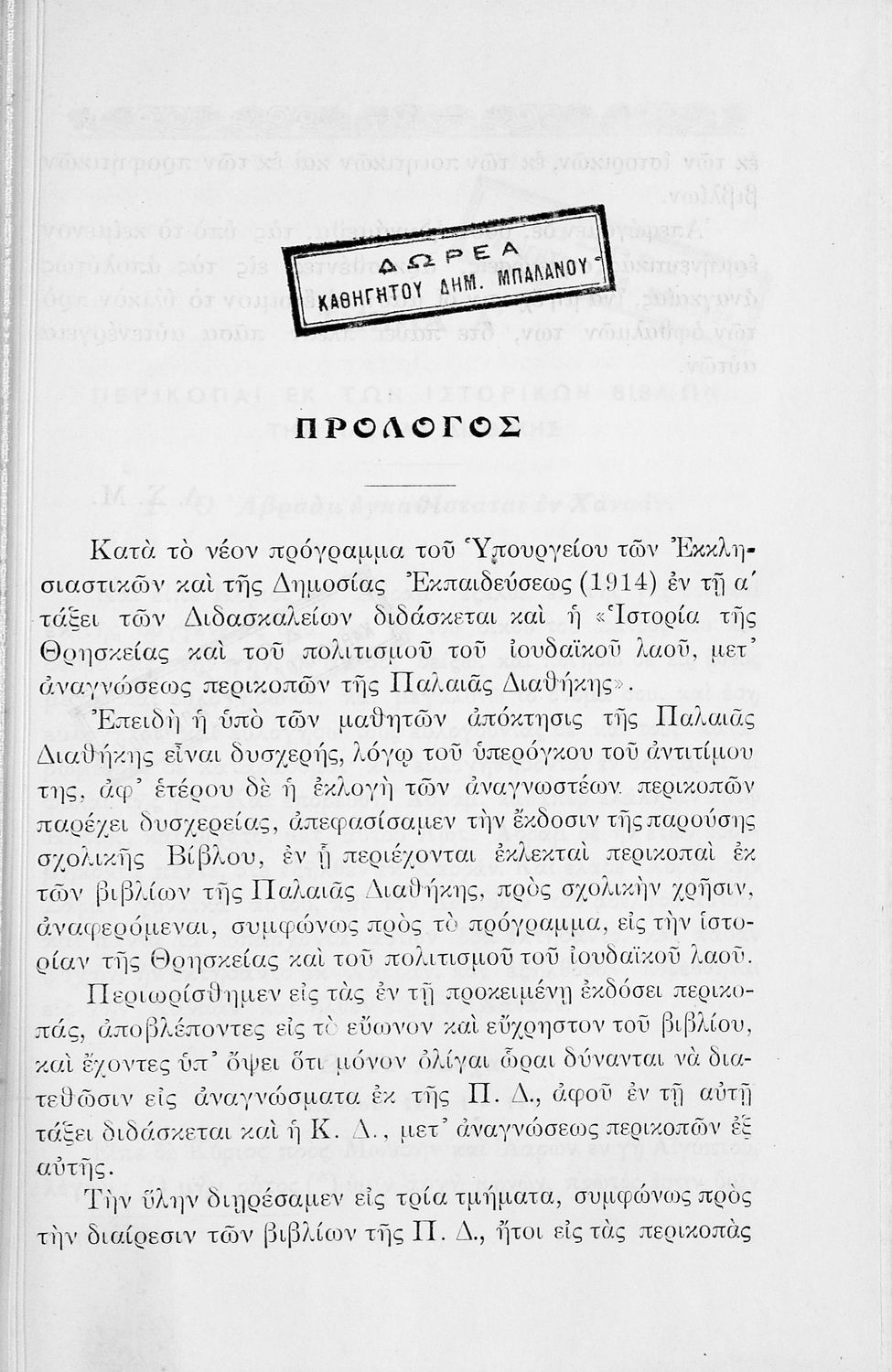 Βαθμίδα εκπαίδευσης: Δευτεροβάθμια Τάξη: Α' Διδασκαλείου Μάθημα: Θρησκευτικά Γλώσσα: Καθαρεύουσα Παρουσίαση περιεχομένου: Σχολικό εγχειρίδιο για την Α' Διδασκαλείου για το μάθημα των Θρησκευτικών. Το εγχειρίδιο αποτελείται από 3 μέρη. Το πρώτο μέρος περιλαμβάνει αποσπάσματα από τα ιστορικά βιβλία της Παλαιάς Διαθήκης, το δεύτερο μέρος αφιερώνεται στα ποιητικά βιβλία της Παλαιάς Διαθήκης και το τρίτο μέρος ασχολείται με τα προφητικά βιβλία της Παλαιάς Διαθήκης, |