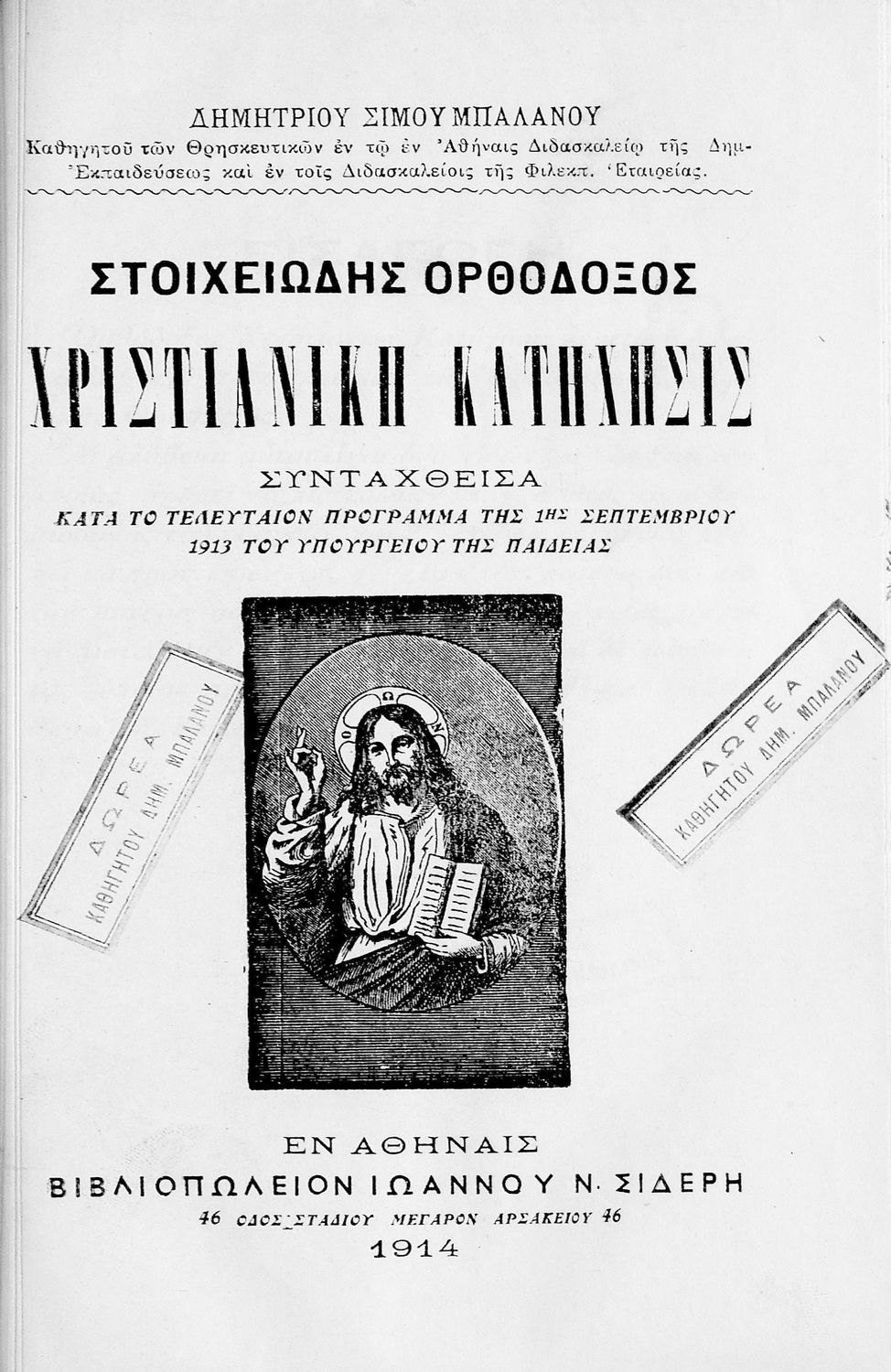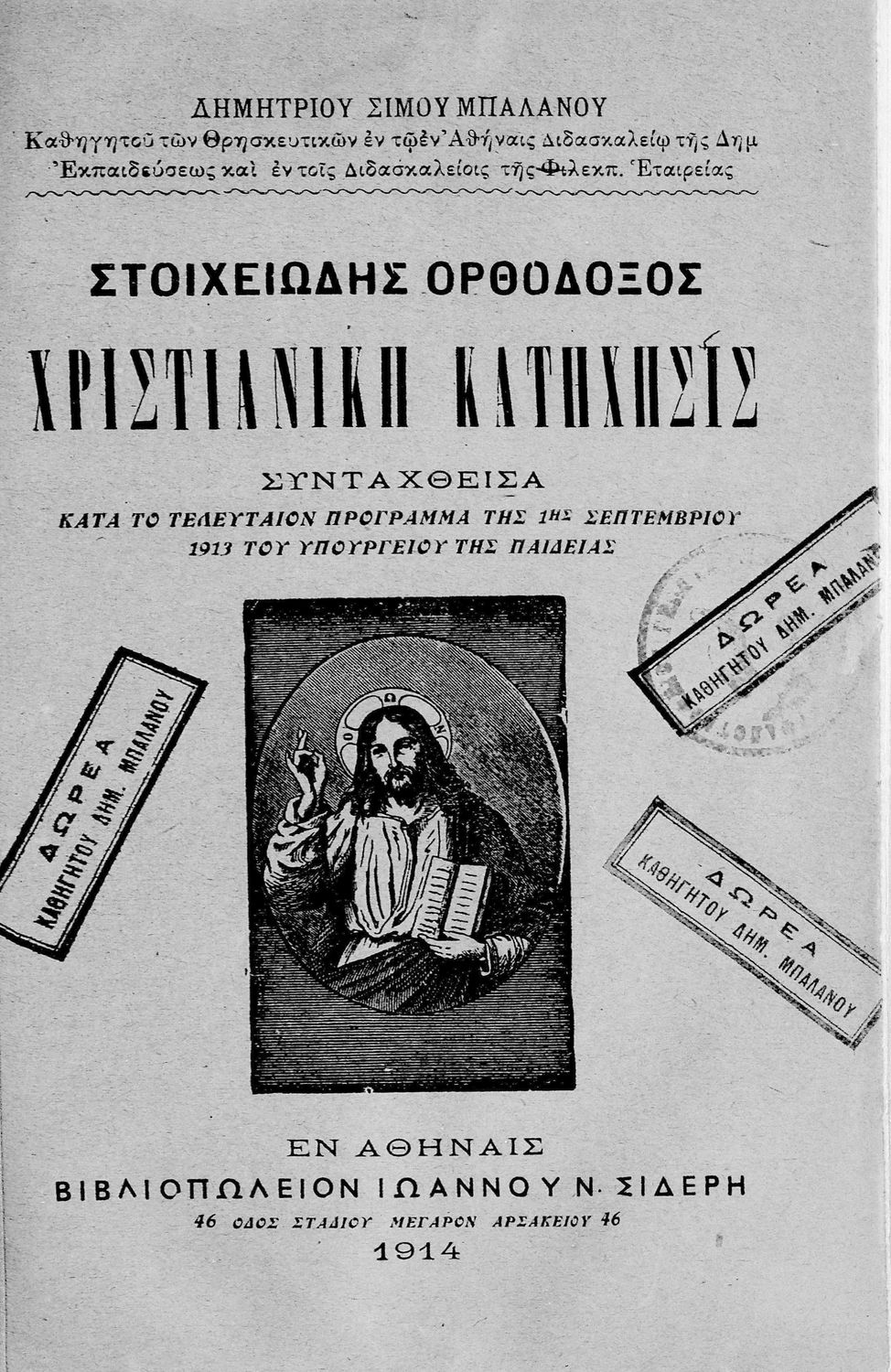 Κωδικός αναγνώρισης: 09-14264 Τίτλος: Στοιχειώδης ορθόδοξος χριστιανική κατήχησις συνταχθείσα κατά το τελευταίον πρόγραμμα της 1ης Σεπτεμβρίου 1913 του υπουργείου της παιδείας Συγγραφέας: Δημήτριος Σίμος Μπαλάνος Μέγεθος και υπόστρωμα: Σχολικό εγχειρίδιο, σκληρό εξώφυλλο, 53 σελίδες. |