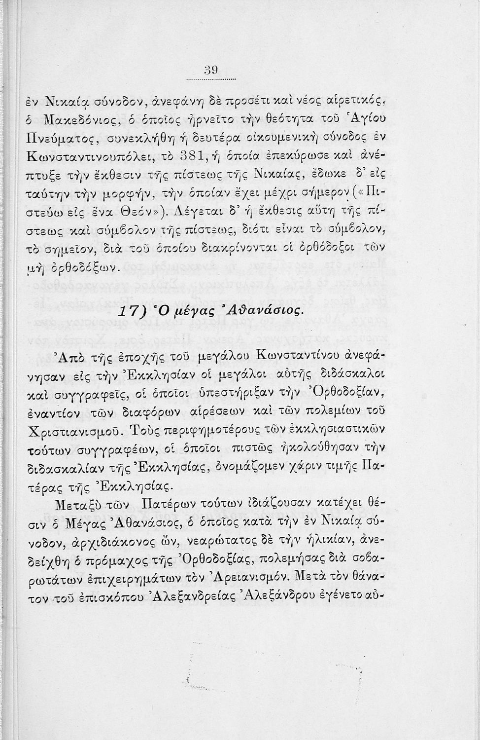 Βαθμίδα εκπαίδευσης: Πρωτοβάθμια Μάθημα: Θρησκευτικά Γλώσσα: Καθαρεύουσα Παρουσίαση περιεχομένου: Σχολικό εγχειρίδιο για τις τάξεις του Γυμνασίου για το μάθημα των Θρησκευτικών. Το εγχειρίδιο περιλαμβάνει εισαγωγικά γενικές πληροφορίες για την εκκλησιαστική ιστορία και ο κύριος κορμός του βιβλίου αποτελείται από 4 περιόδους. Η πρώτη περίοδος ασχολείται με την ιστορία της εκκλησίας μέχρι τον Μέγα Κωνσταντίνο, η δεύτερη περίοδος από τα χρόνια του Μεγάλου Κωνσταντίνου μέχρι και το σχίσμα του 860 μ. Χ. Η τρίτη περίοδος εκτείνεται από το 860 μ. Χ. μέχρι και την άλωση της Κωνσταντινούπολης από τους Τούρκους, το 1453 μ. Χ., και η τελευταία περίοδος περιλαμβάνει τα γεγονότα από το 1453 μ. Χ., μέχρι και το 1880 και την ιστορία της δυτικής εκκλησίας κατά τους νεώτερους χρόνους. |