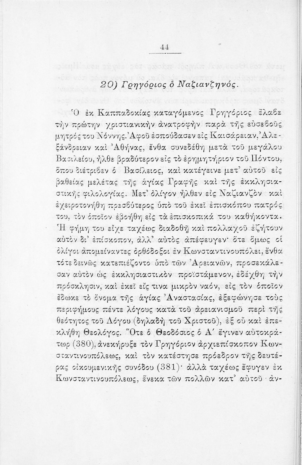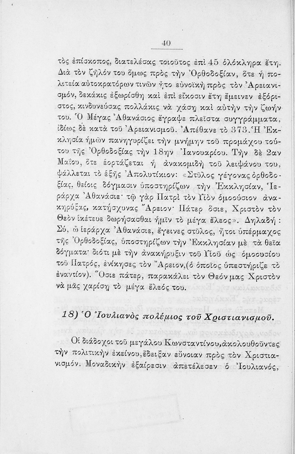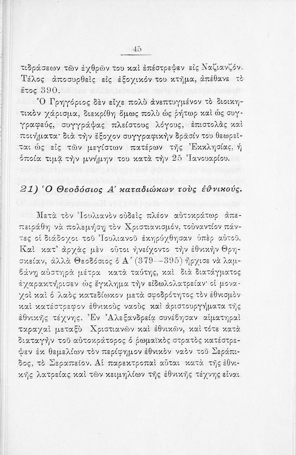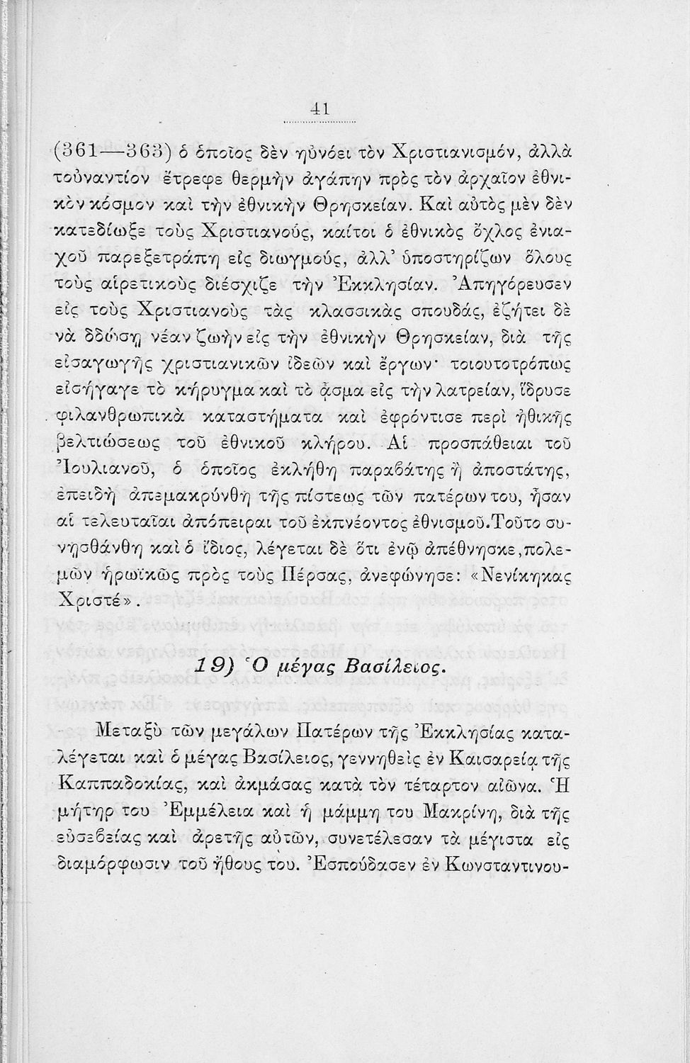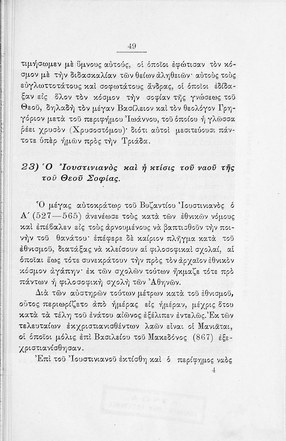 520 ## _aΣχολικό εγχειρίδιο για τις τάξεις του Γυμνασίου για το μάθημα των Θρησκευτικών. Το εγχειρίδιο περιλαμβάνει εισαγωγικά γενικές πληροφορίες για την εκκλησιαστική ιστορία και ο κύριος κορμός του βιβλίου αποτελείται από 4 περιόδους. Η πρώτη περίοδος ασχολείται με την ιστορία της εκκλησίας μέχρι τον Μέγα Κωνσταντίνο, η δεύτερη περίοδος από τα χρόνια του Μεγάλου Κωνσταντίνου μέχρι και το σχίσμα του 860 μ. Χ. Η τρίτη περίοδος εκτείνεται από το 860 μ. Χ. μέχρι και την άλωση της Κωνσταντινούπολης από τους Τούρκους, το 1453 μ. Χ., και η τελευταία περίοδος περιλαμβάνει τα γεγονότα από το 1453 μ. Χ., μέχρι και το 1880 και την ιστορία της δυτικής εκκλησίας κατά τους νεώτερους χρόνους.