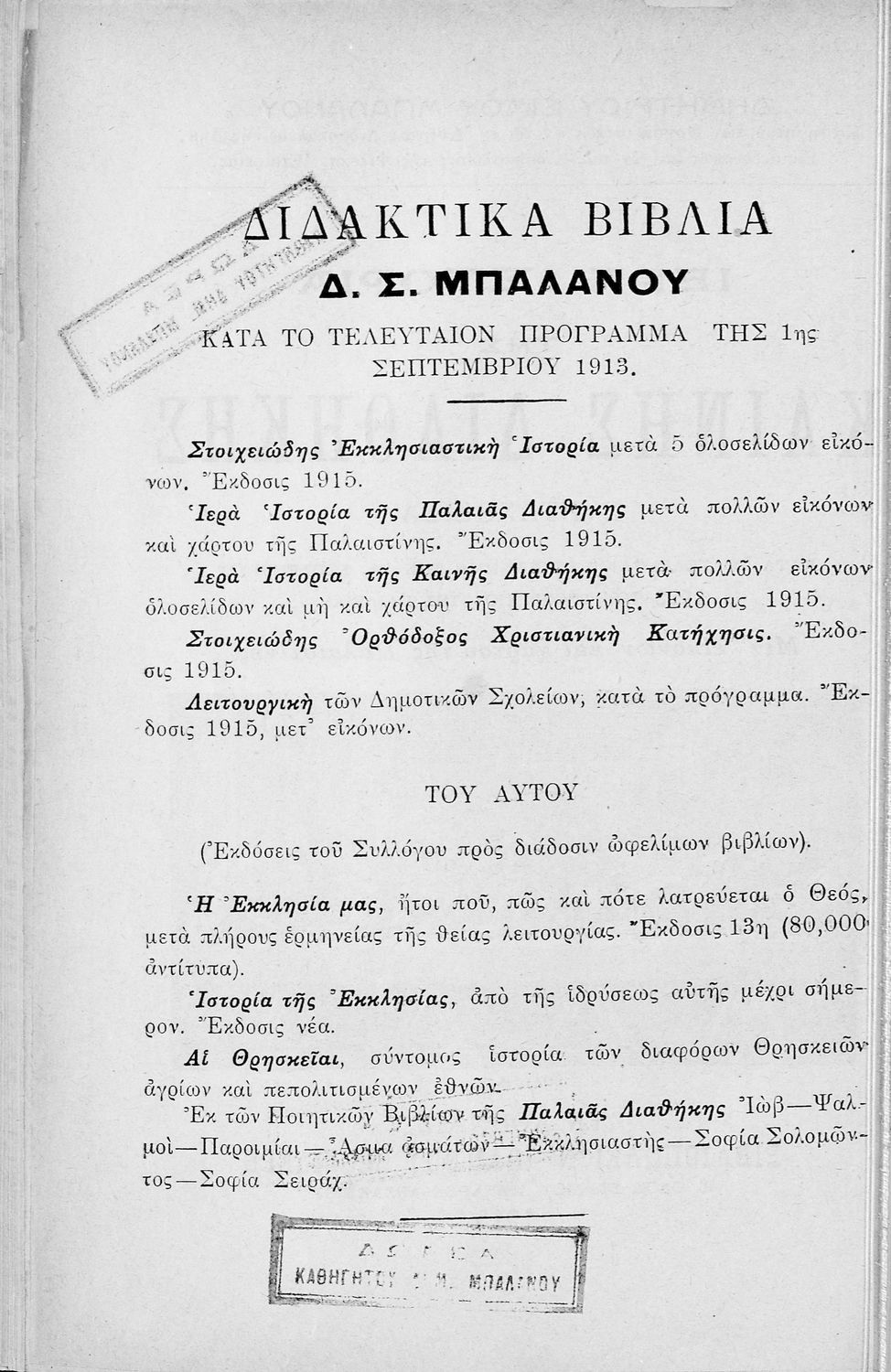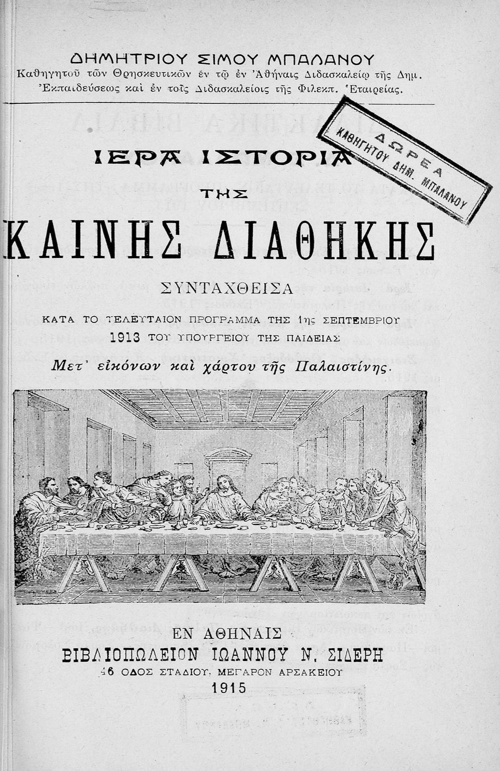 Κωδικός αναγνώρισης: 09-14266 Τίτλος: Ιερά ιστορία της Καινής Διαθήκης συνταχθείσα κατά το τελευταίον πρόγραμμα της 1ης Σεπτεμβρίου 1913 του υπουργείου της παιδείας μετ' εικόνων και χάρτου Παλαιστίνης Συγγραφέας: Δημήτριος Σίμος Μπαλάνος Μέγεθος και υπόστρωμα: Μαθητικό βοήθημα, μαλακό εξώφυλλο, 69 σελίδες. Σκίτσα (ασπρόμαυρα), χάρτες (ασπρόμαυροι). |