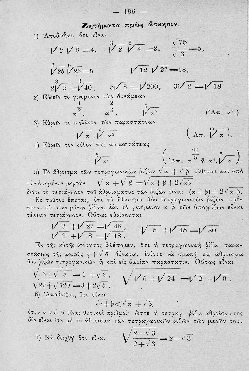 Σχολικό εγχειρίδιο για τις τάξεις του Γυμνασίου για το μάθημα των Μαθηματικών και συγκεκριμένα της Άλγεβρας. Το εγχειρίδιο περιλαμβάνει εισαγωγικά γενικές πληροφορίες για τις 4 βασικές πράξεις συνεχίζει με τις αλγεβρικές παραστάσεις, εξισώσεις πρώτου και δευτέρου βαθμού, δυνάμεις και πολυώνυμα, πρόοδοι, λογάριθμοι, κ.α.