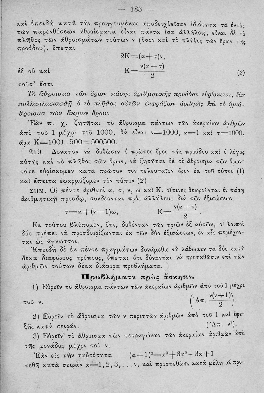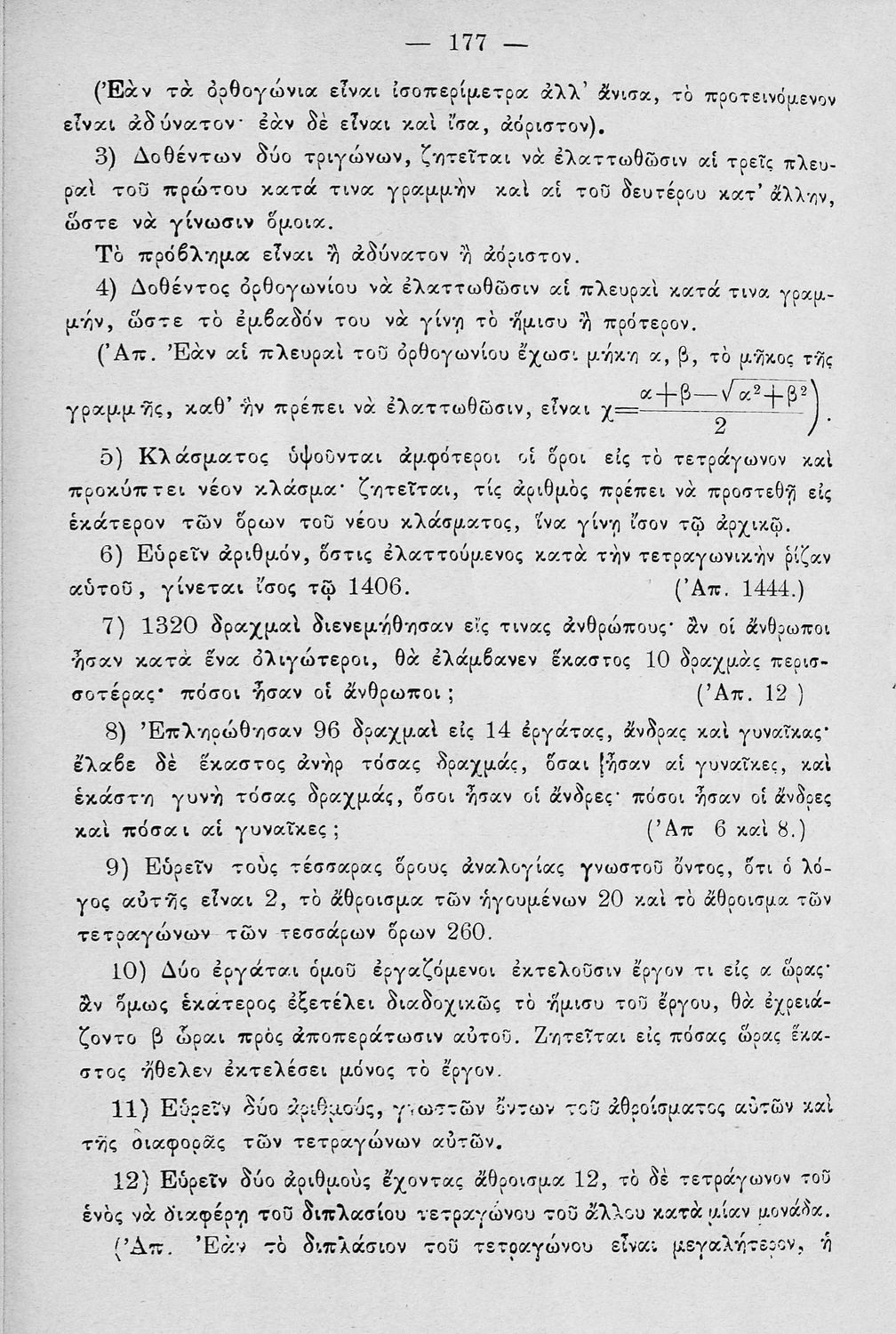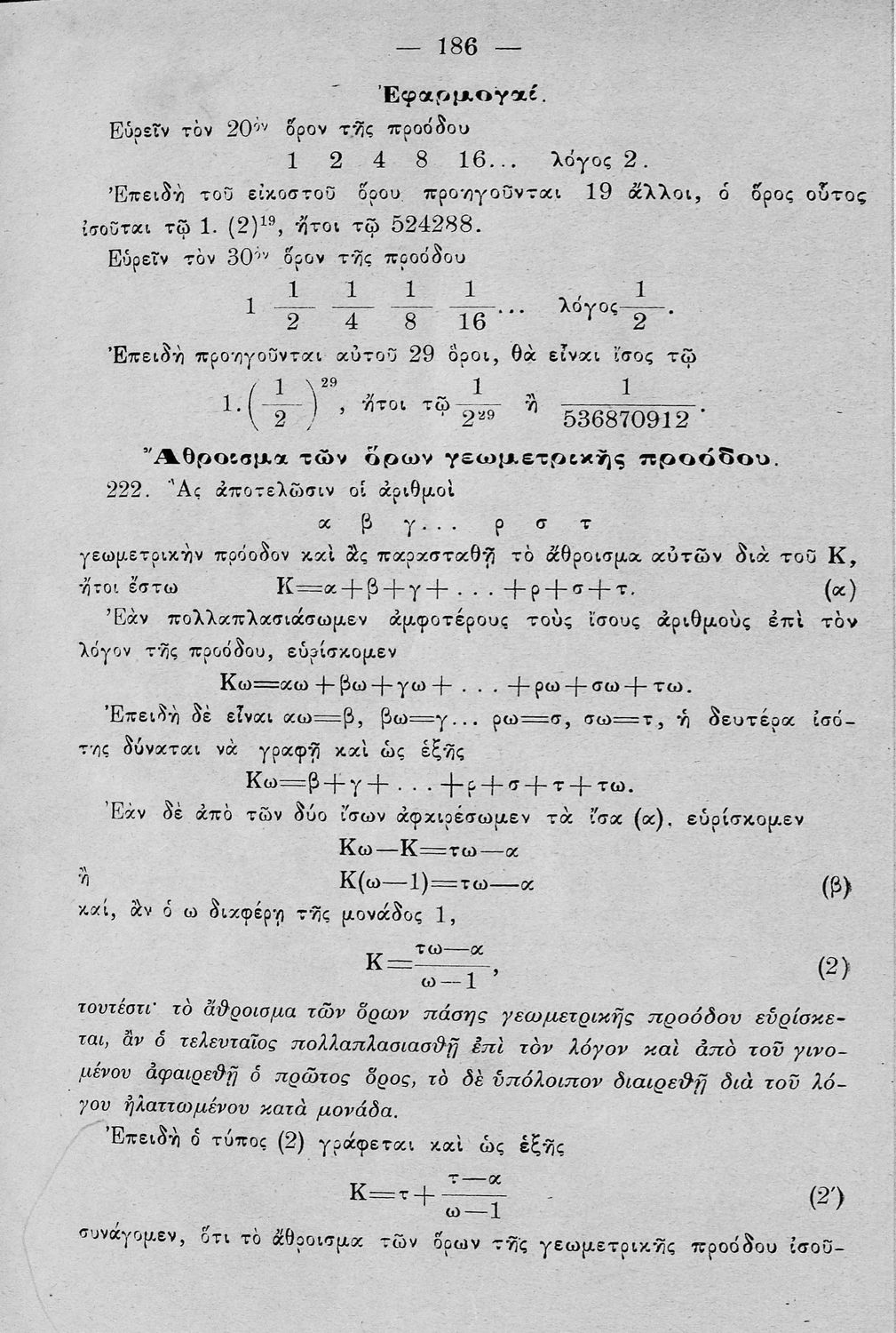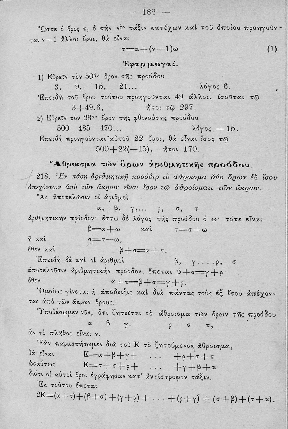 Βαθμίδα εκπαίδευσης: Δευτεροβάθμια Τάξη: Γυμνάσιο Μάθημα: Μαθηματικά Γλώσσα: Καθαρεύουσα Παρουσίαση περιεχομένου: Σχολικό εγχειρίδιο για τις τάξεις του Γυμνασίου για το μάθημα των Μαθηματικών και συγκεκριμένα της Άλγεβρας. Το εγχειρίδιο περιλαμβάνει εισαγωγικά γενικές πληροφορίες για τις 4 βασικές πράξεις συνεχίζει με τις αλγεβρικές παραστάσεις, εξισώσεις πρώτου και δευτέρου βαθμού, δυνάμεις και πολυώνυμα, πρόοδοι, λογάριθμοι, κ.α. |